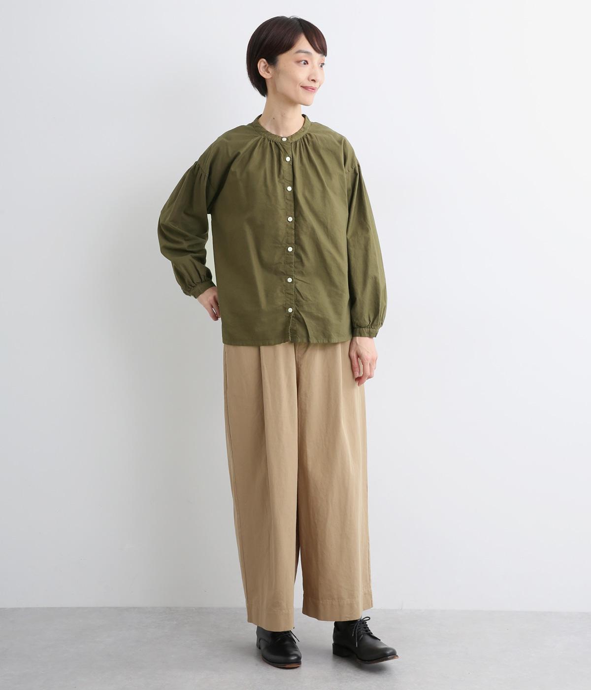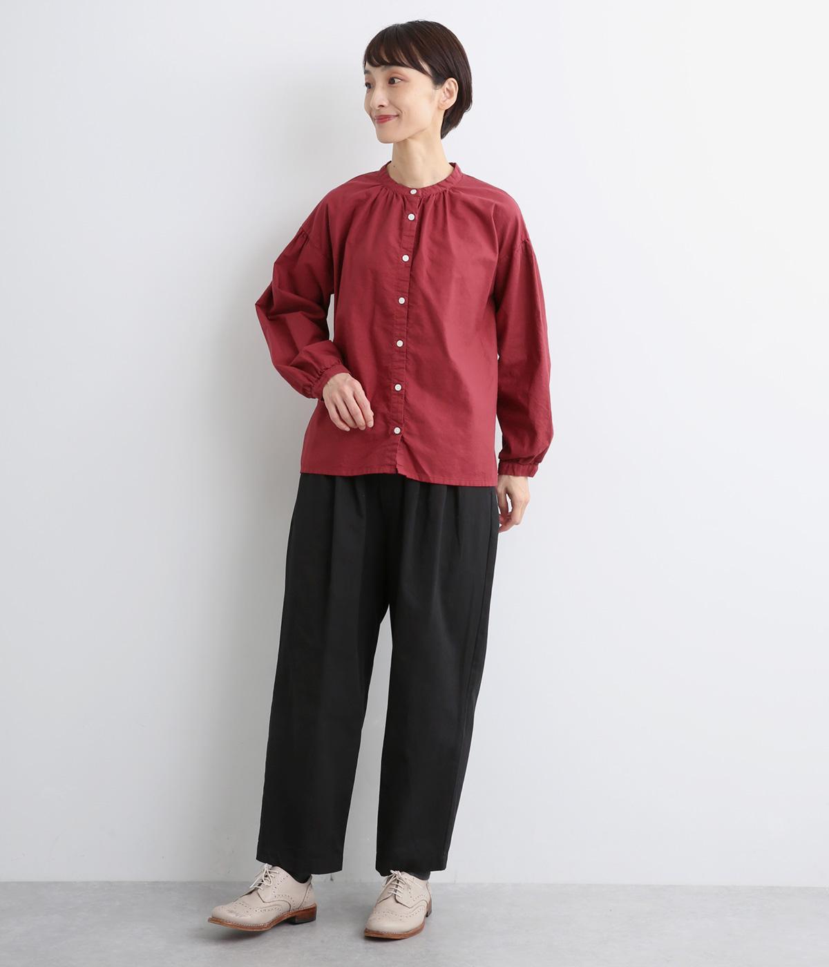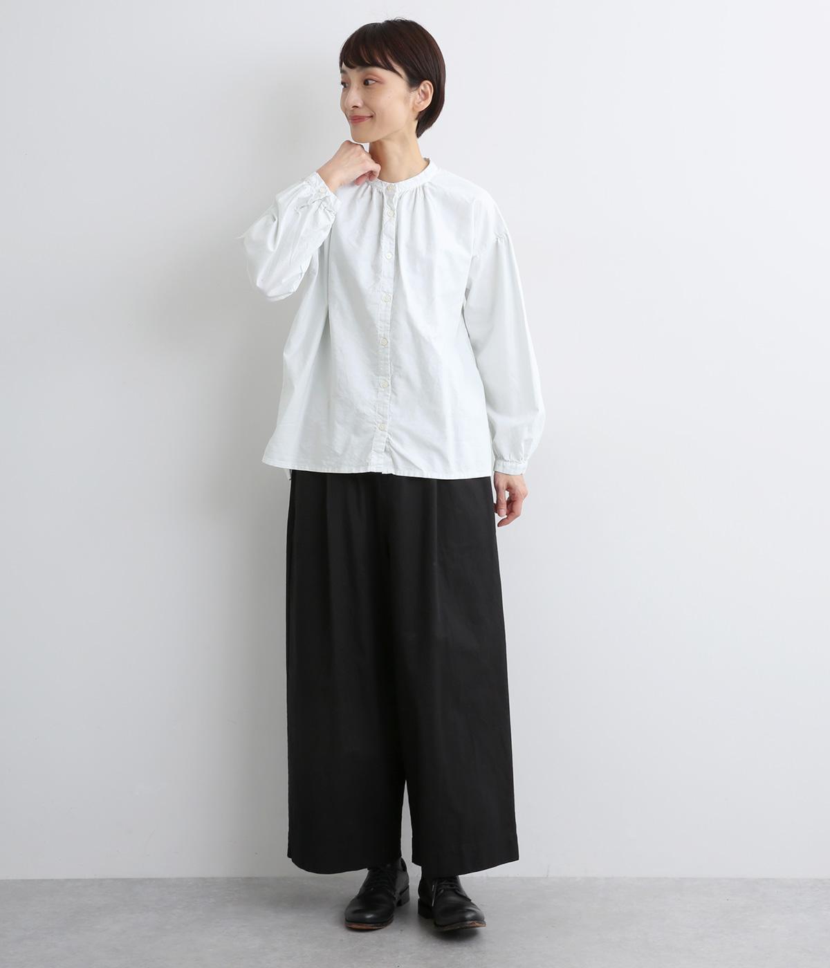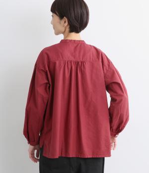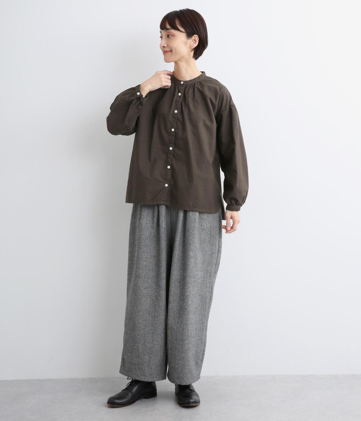 きちんと感漂うバンドカラーブラウスの前ネックや後ろヨーク、袖にギャザーを施して甘さを加えました。ふんわりとしたシルエットが体のラインをカバーしてくれます。着丈に前後差をつけて裾にはサイドスリットを入れ、美しい横姿に。羽織りとして活用するのもおすすめです。