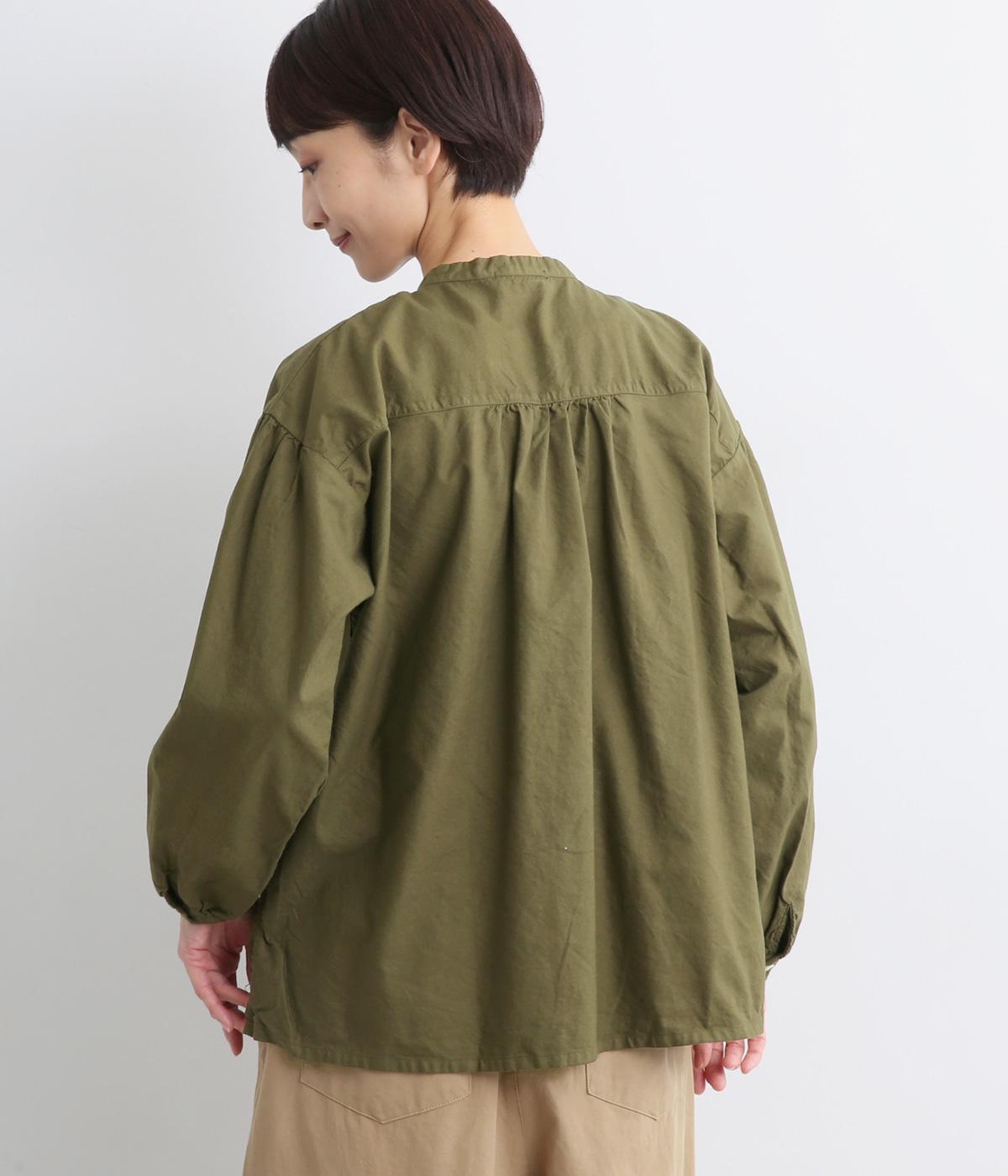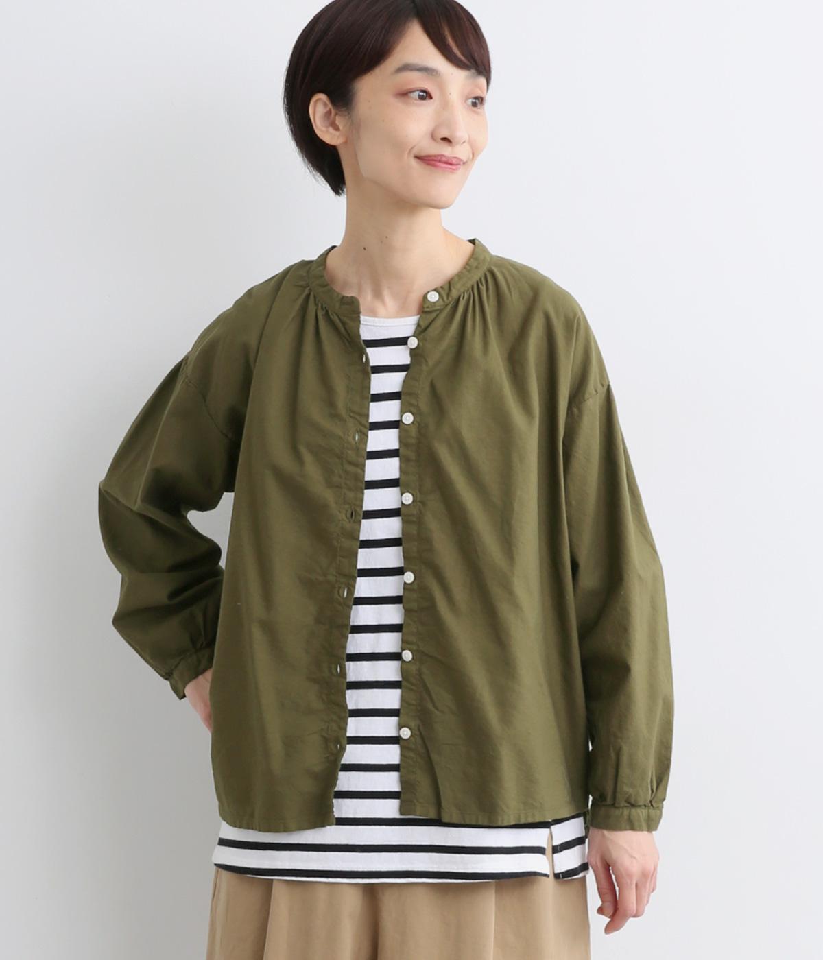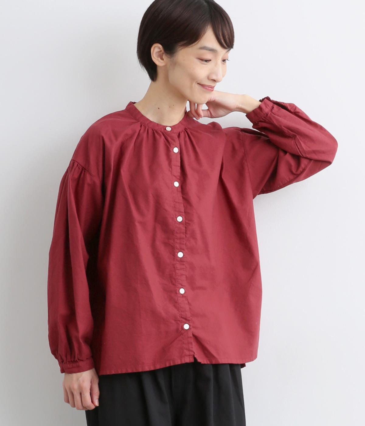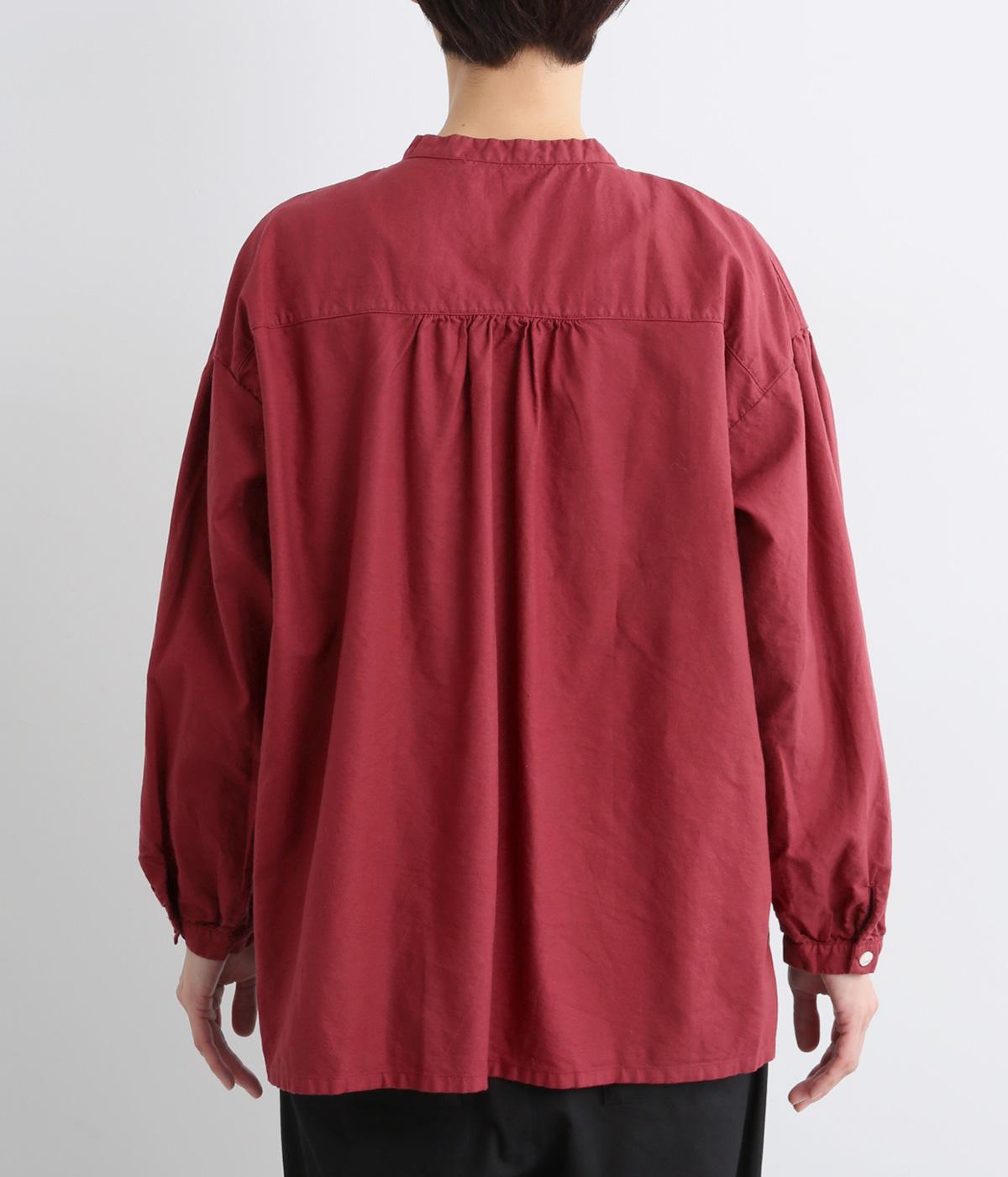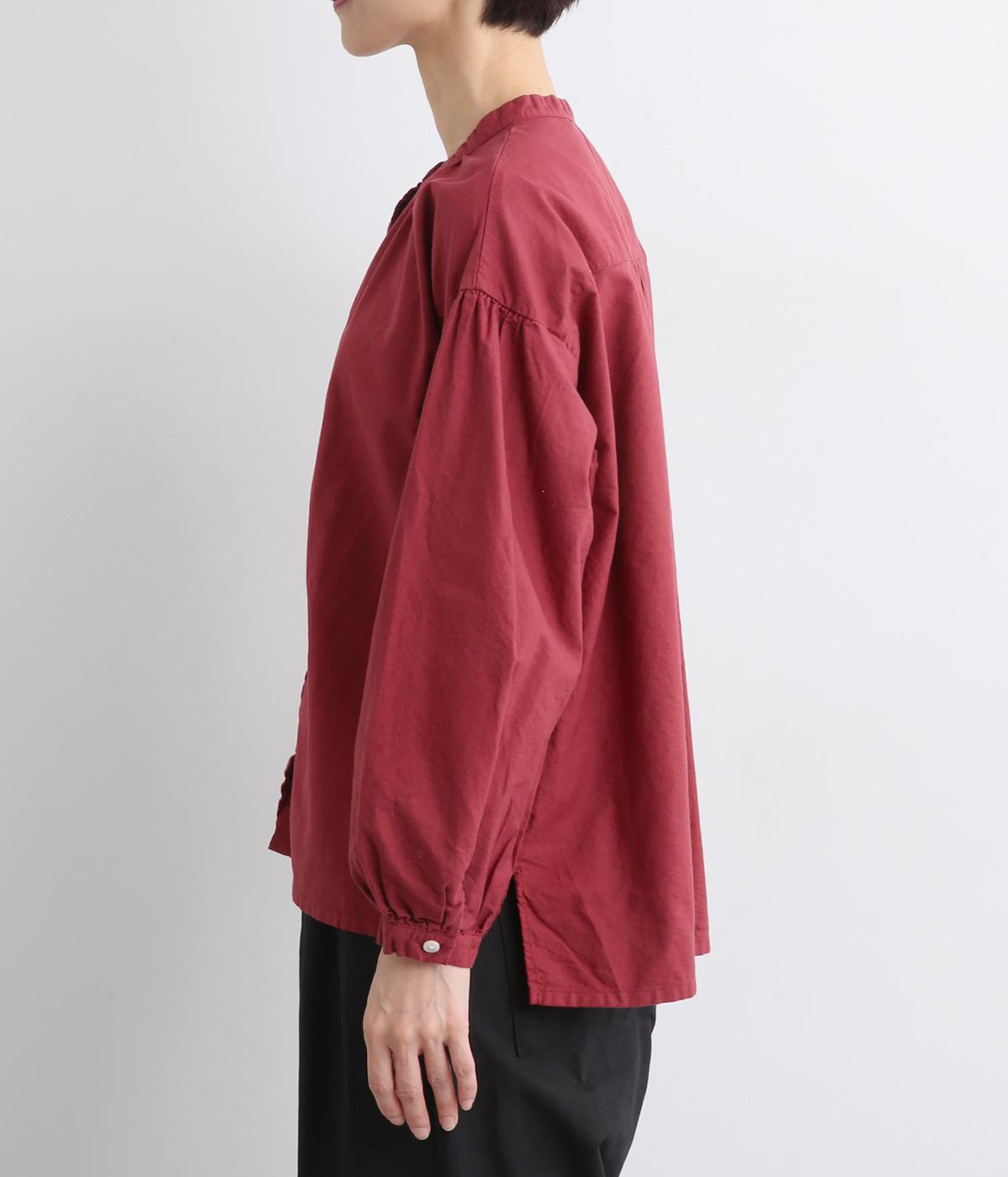きちんと感漂うバンドカラーブラウスの前ネックや後ろヨーク、袖にギャザーを施して甘さを加えました。ふんわりとしたシルエットが体のラインをカバーしてくれます。着丈に前後差をつけて裾にはサイドスリットを入れ、美しい横姿に。羽織りとして活用するのもおすすめです。