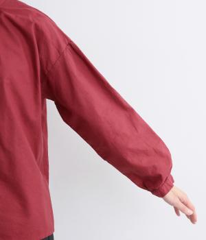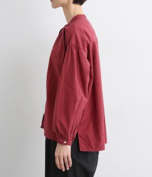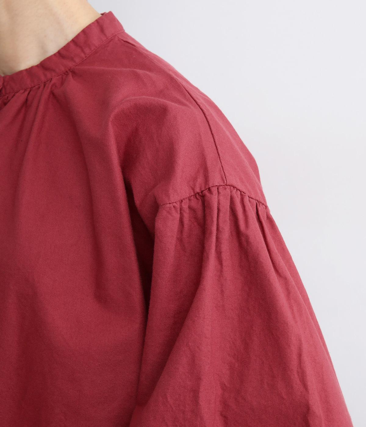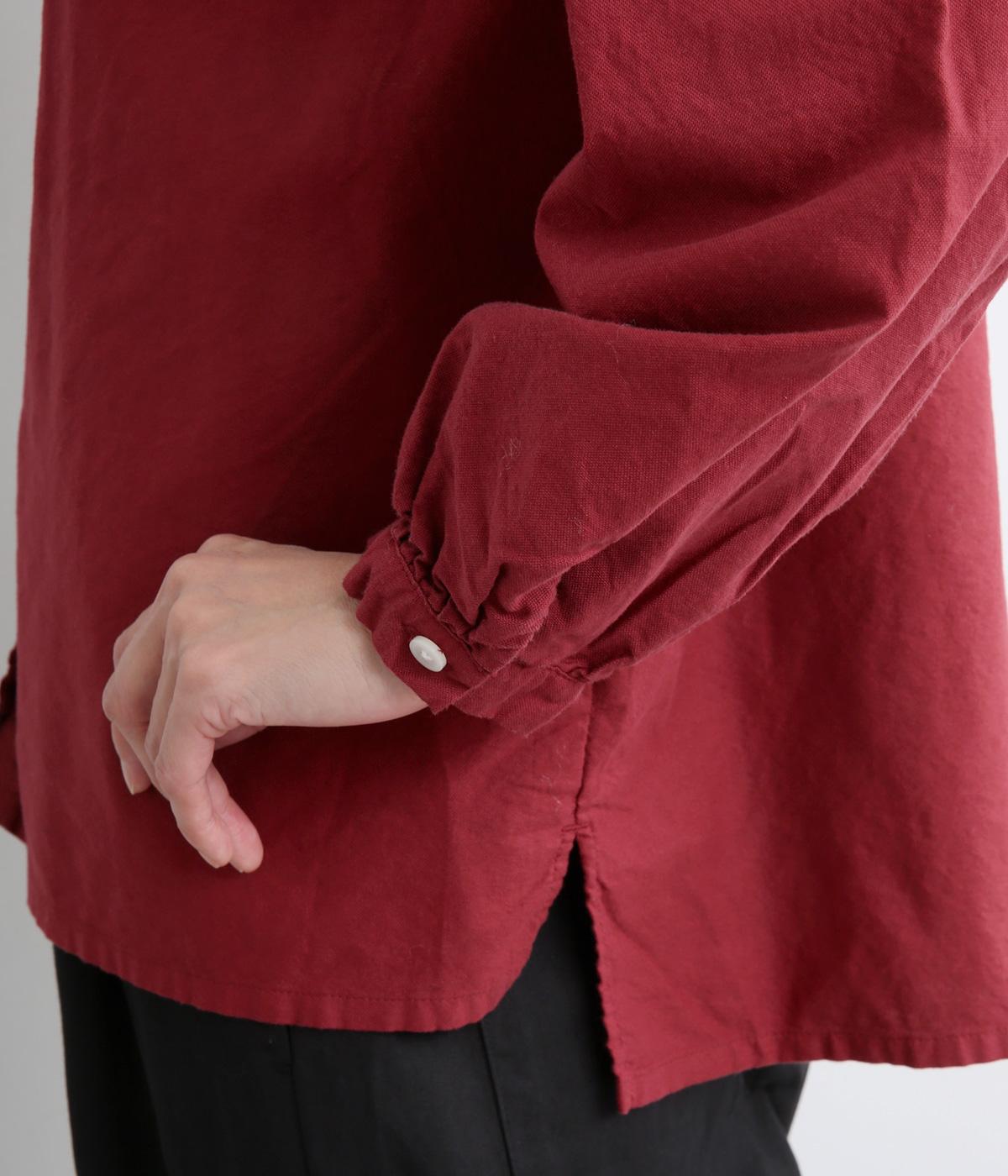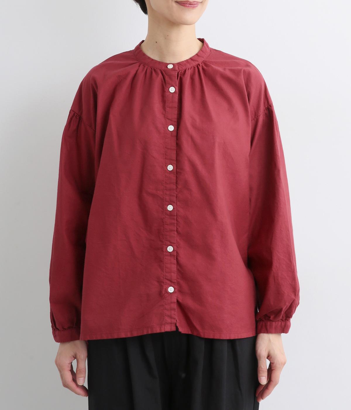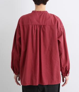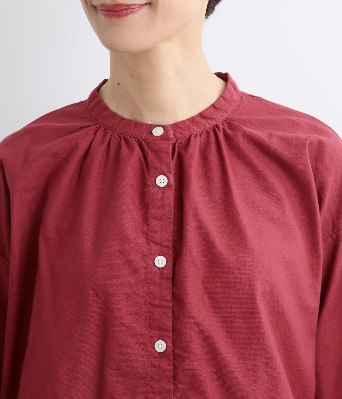 きちんと感漂うバンドカラーブラウスの前ネックや後ろヨーク、袖にギャザーを施して甘さを加えました。ふんわりとしたシルエットが体のラインをカバーしてくれます。着丈に前後差をつけて裾にはサイドスリットを入れ、美しい横姿に。羽織りとして活用するのもおすすめです。