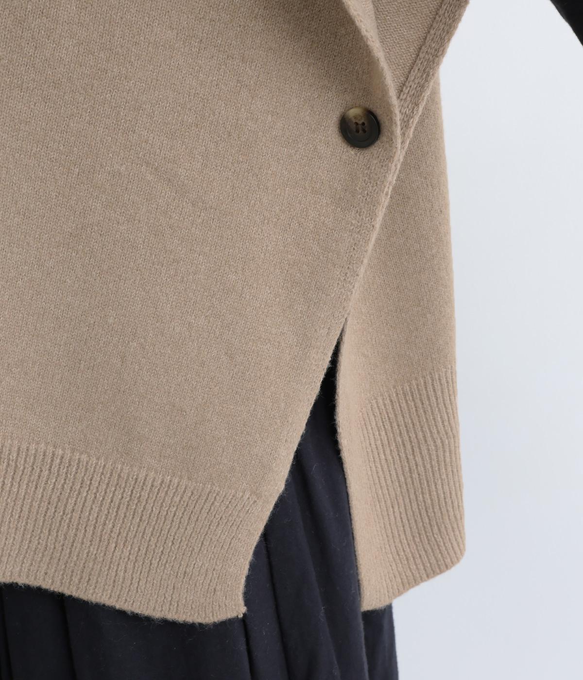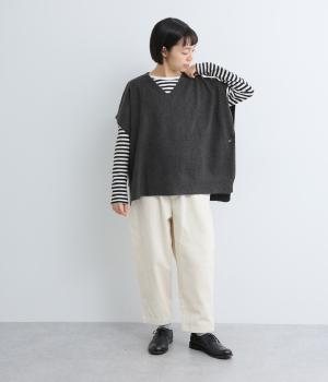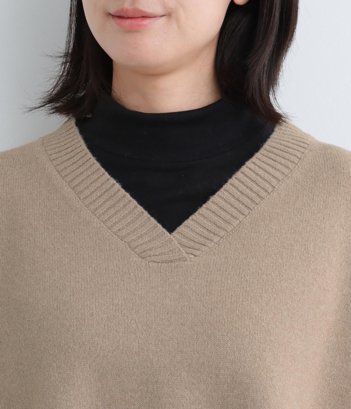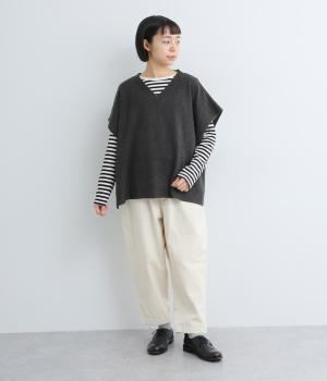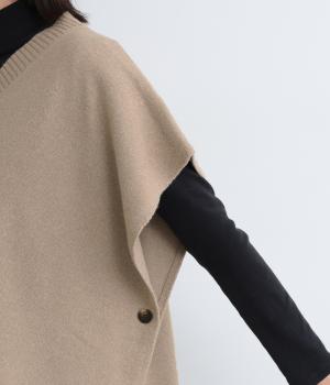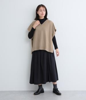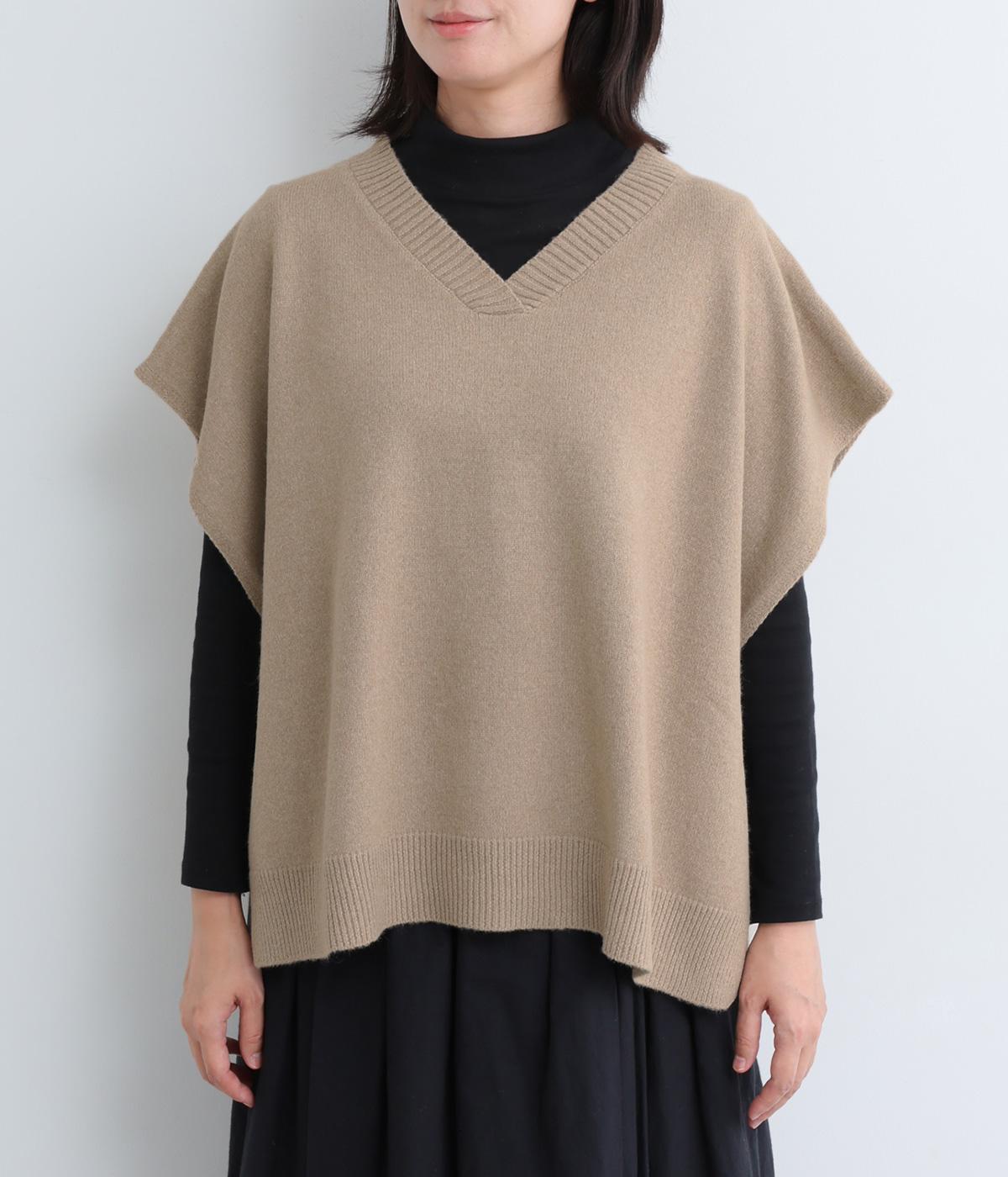 ゆったりとしたポンチョタイプのニットベスト。あきが広いのでボリュームトップスやワンピースとも合わせやすく、手持ちのアイテムもいつもとちがったスタイリングに魅せてくれます。裾の自然なドレープで動きも◎。