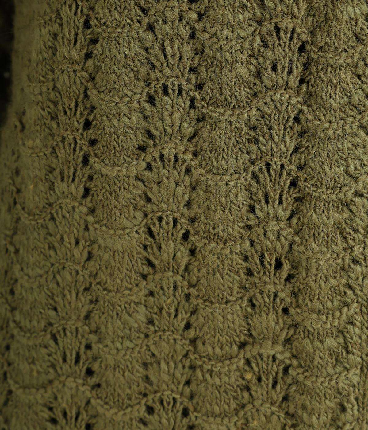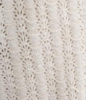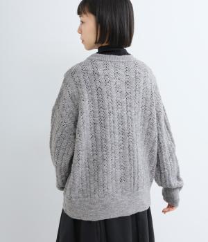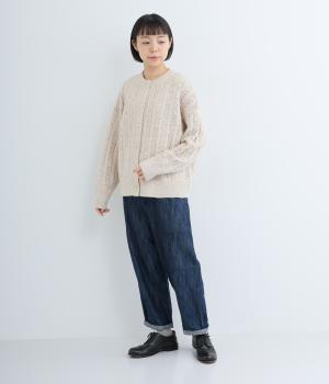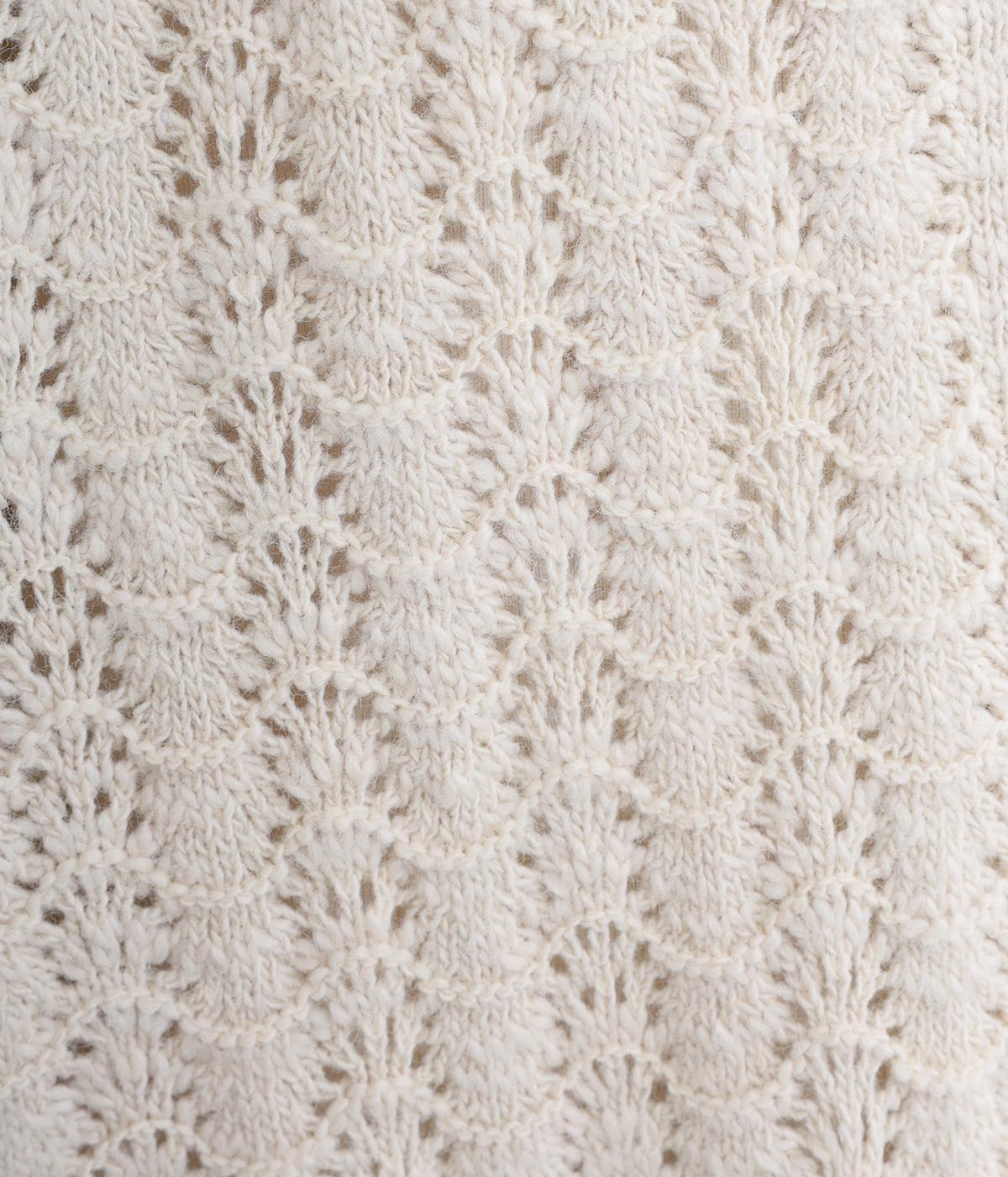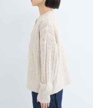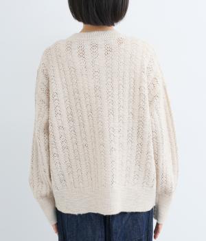 ソフトな肌ざわりが心地よいざっくり編みのニット素材。軽くて伸縮性があり、着脱しやすいのが魅力です。家庭で洗濯ができるので、気軽に着られるのも高ポイント。視覚的におもしろさのある編み方で仕上げました。