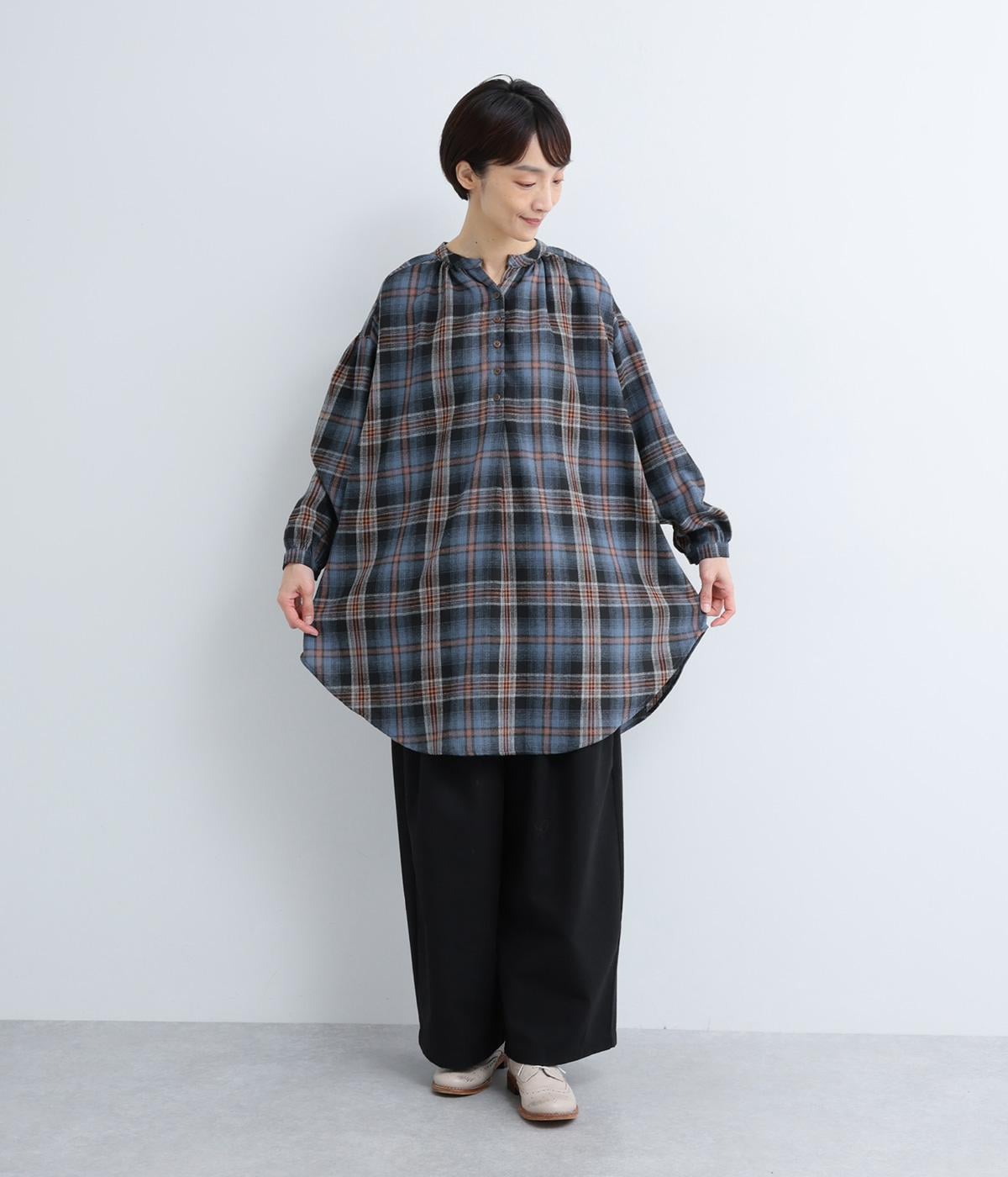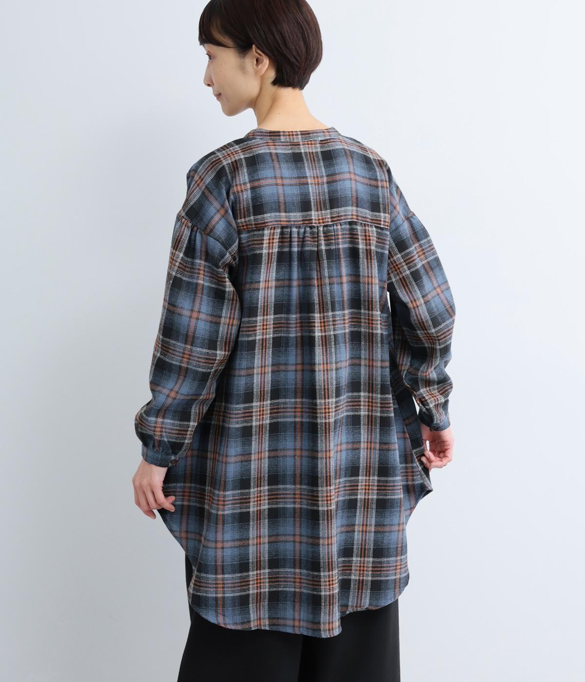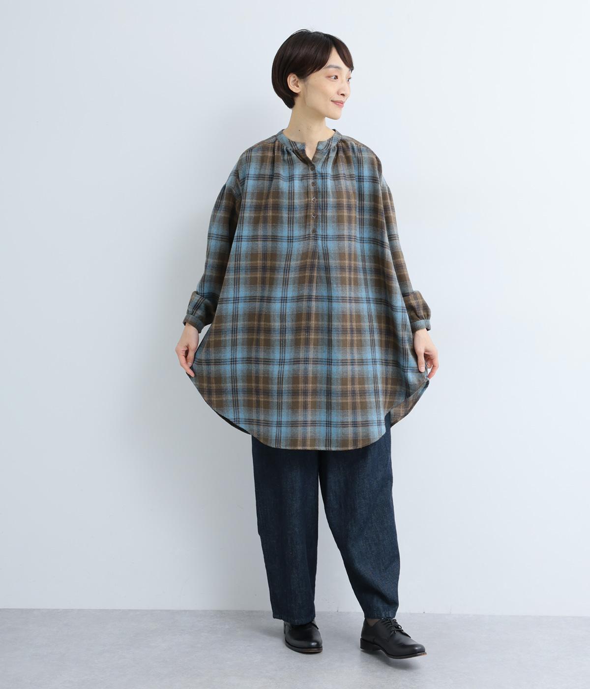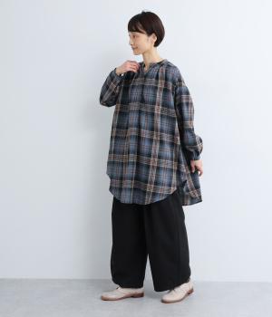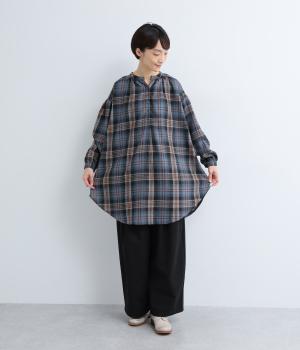 落ち着いた配色のチェック柄をあしらった長袖チュニックです。ゆるやかなVネックは抜け感を生みつつ、タートルネックなどのインナーとも相性ばつぐん。背面ヨークには細かなギャザーを寄せ、動くたびにふんわり広がるシルエットに仕立てました。ヒップまで隠れる丈感で、どんなボトムスともバランスよく合わせられます。