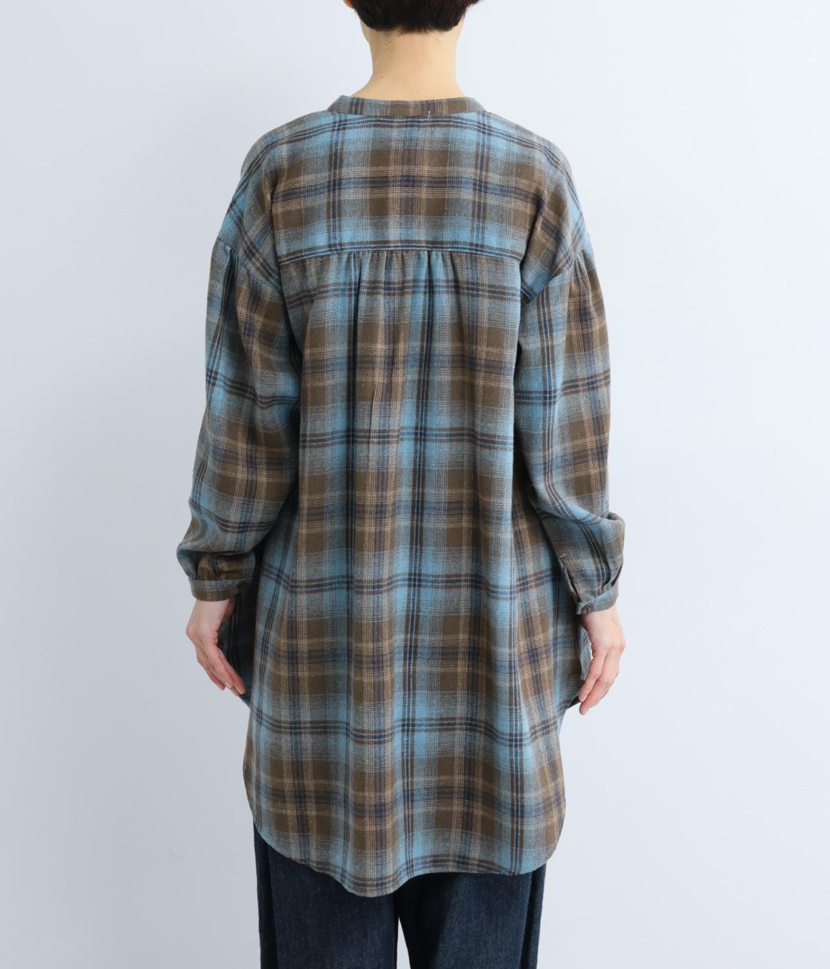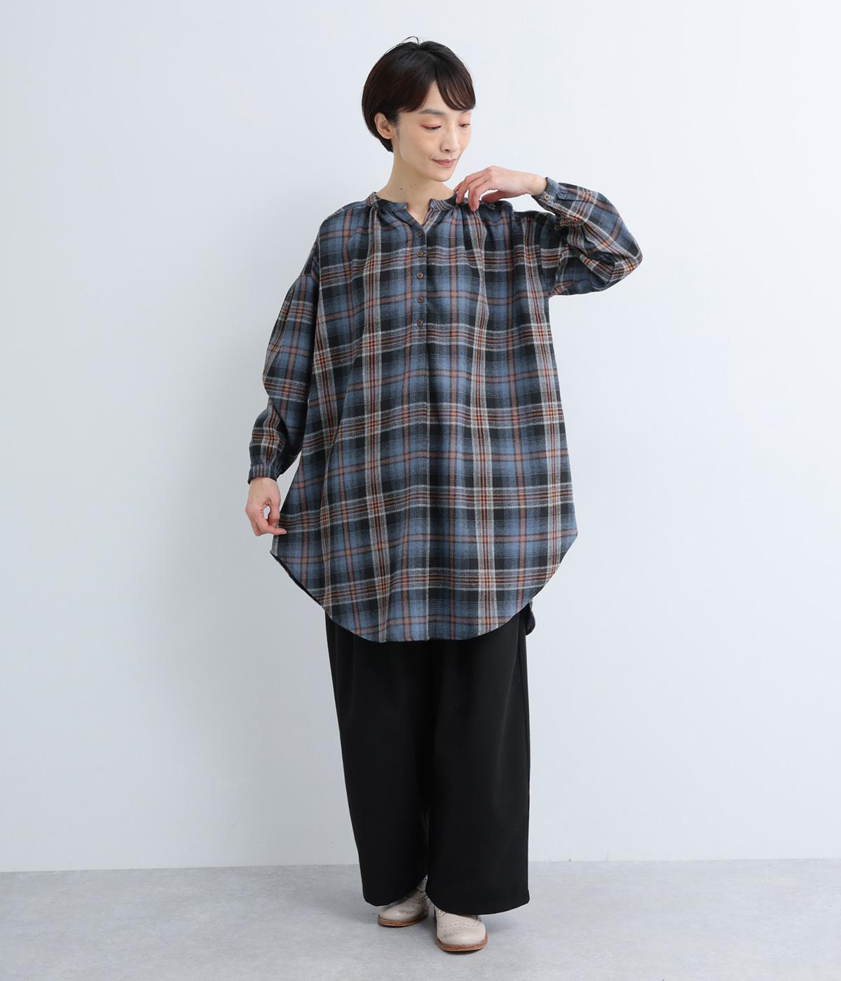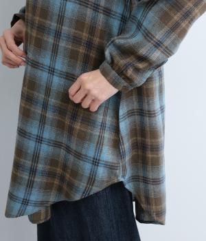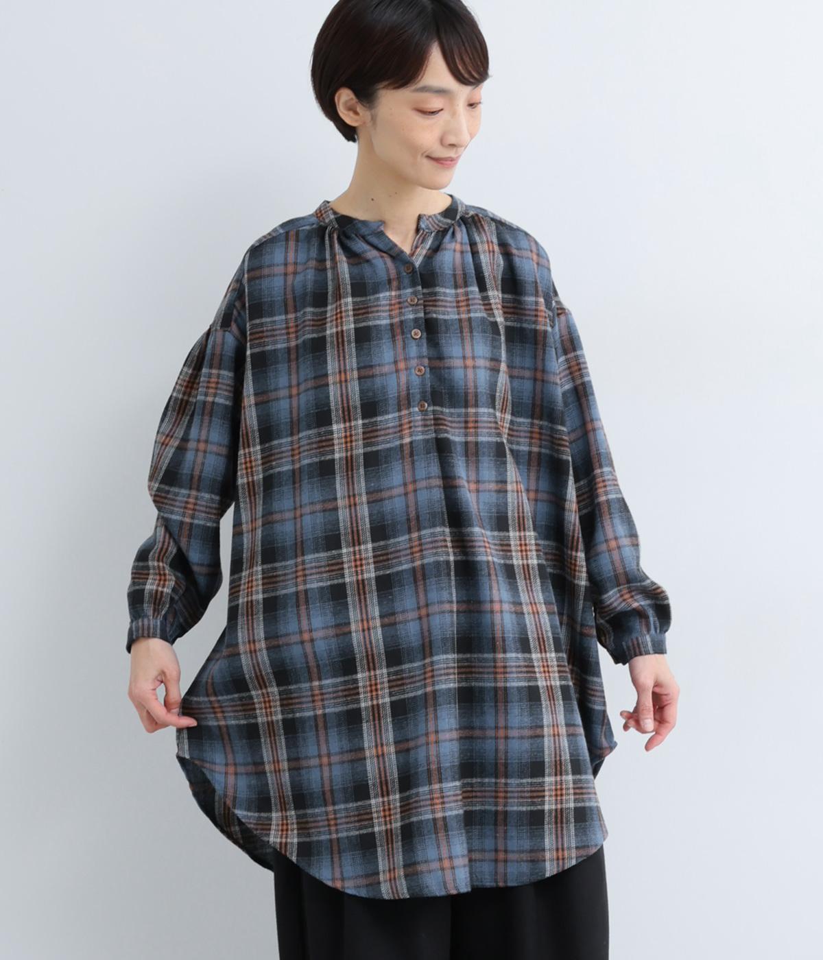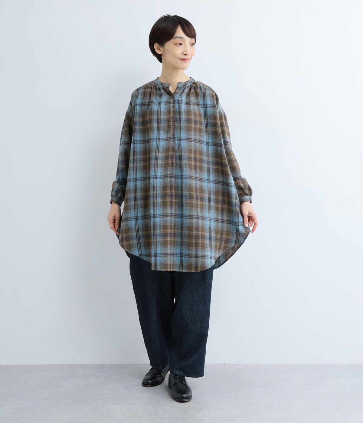 落ち着いた配色のチェック柄をあしらった長袖チュニックです。ゆるやかなVネックは抜け感を生みつつ、タートルネックなどのインナーとも相性ばつぐん。背面ヨークには細かなギャザーを寄せ、動くたびにふんわり広がるシルエットに仕立てました。ヒップまで隠れる丈感で、どんなボトムスともバランスよく合わせられます。