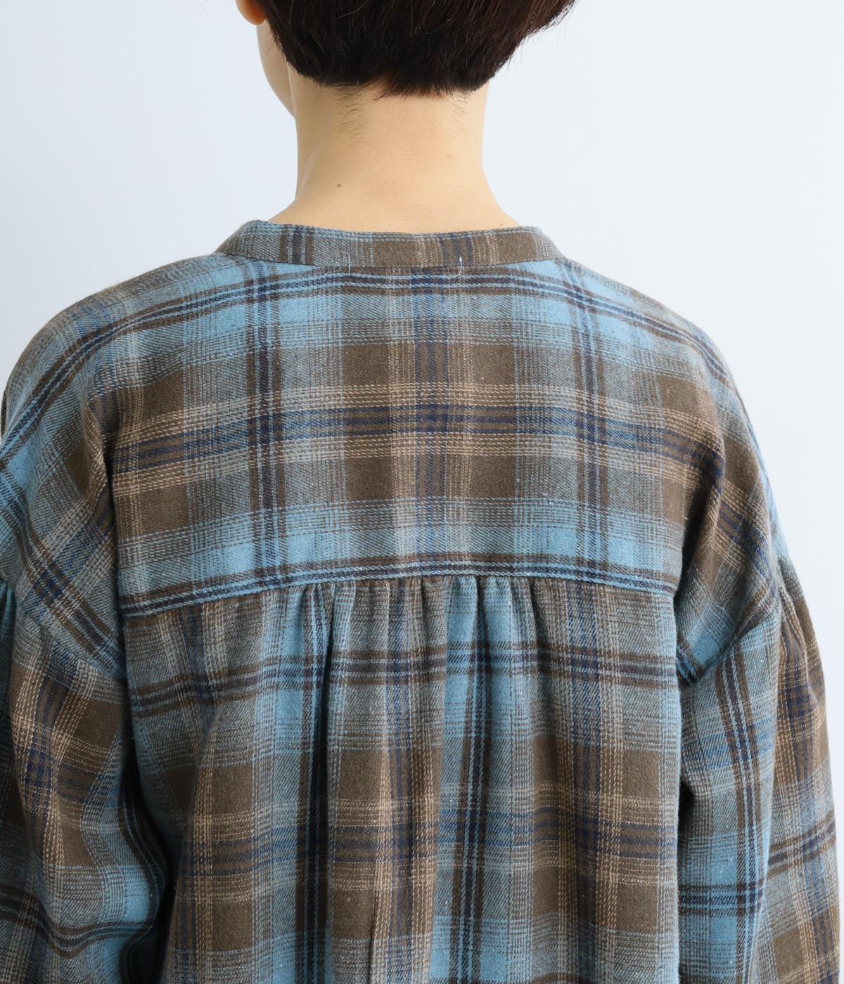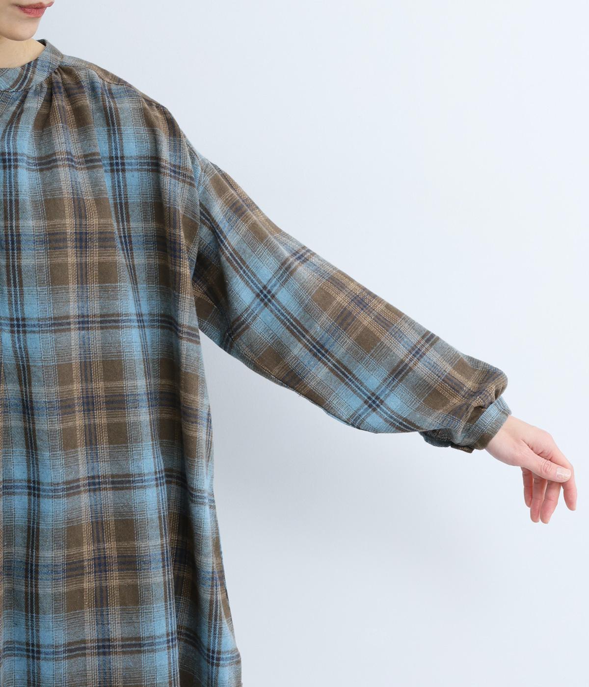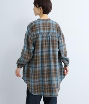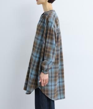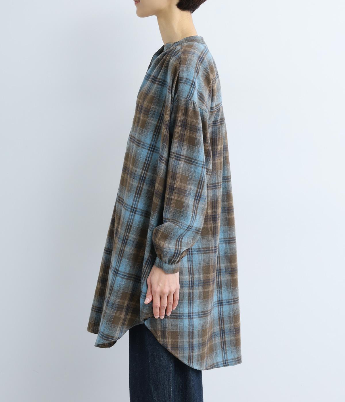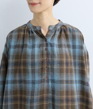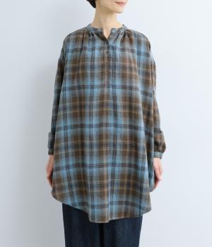 落ち着いた配色のチェック柄をあしらった長袖チュニックです。ゆるやかなVネックは抜け感を生みつつ、タートルネックなどのインナーとも相性ばつぐん。背面ヨークには細かなギャザーを寄せ、動くたびにふんわり広がるシルエットに仕立てました。ヒップまで隠れる丈感で、どんなボトムスともバランスよく合わせられます。