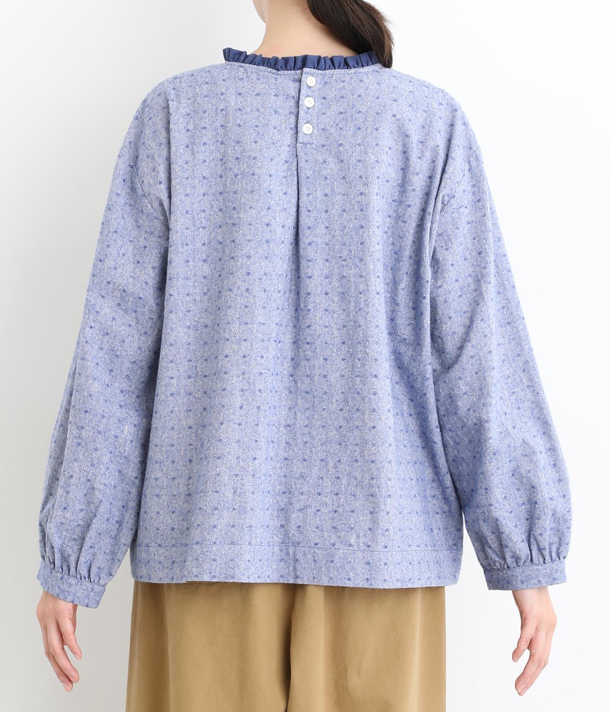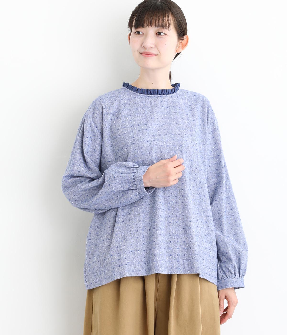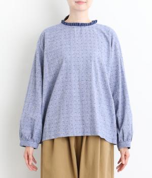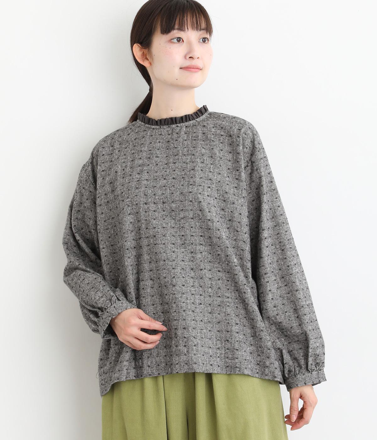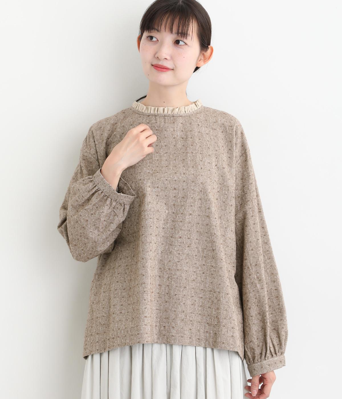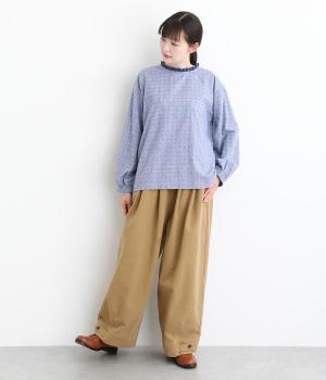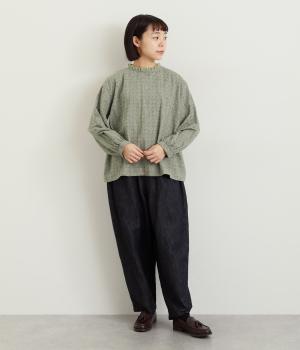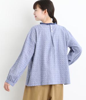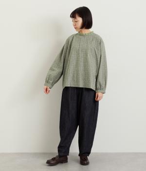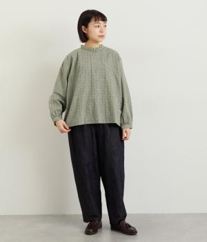 さりげない総柄刺しゅうが表情に奥行きを与えるブラウス。首元のフリルやゆったりしたシルエットが女性らしい雰囲気をつくります。ほどよい丈感でパンツスタイルにもスカートにもしっくりとなじみます。