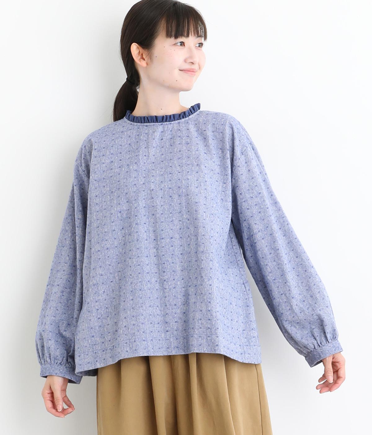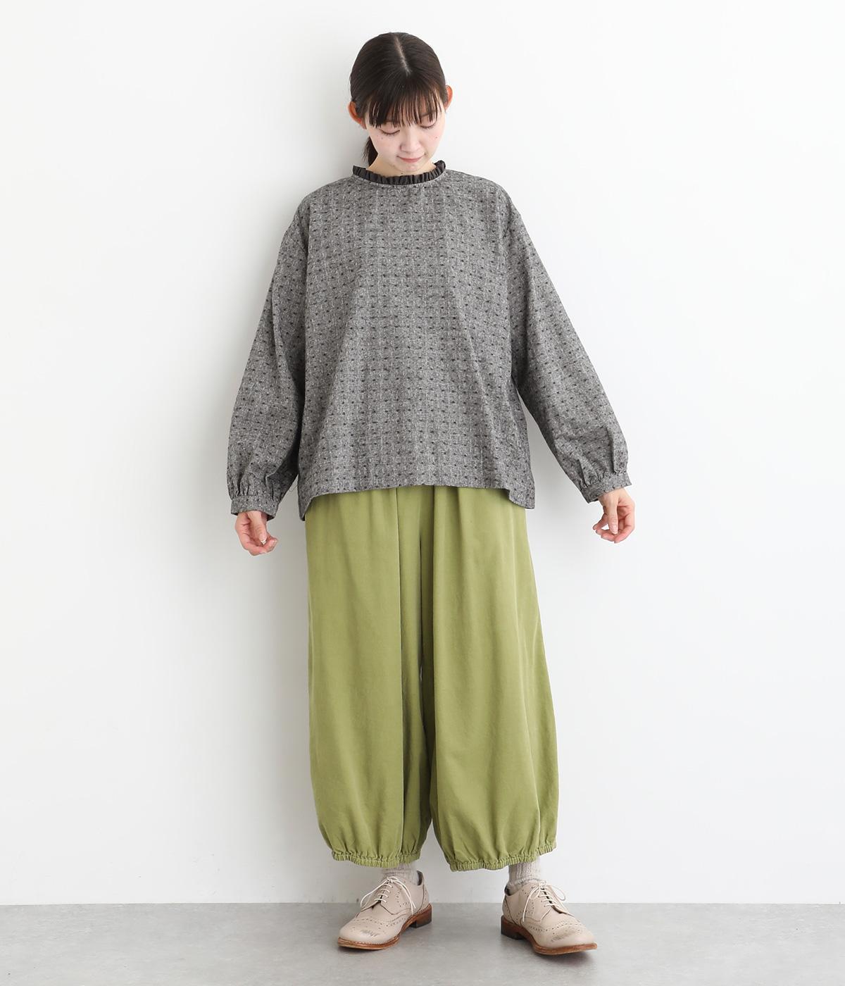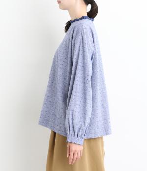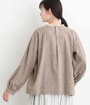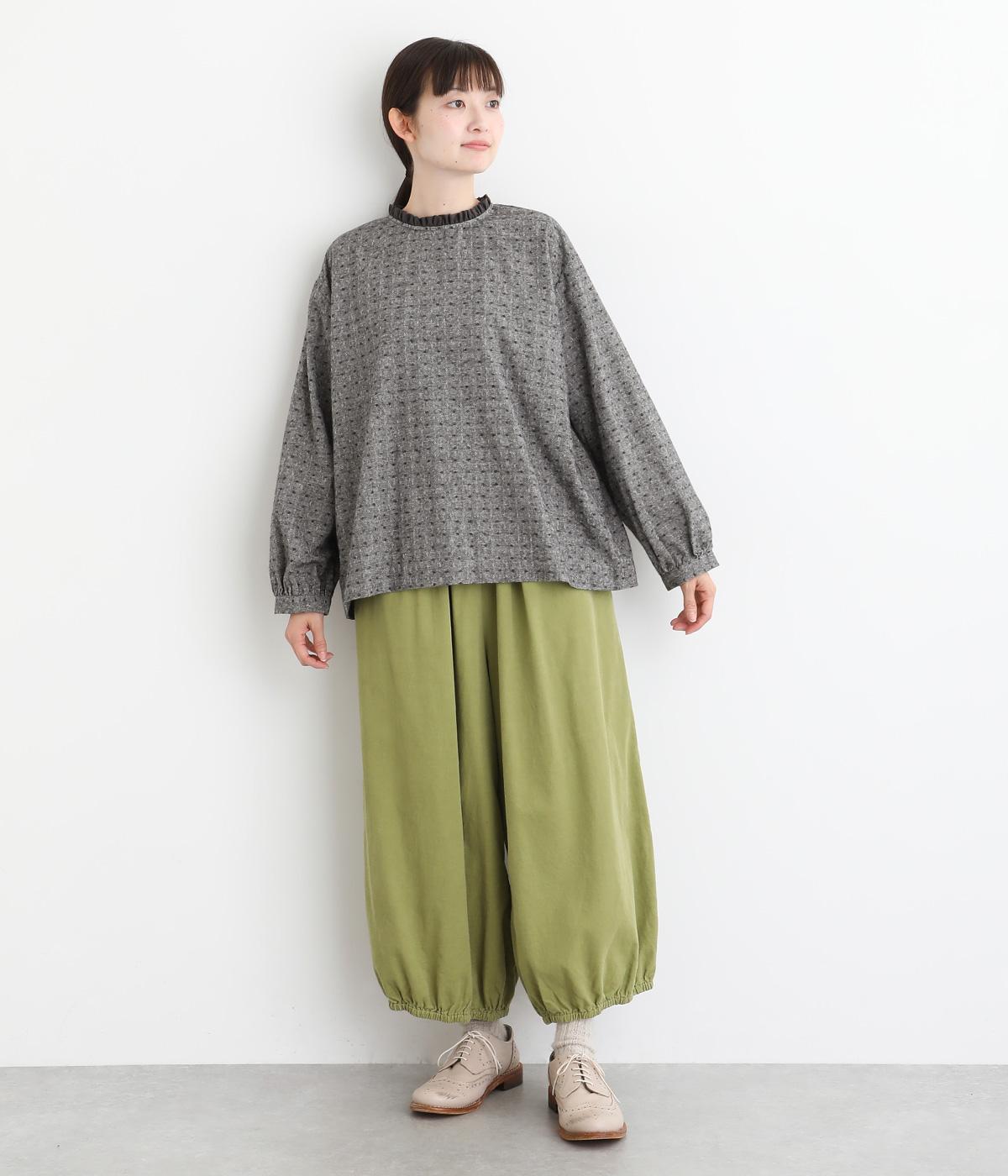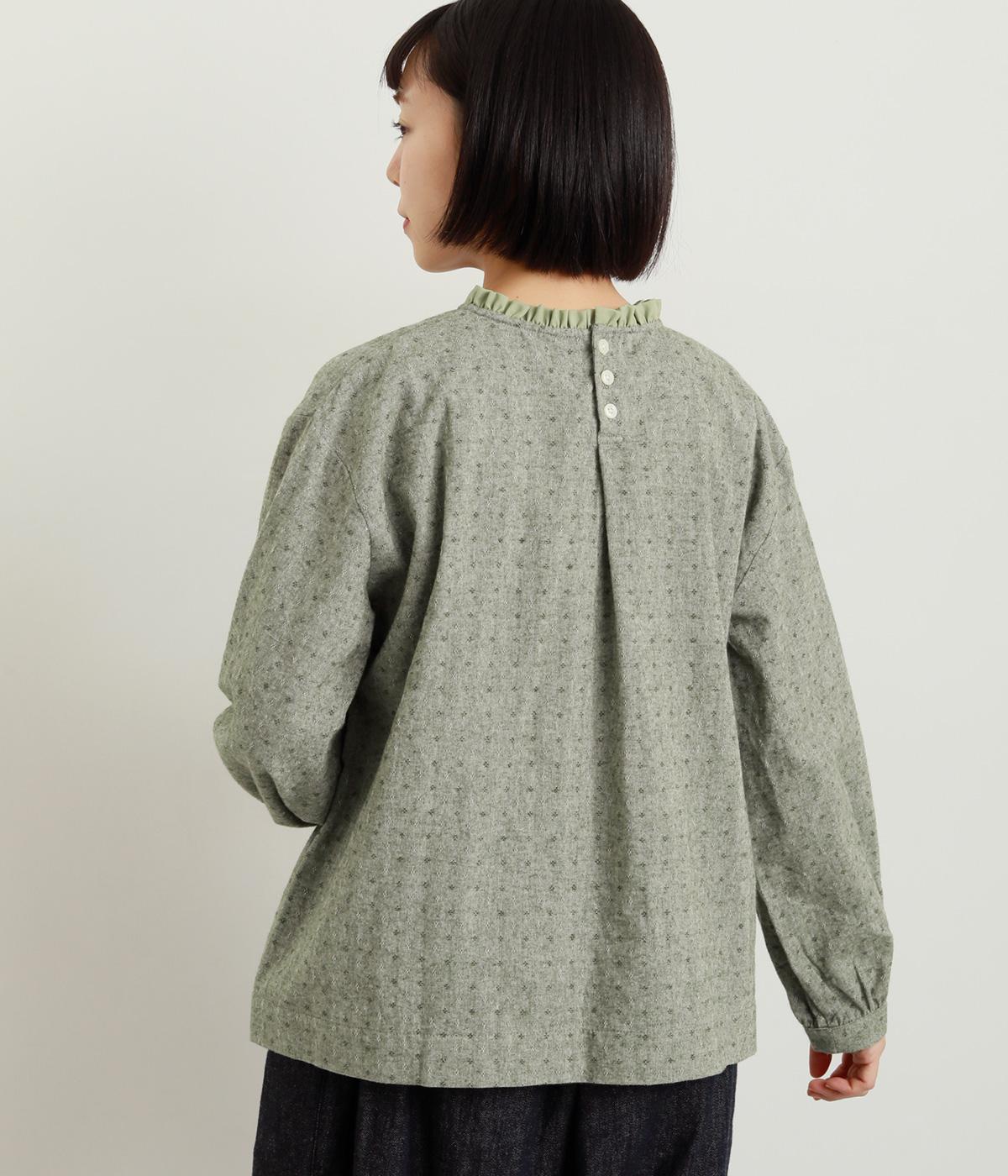 さりげない総柄刺しゅうが表情に奥行きを与えるブラウス。首元のフリルやゆったりしたシルエットが女性らしい雰囲気をつくります。ほどよい丈感でパンツスタイルにもスカートにもしっくりとなじみます。