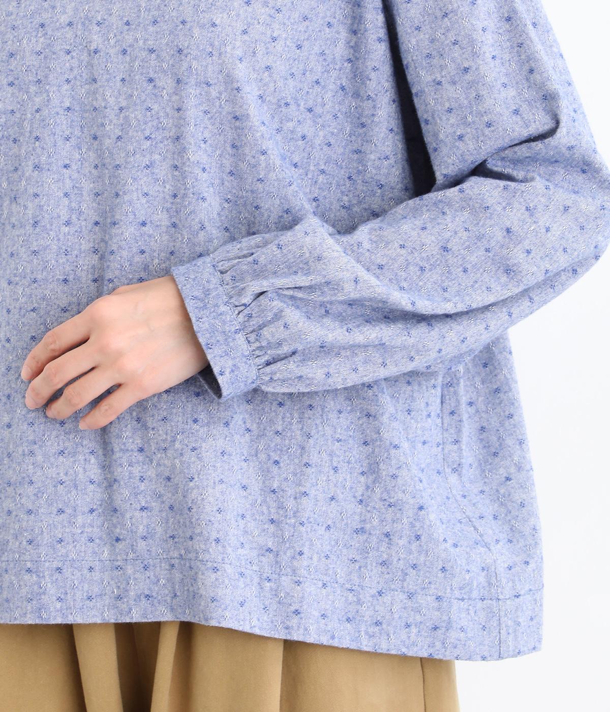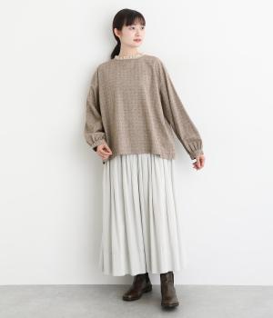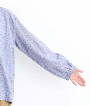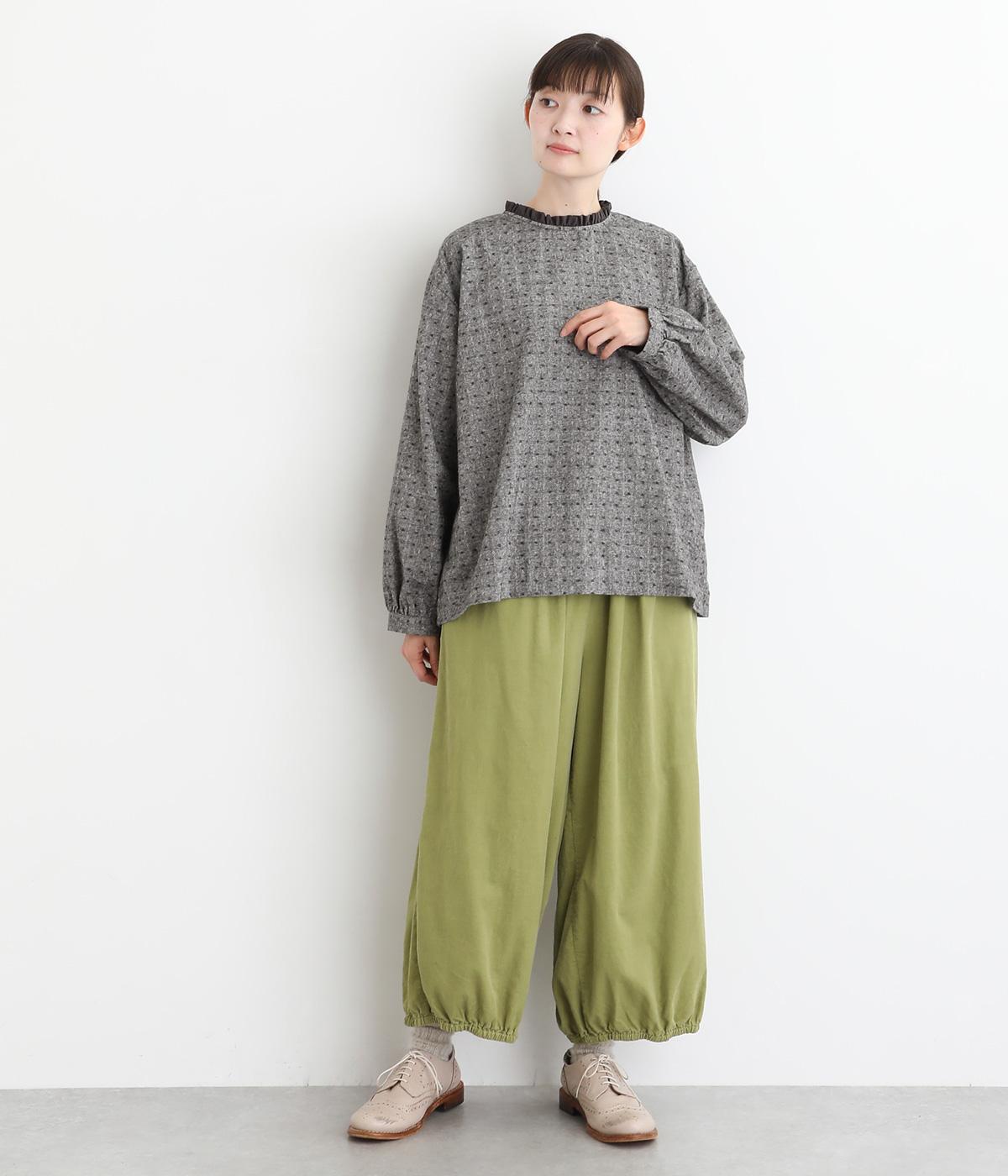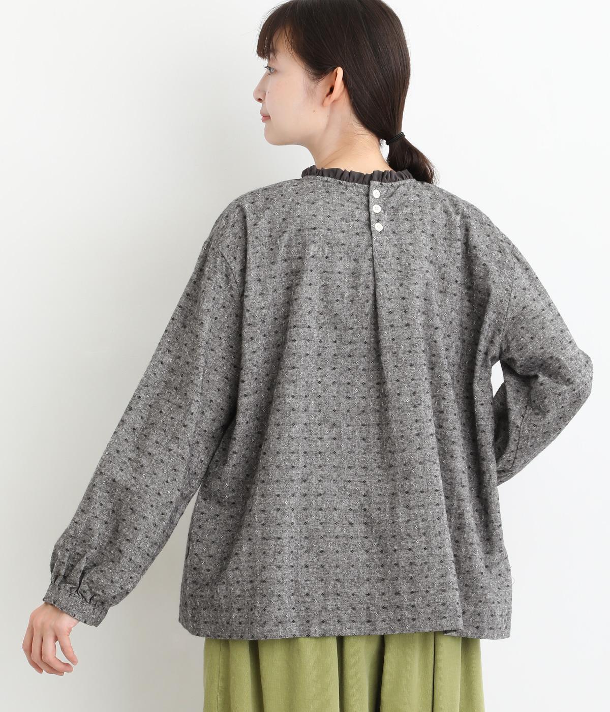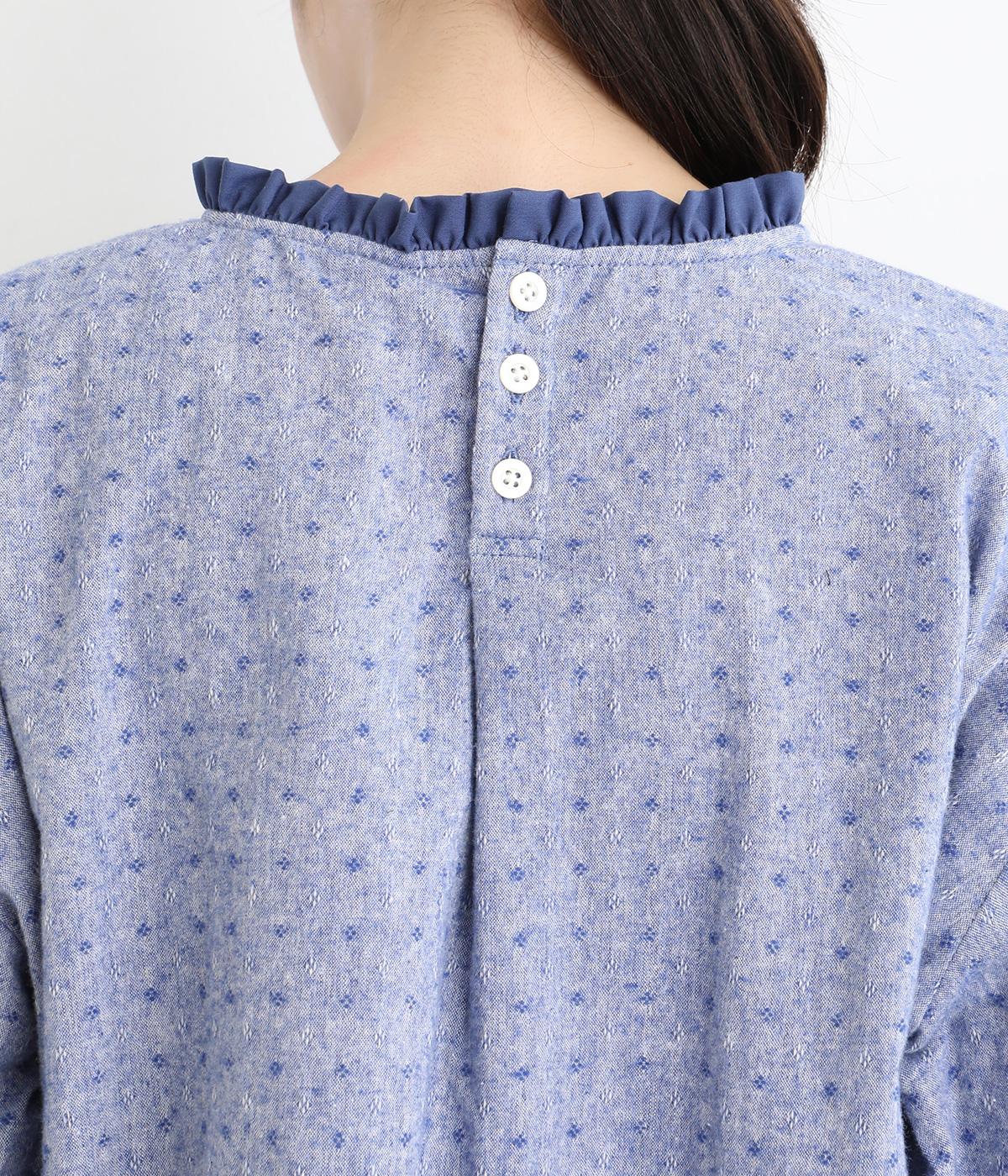さりげない総柄刺しゅうが表情に奥行きを与えるブラウス。首元のフリルやゆったりしたシルエットが女性らしい雰囲気をつくります。ほどよい丈感でパンツスタイルにもスカートにもしっくりとなじみます。
