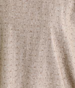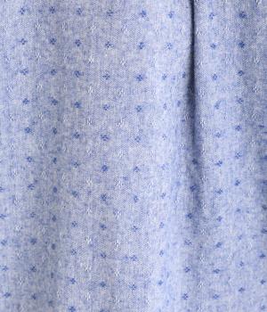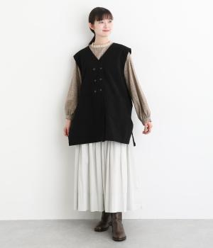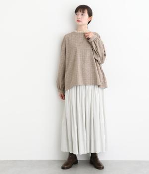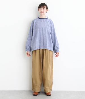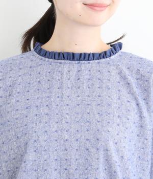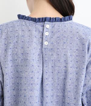 ネップのある表面がナチュラルな風合いのコットンリネン生地。くったりと柔らかい肌なじみが魅力です。首元のフリルはハリがありながらも優しいあたりの別布を合わせました。
