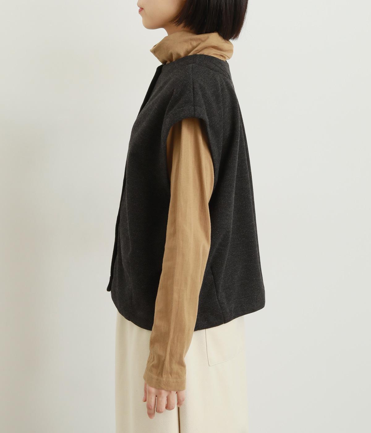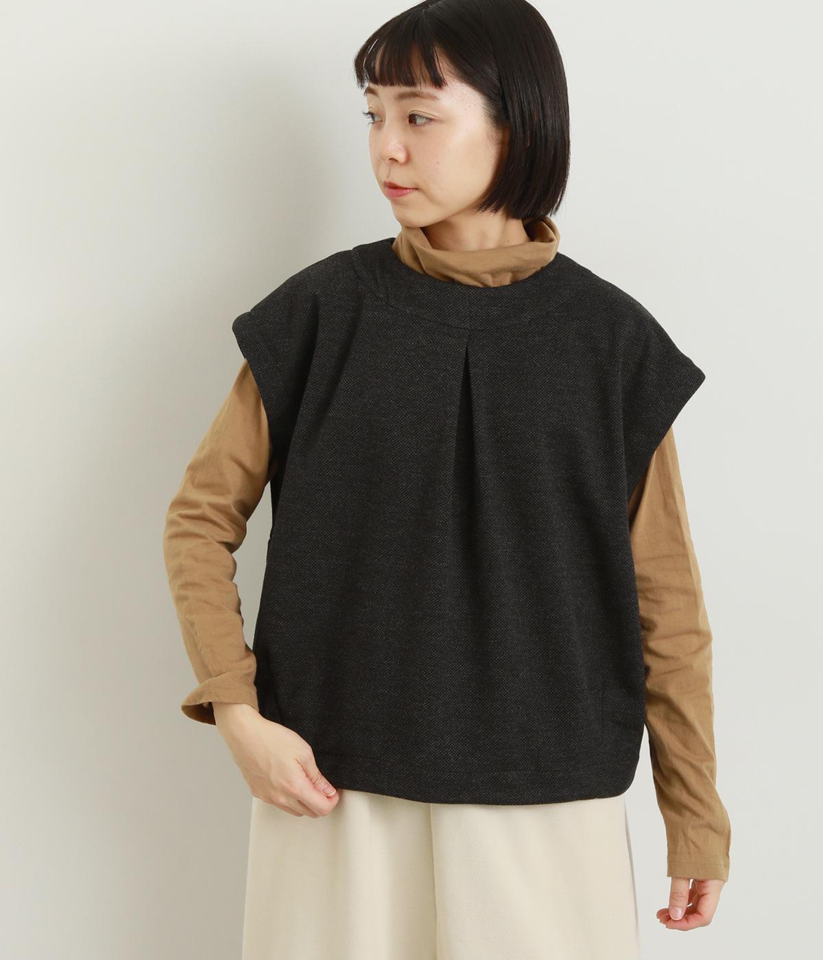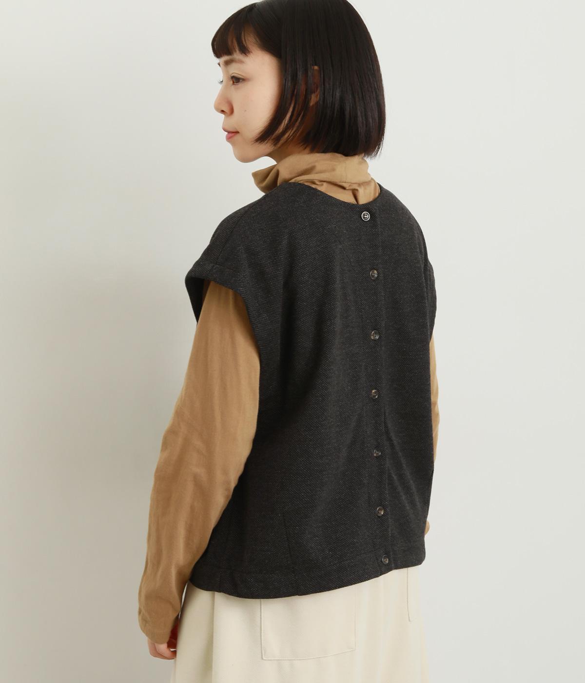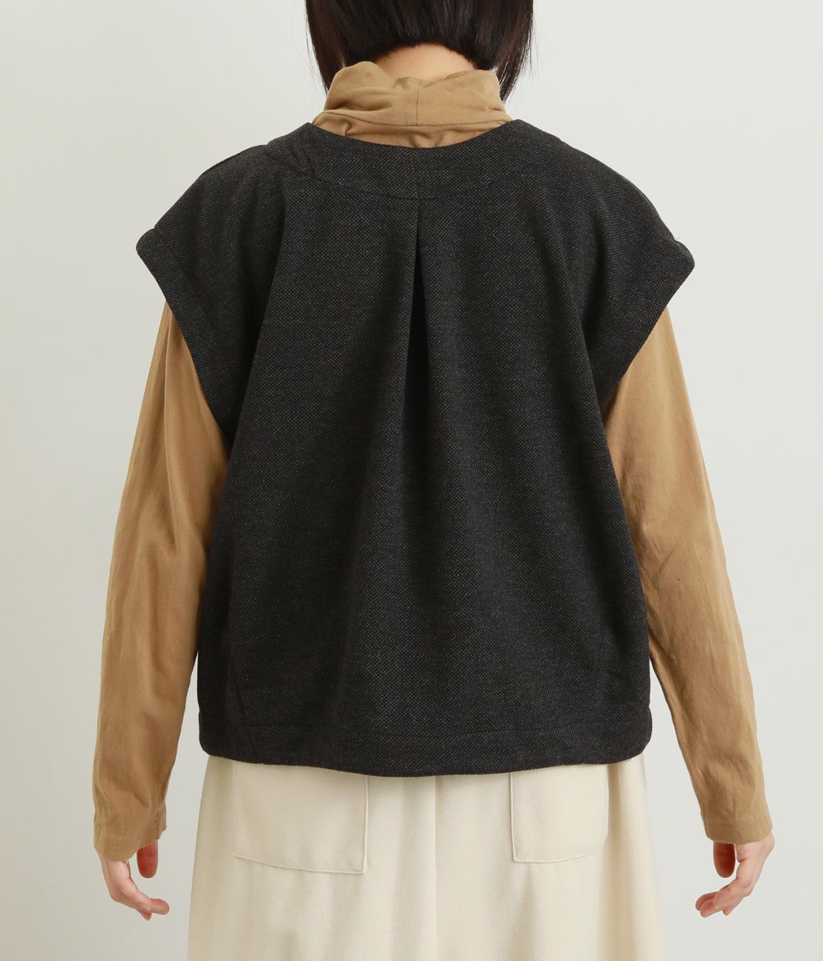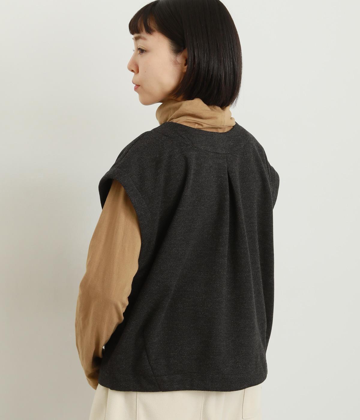 前後で表情が変わる、2way仕様のベストです。ボタン面はジャケット風のきちんと感を、タック面はすっきりとしたプルオーバー風の着こなしをたのしめます。肩が落ちるフレンチスリーブがやわらかなシルエットを描き、裾のダーツがふんわりとした丸みをプラス。ワイドな身幅で、リラックス感たっぷりに着られる一枚です。
