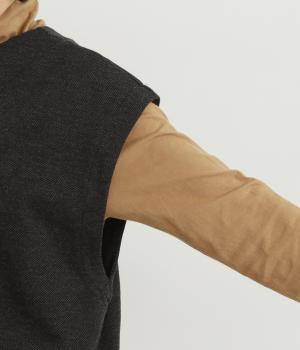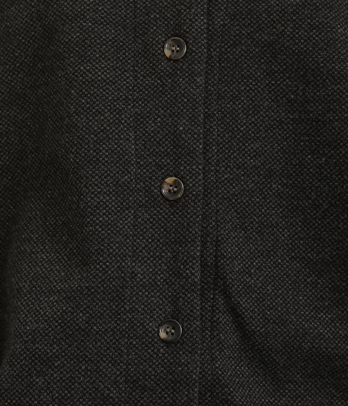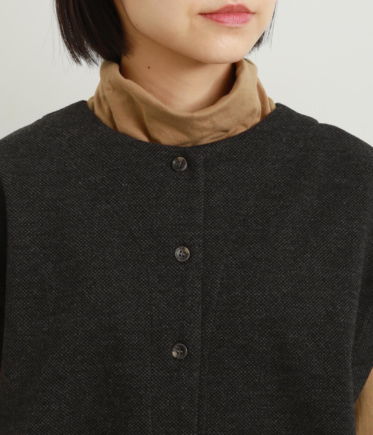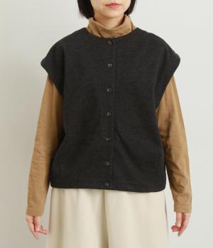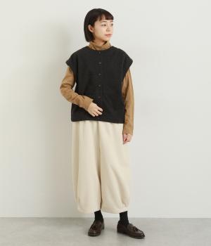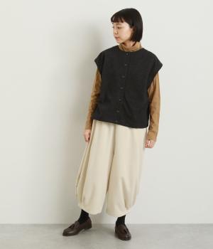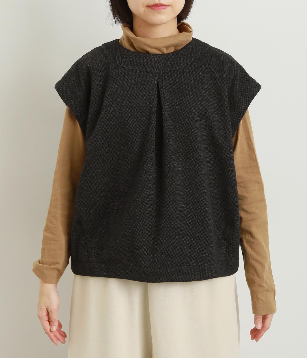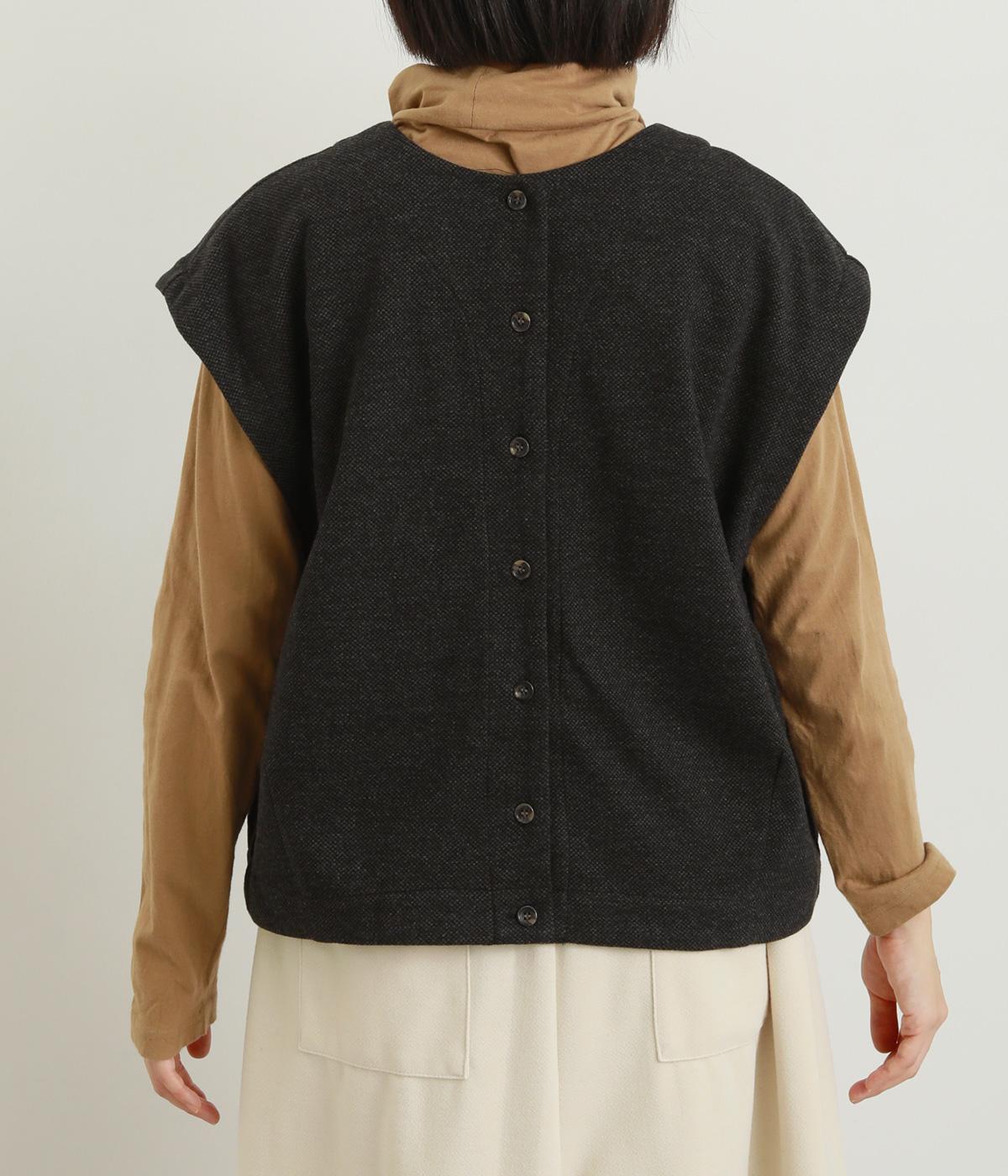 前後で表情が変わる、2way仕様のベストです。ボタン面はジャケット風のきちんと感を、タック面はすっきりとしたプルオーバー風の着こなしをたのしめます。肩が落ちるフレンチスリーブがやわらかなシルエットを描き、裾のダーツがふんわりとした丸みをプラス。ワイドな身幅で、リラックス感たっぷりに着られる一枚です。