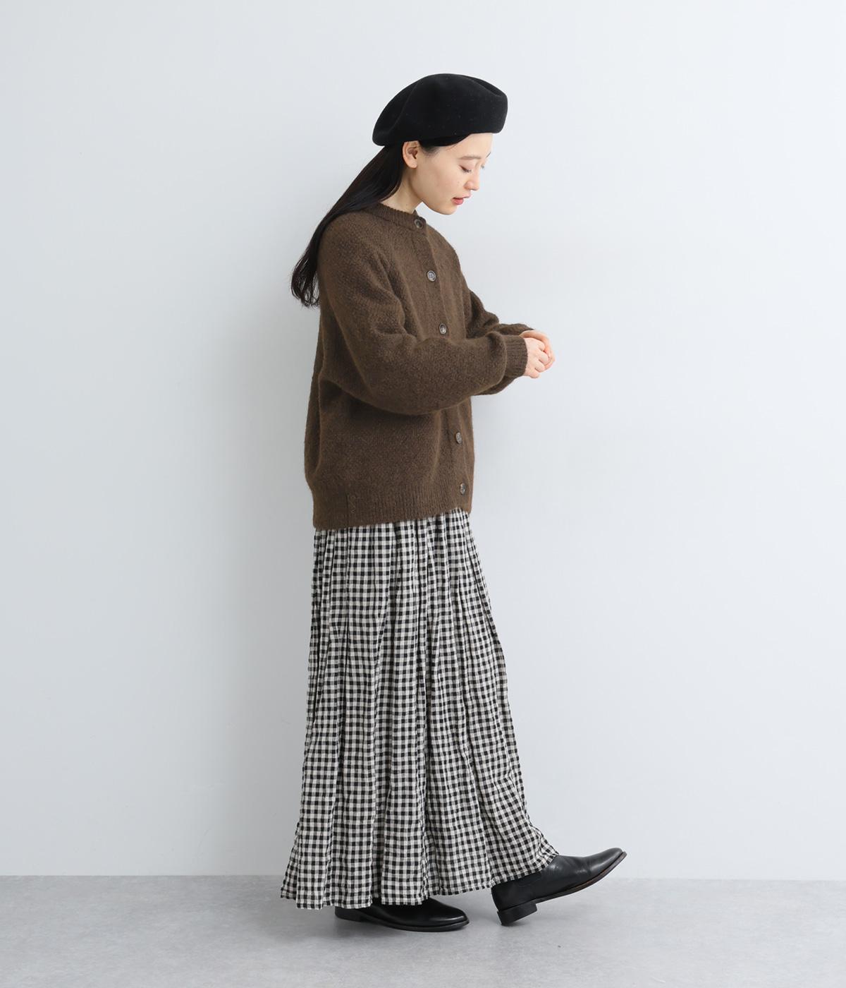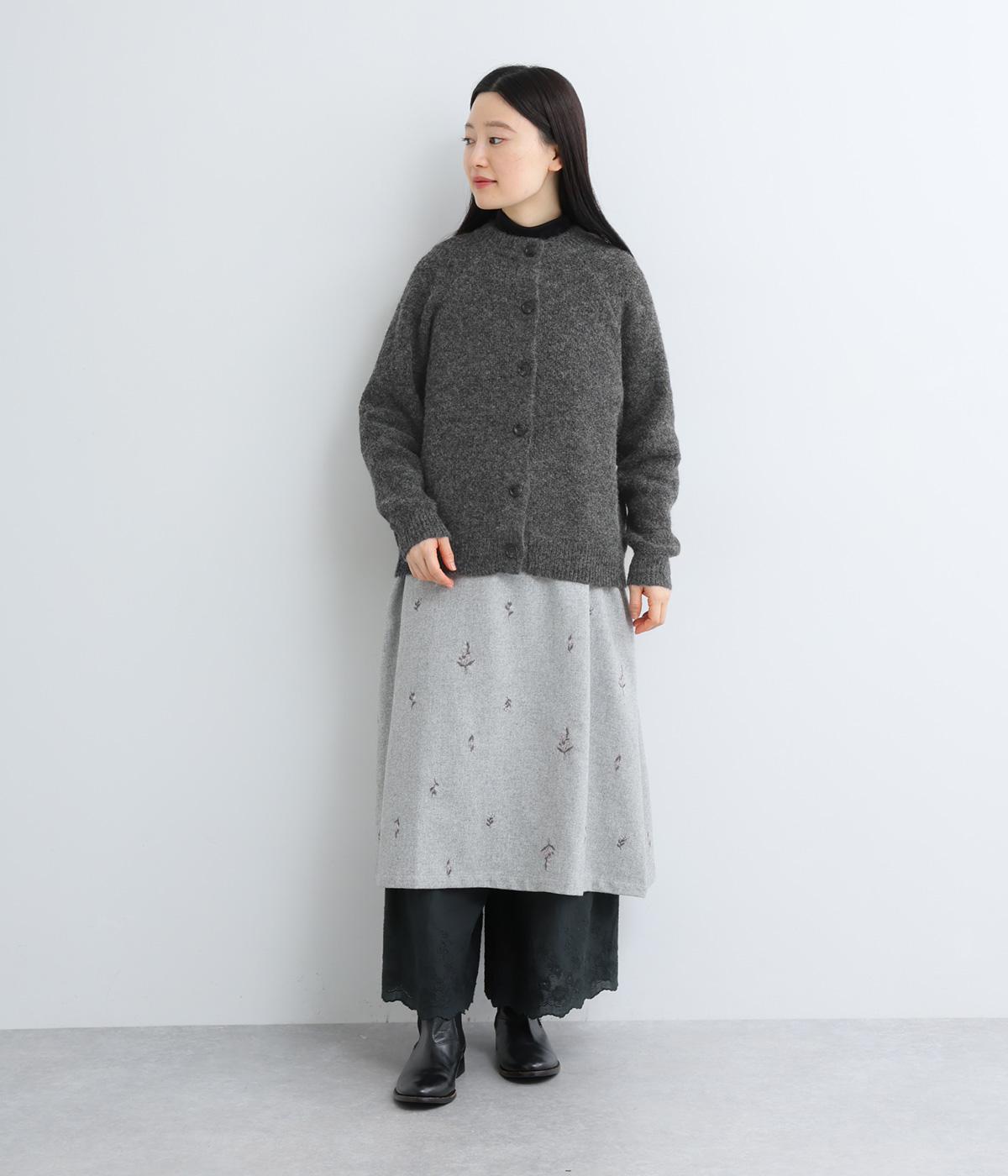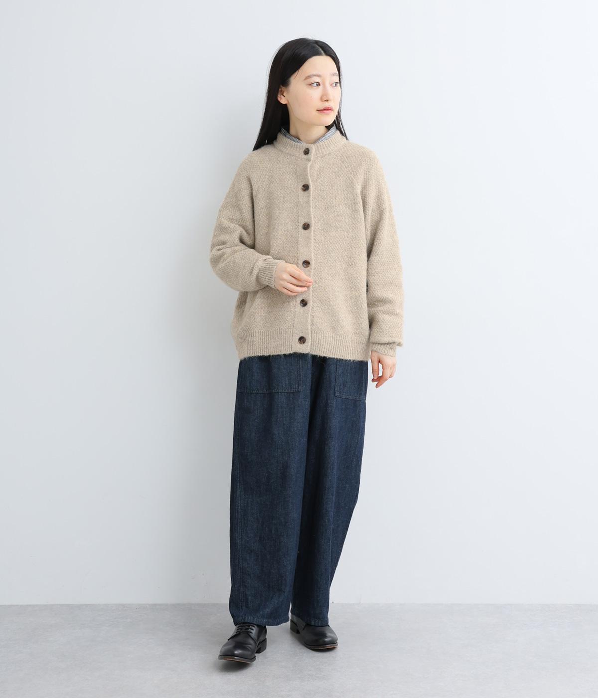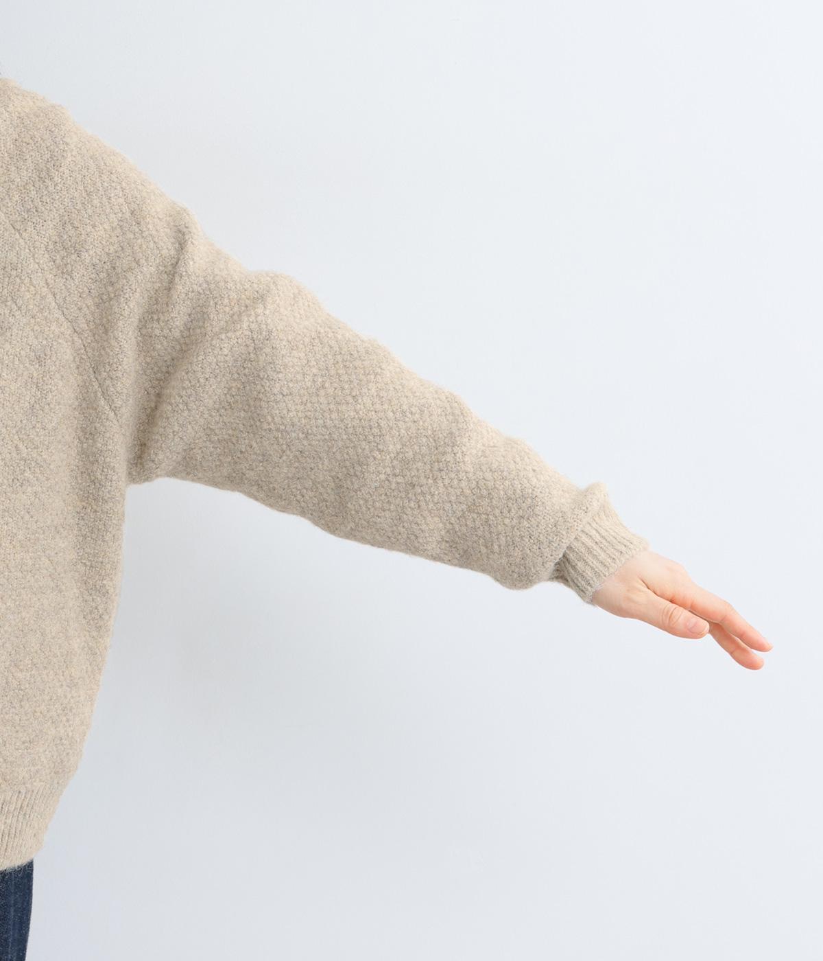 立体的な表面感と杢調のニュアンスのある色味が味わい深い表情の混紡生地です。存在感がありながらも重すぎず、伸縮性があって優しく体を包み込んでくれる素材感です。