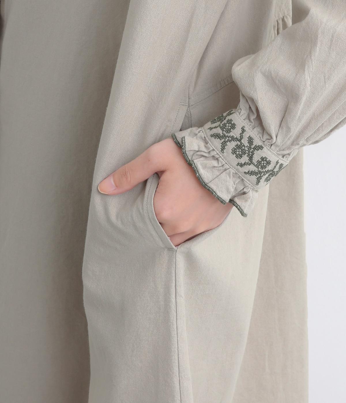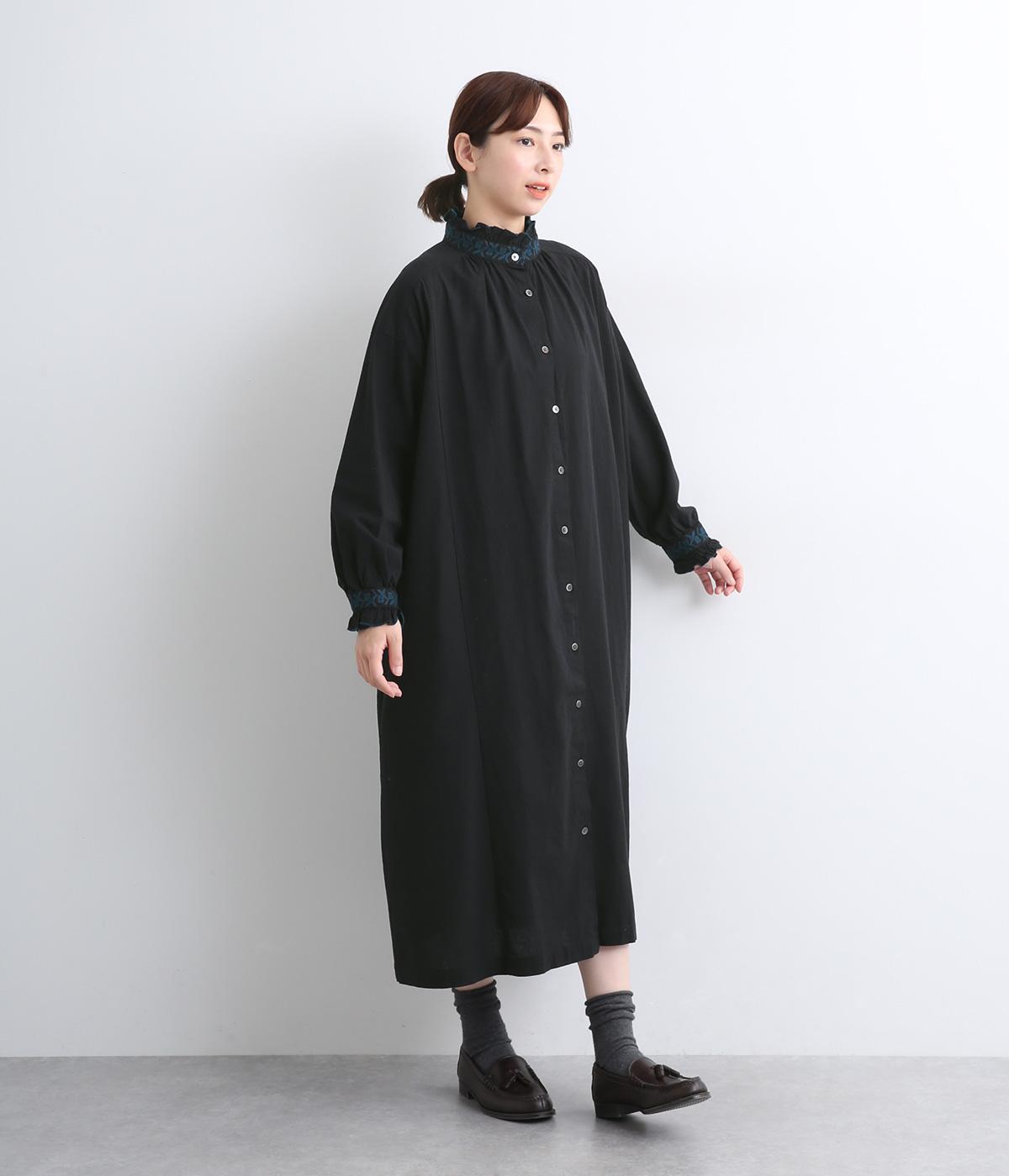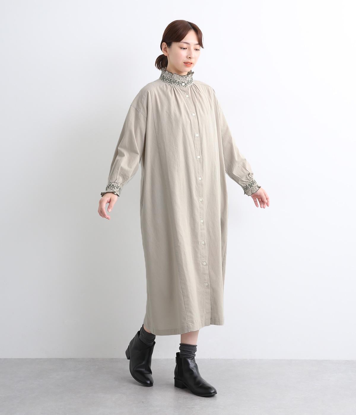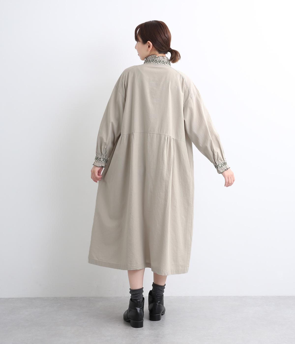 ナチュラルな風合いが魅力のワンピースに、襟と袖の刺しゅうとメロウロックでフェミニンなディテールを加えました。すとんと落ちるゆったりとしたシルエットも着心地のいいポイントで、前あきの羽織りスタイルもおすすめ。