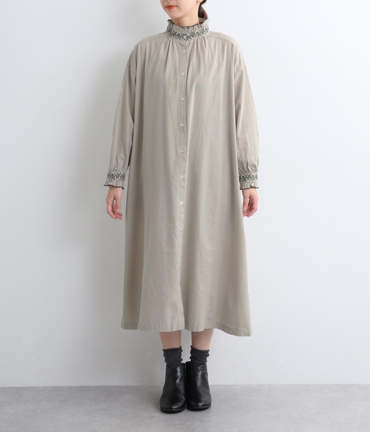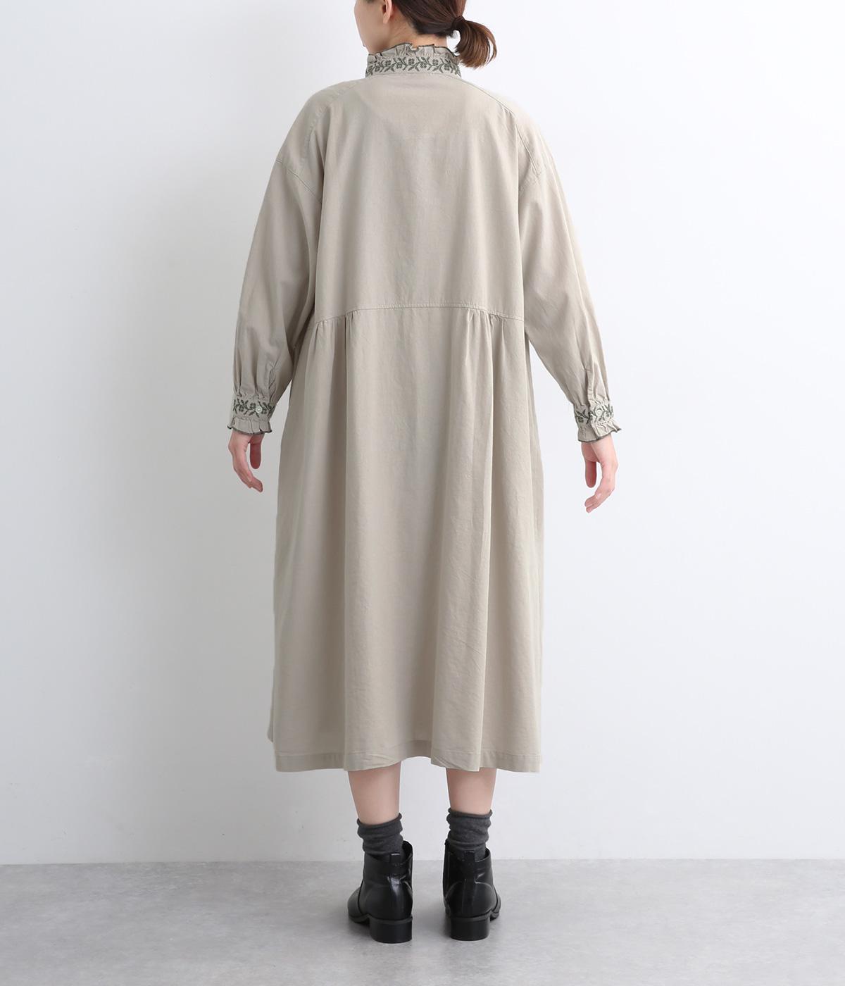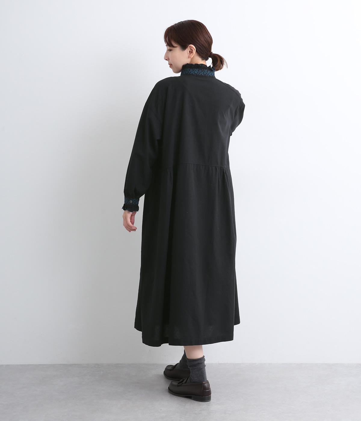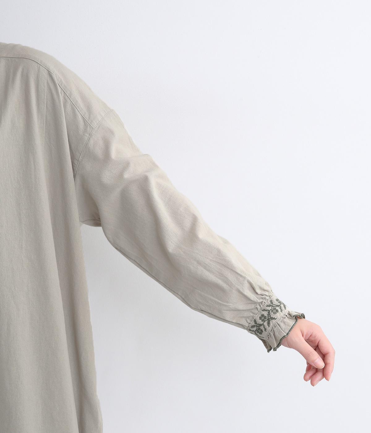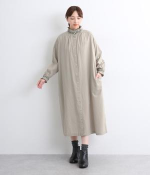 ナチュラルな風合いが魅力のワンピースに、襟と袖の刺しゅうとメロウロックでフェミニンなディテールを加えました。すとんと落ちるゆったりとしたシルエットも着心地のいいポイントで、前あきの羽織りスタイルもおすすめ。