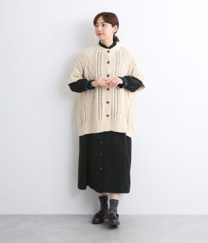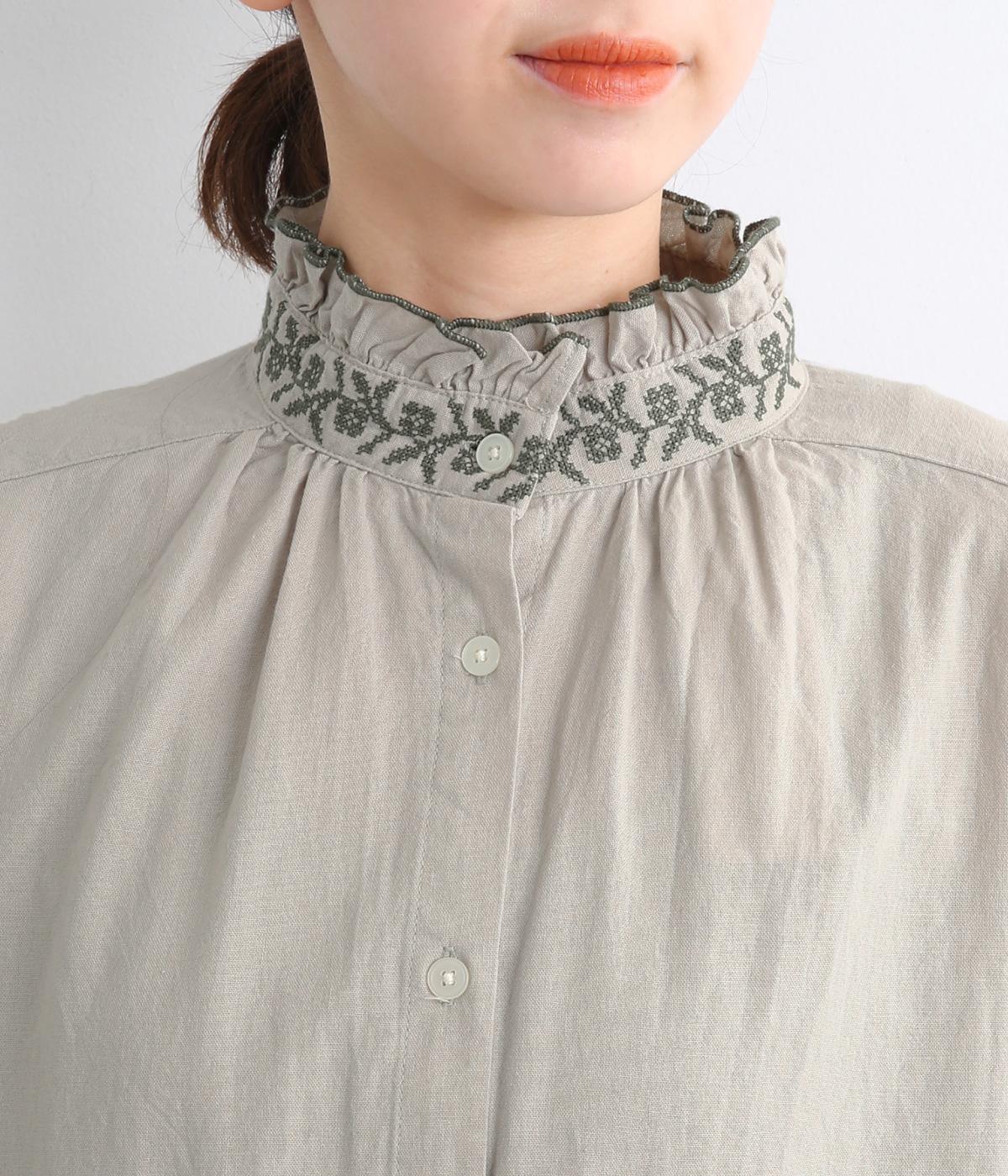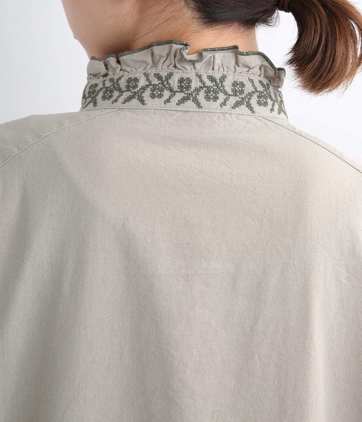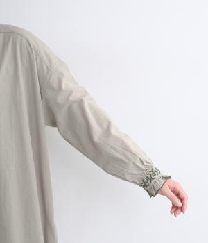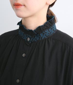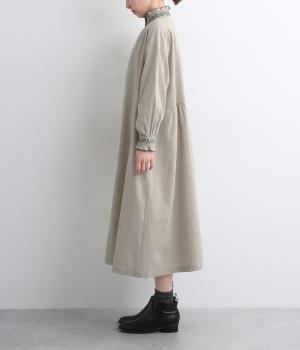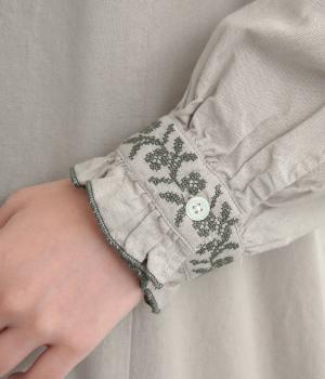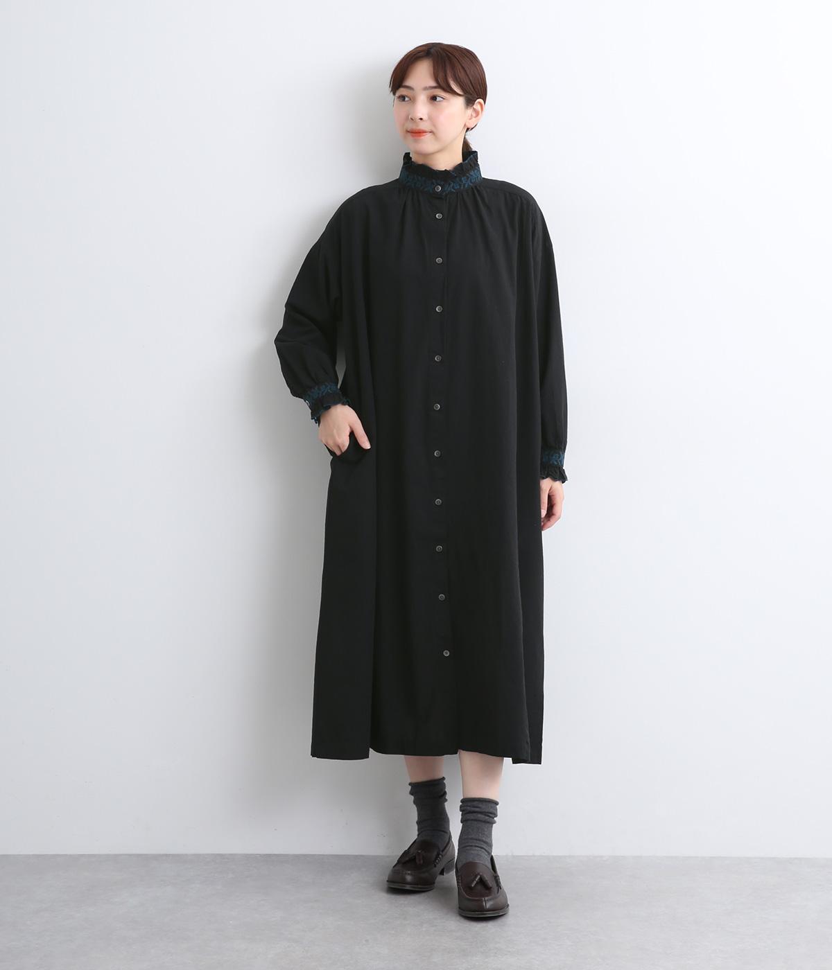 ナチュラルな風合いが魅力のワンピースに、襟と袖の刺しゅうとメロウロックでフェミニンなディテールを加えました。すとんと落ちるゆったりとしたシルエットも着心地のいいポイントで、前あきの羽織りスタイルもおすすめ。