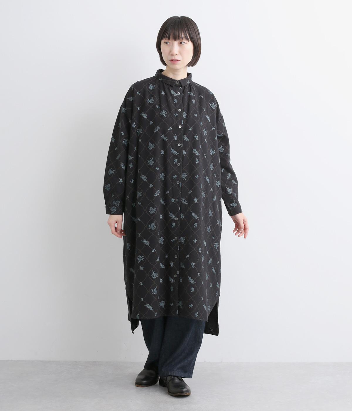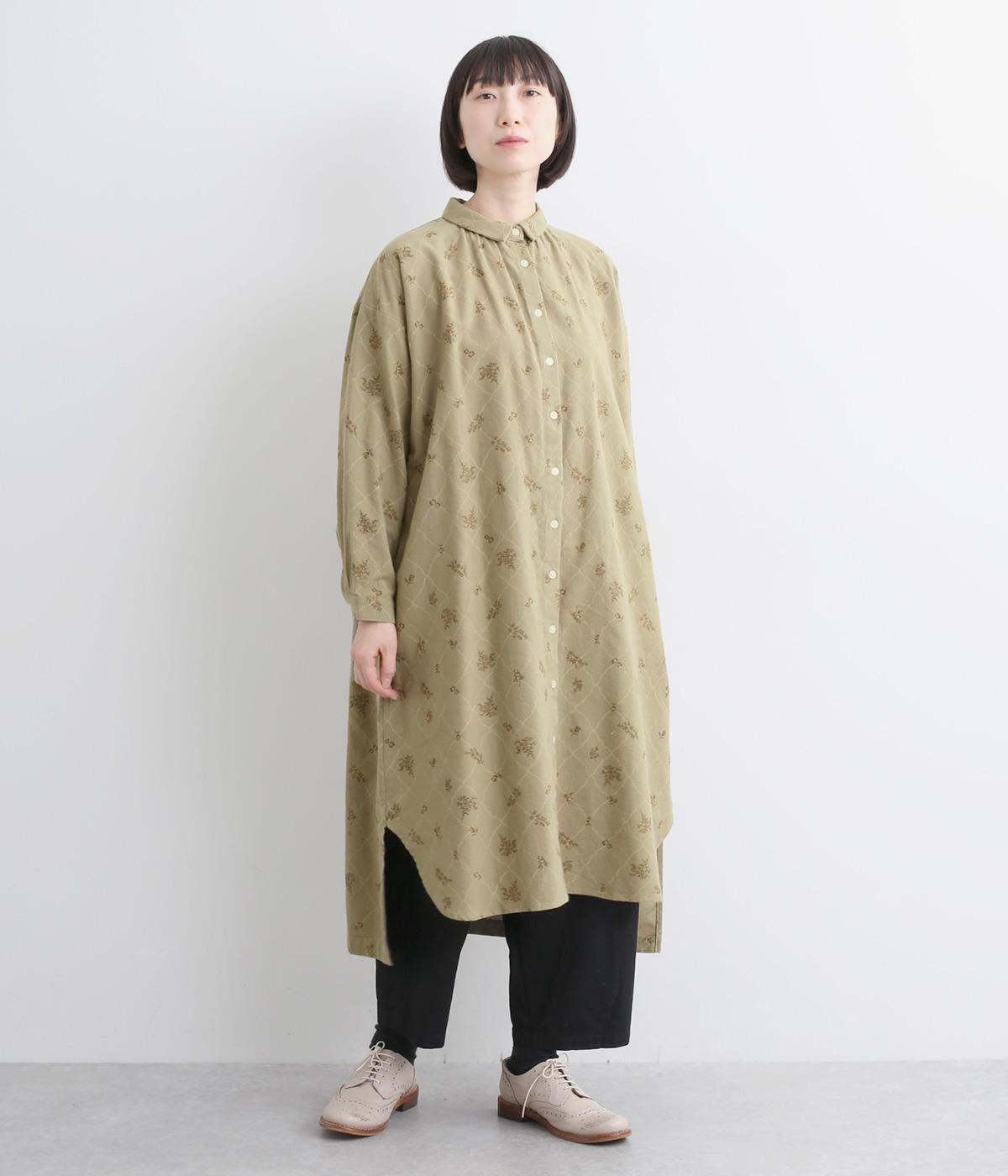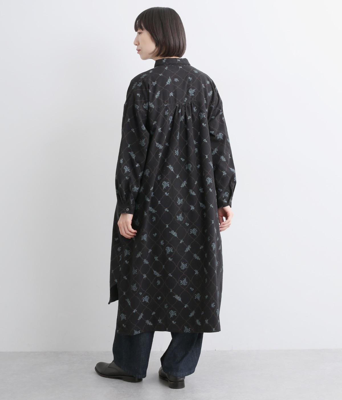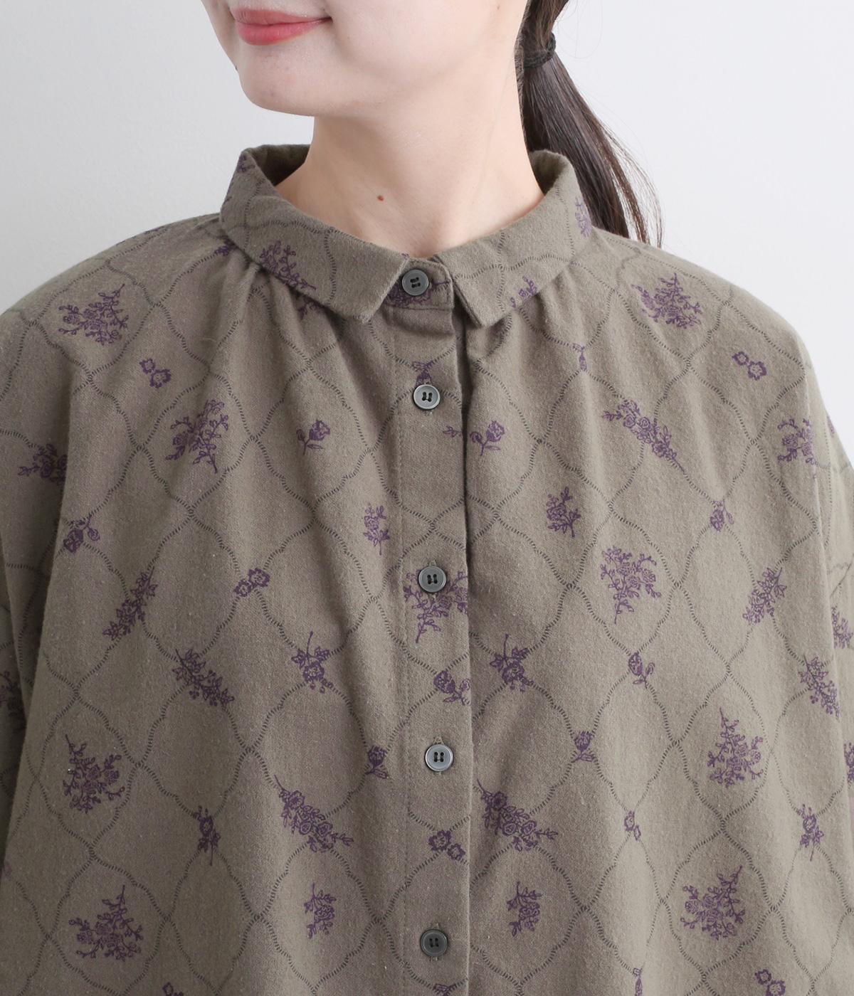 レトロな雰囲気の総柄プリントが落ち着いた表情のシャツワンピース。前後身頃や袖にギャザーをほどこし、ふんわりとしたシルエットが華やかさをプラスします。ゆったりした身幅でリラックスした着心地を叶え、レイヤードスタイルにもおすすめです。