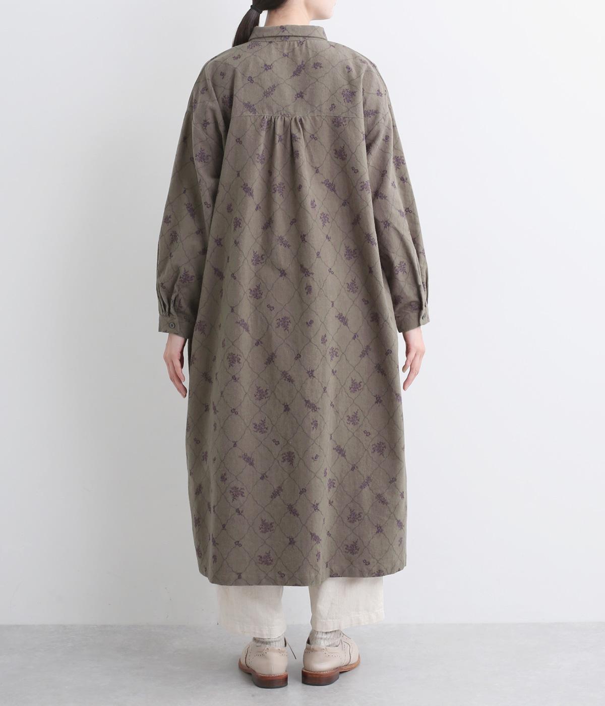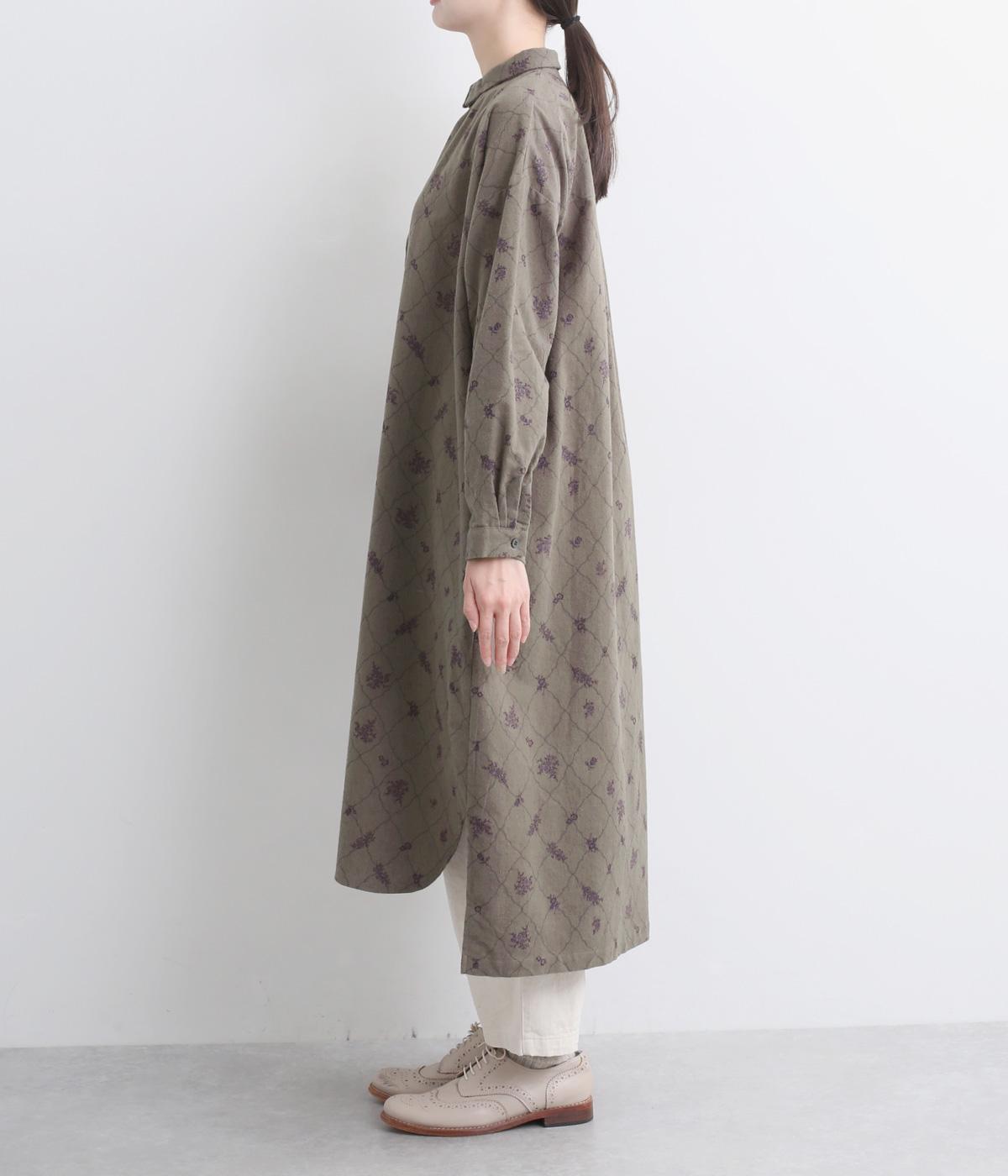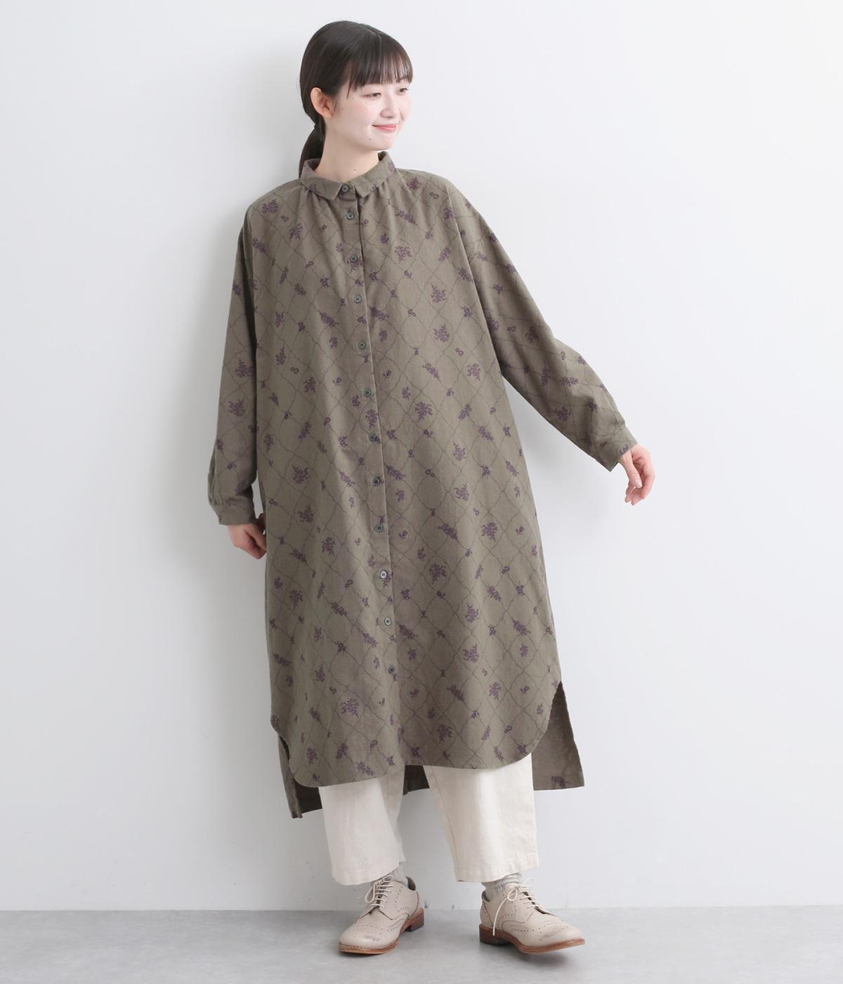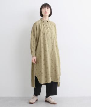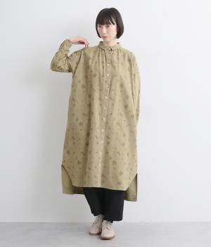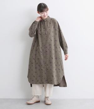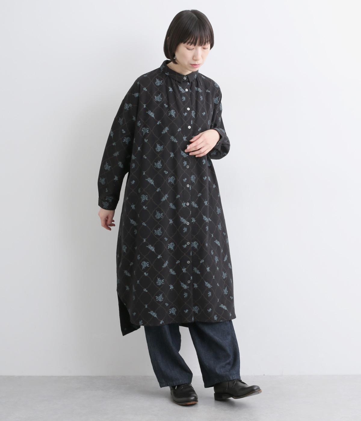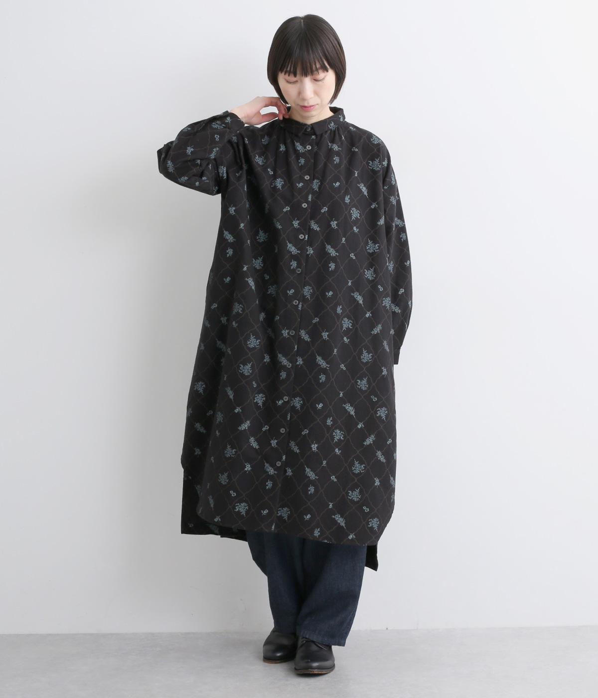 レトロな雰囲気の総柄プリントが落ち着いた表情のシャツワンピース。前後身頃や袖にギャザーをほどこし、ふんわりとしたシルエットが華やかさをプラスします。ゆったりした身幅でリラックスした着心地を叶え、レイヤードスタイルにもおすすめです。