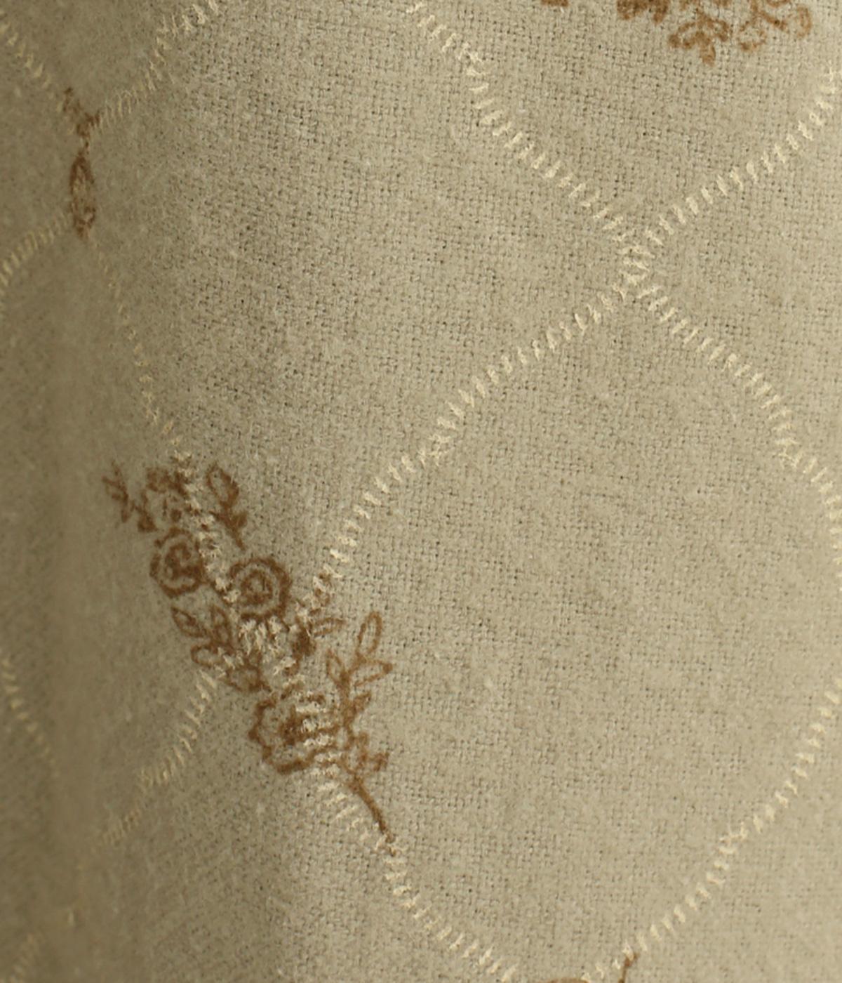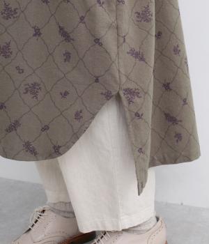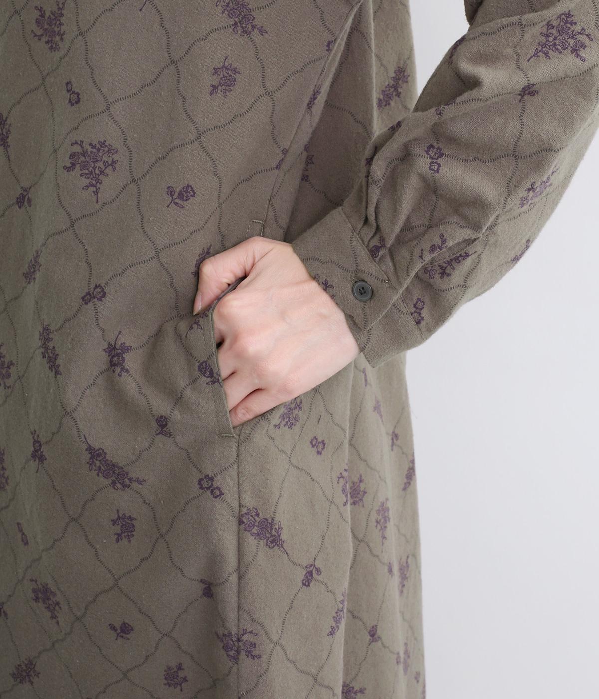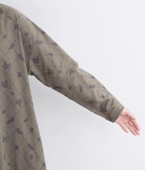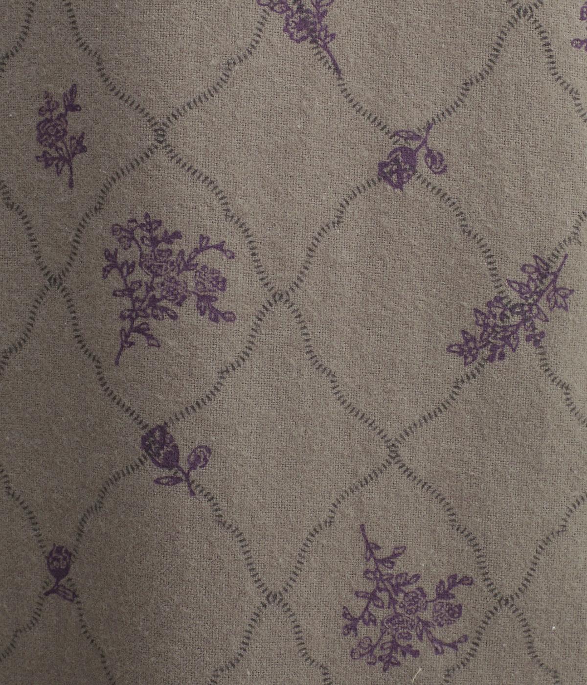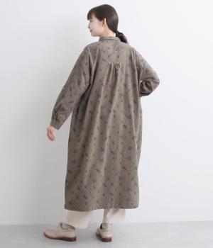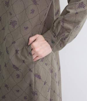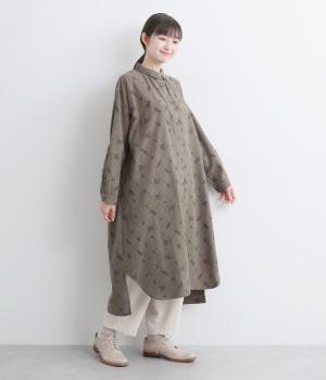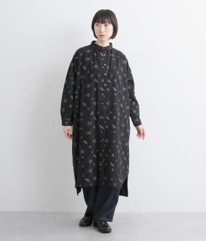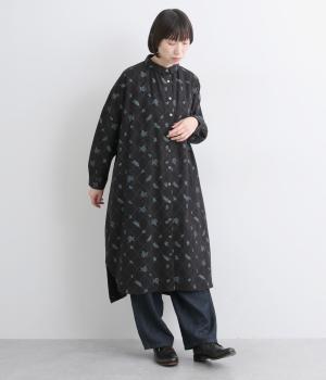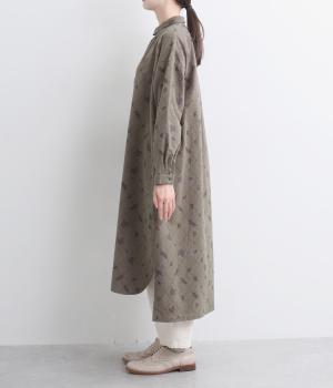 しっかりとした生地感ながら肌になじむコットン素材です。素朴で優しい風合いにシックな総柄プリントをほどこしました。ハリのある生地感がきちんと見えします。