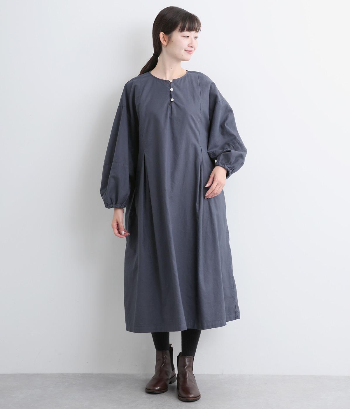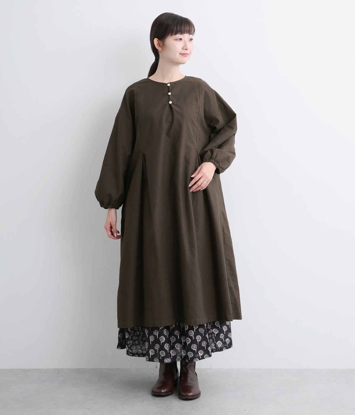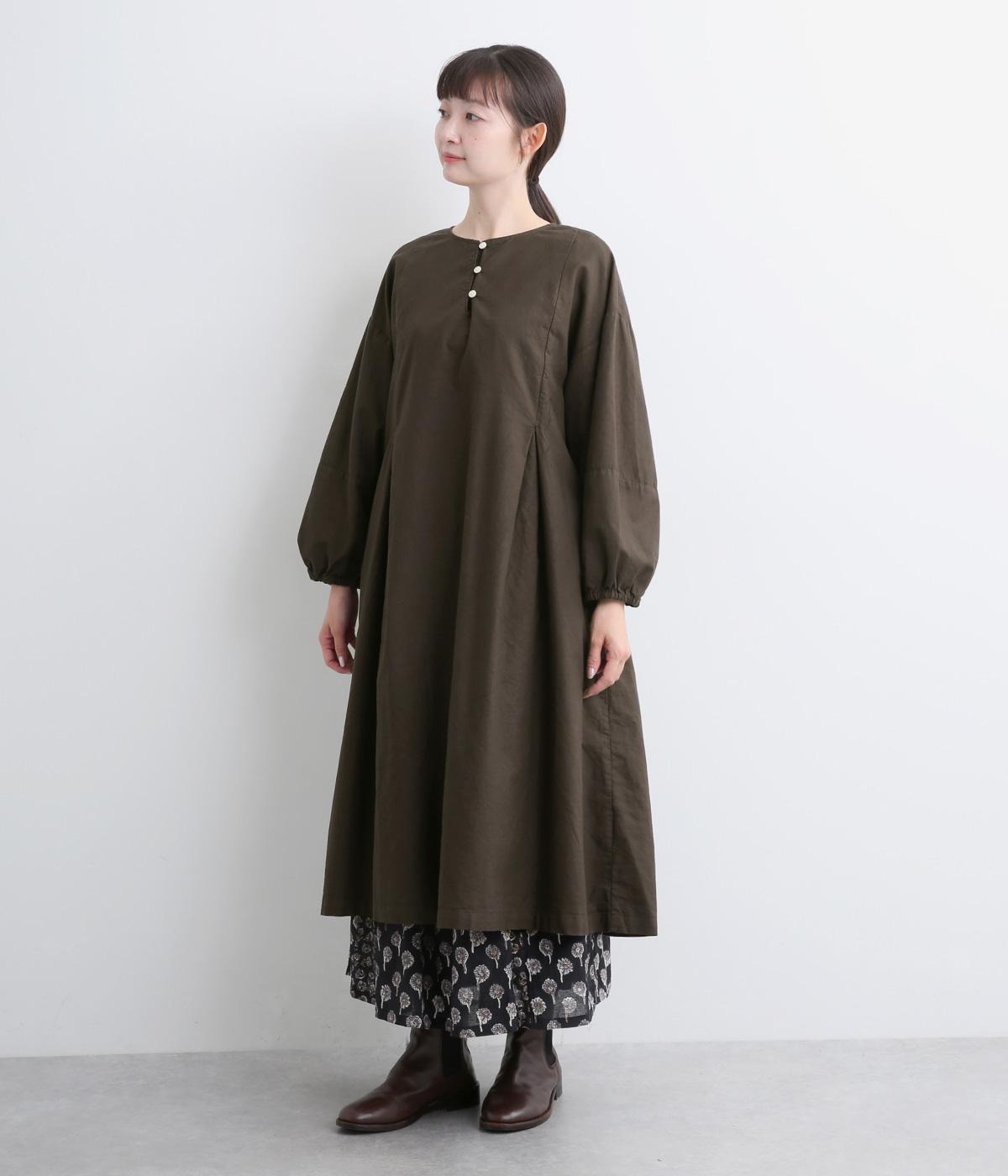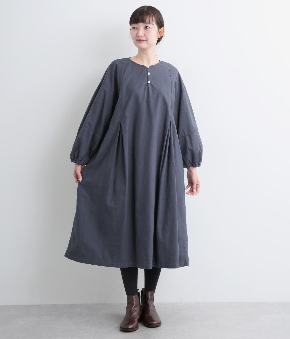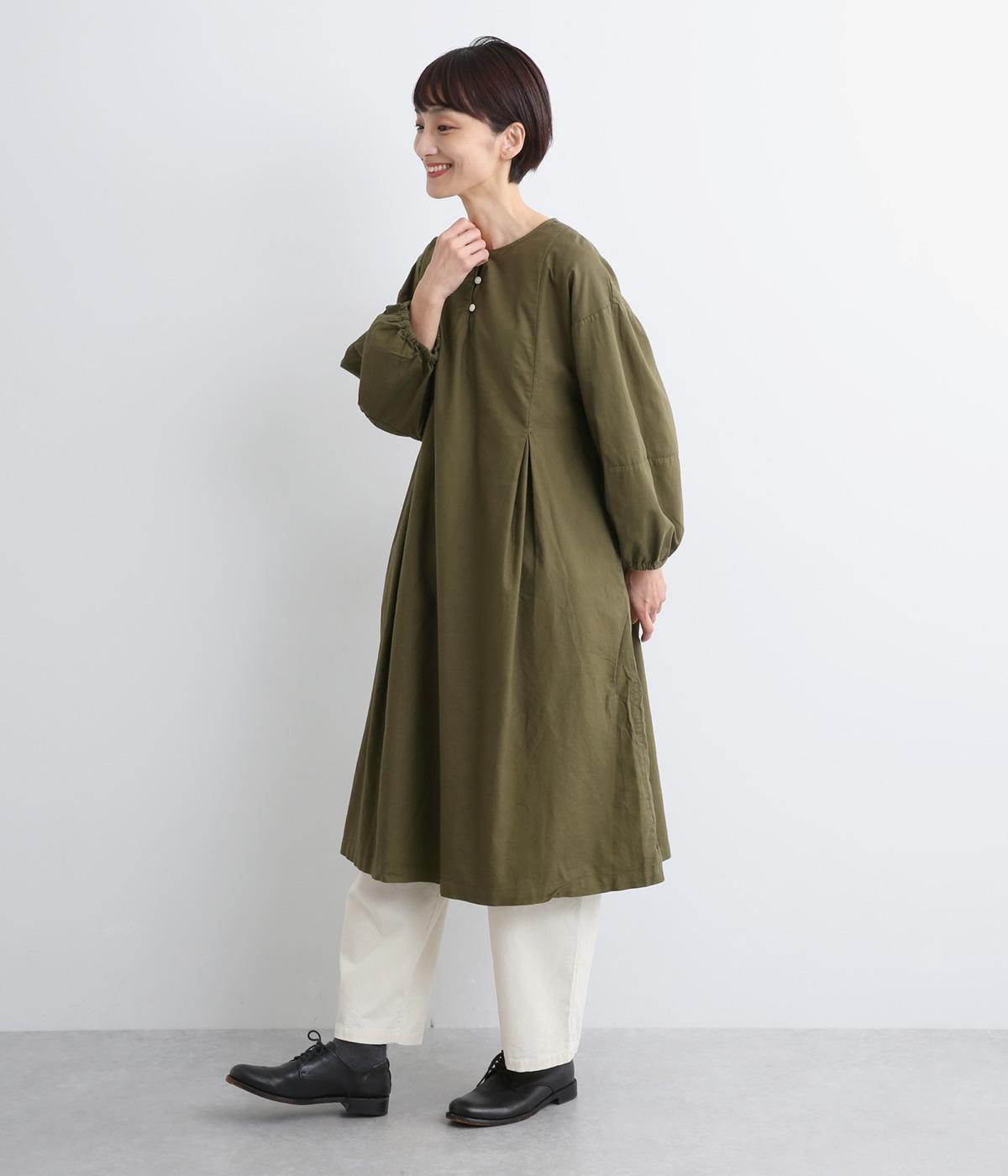 前後にタックをいれたフレアシルエットのワンピース。袖口にゴムを通して切り替えを施した、立体的なコクーン袖が女性らしさを惹きたてます。パンツやスカートとのレイヤードもお洒落にきまる、ふくらはぎが隠れるミモレ丈もグッドです。