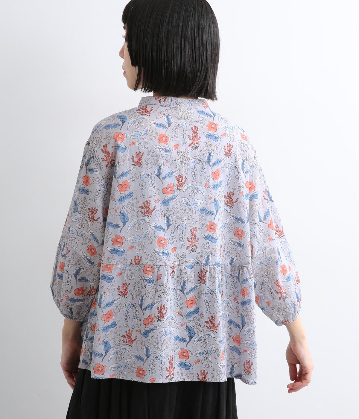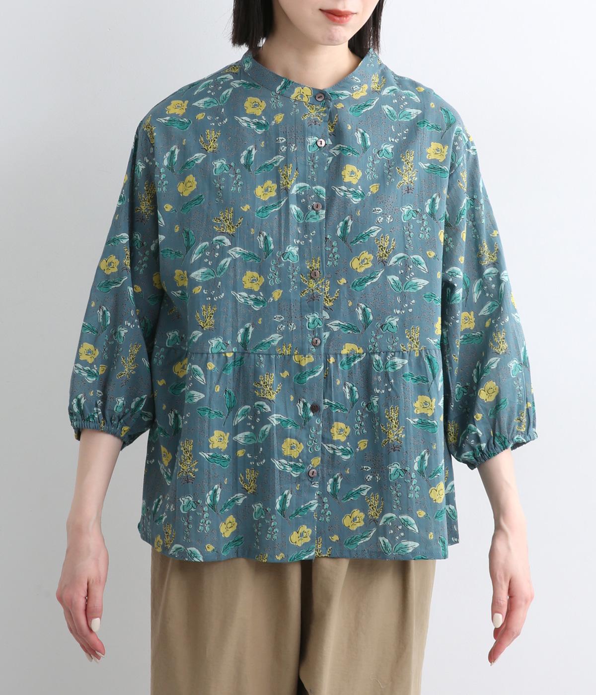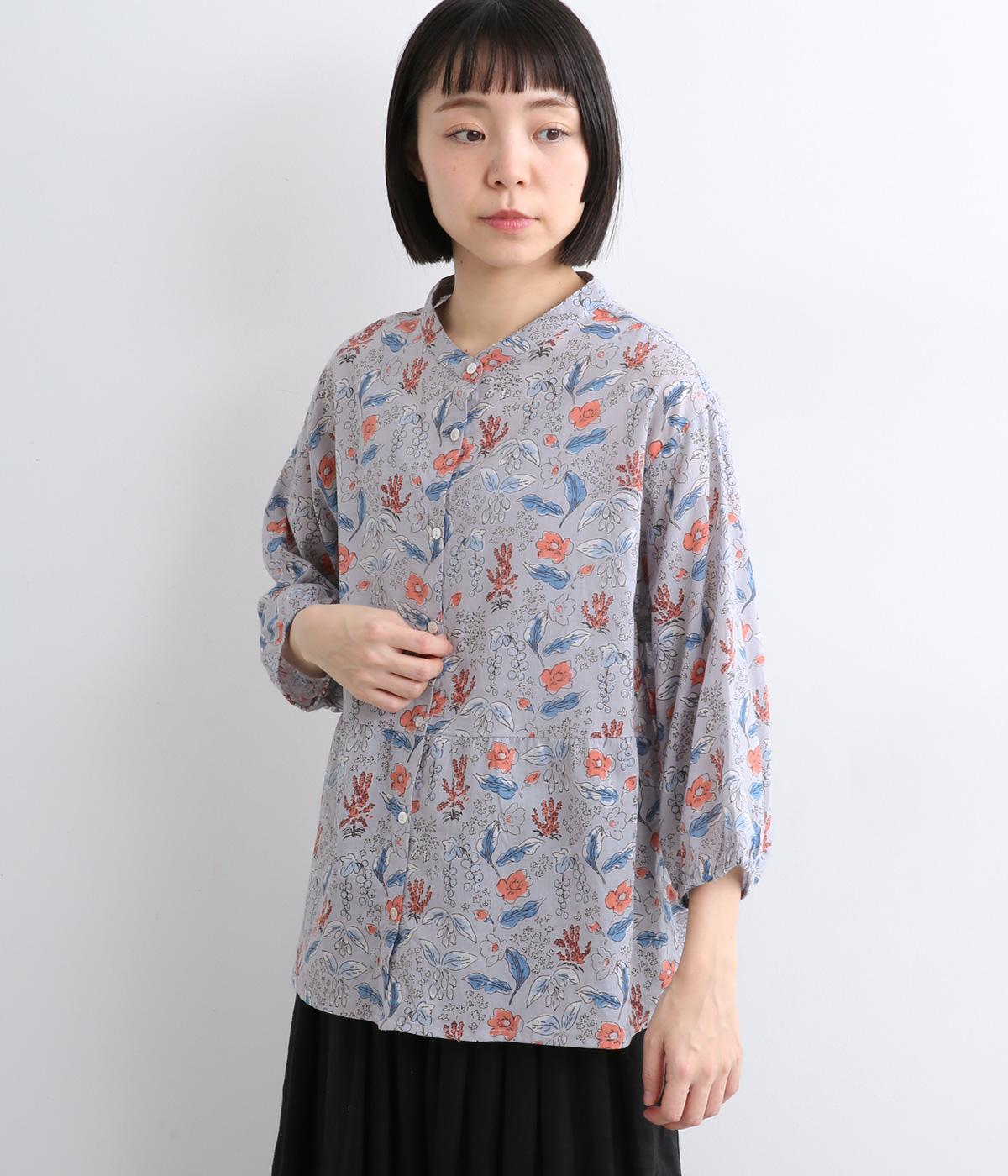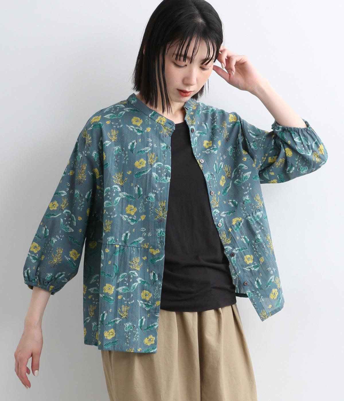 華やかだけど甘すぎない、大人のためのスクレフラワー柄シャツ。七分袖が手元をすっきり見せ、袖口ゴムなので半袖にたくし上げても◎。シンプルなスタンドネックに前あき仕様で羽織り使いもおすすめです。