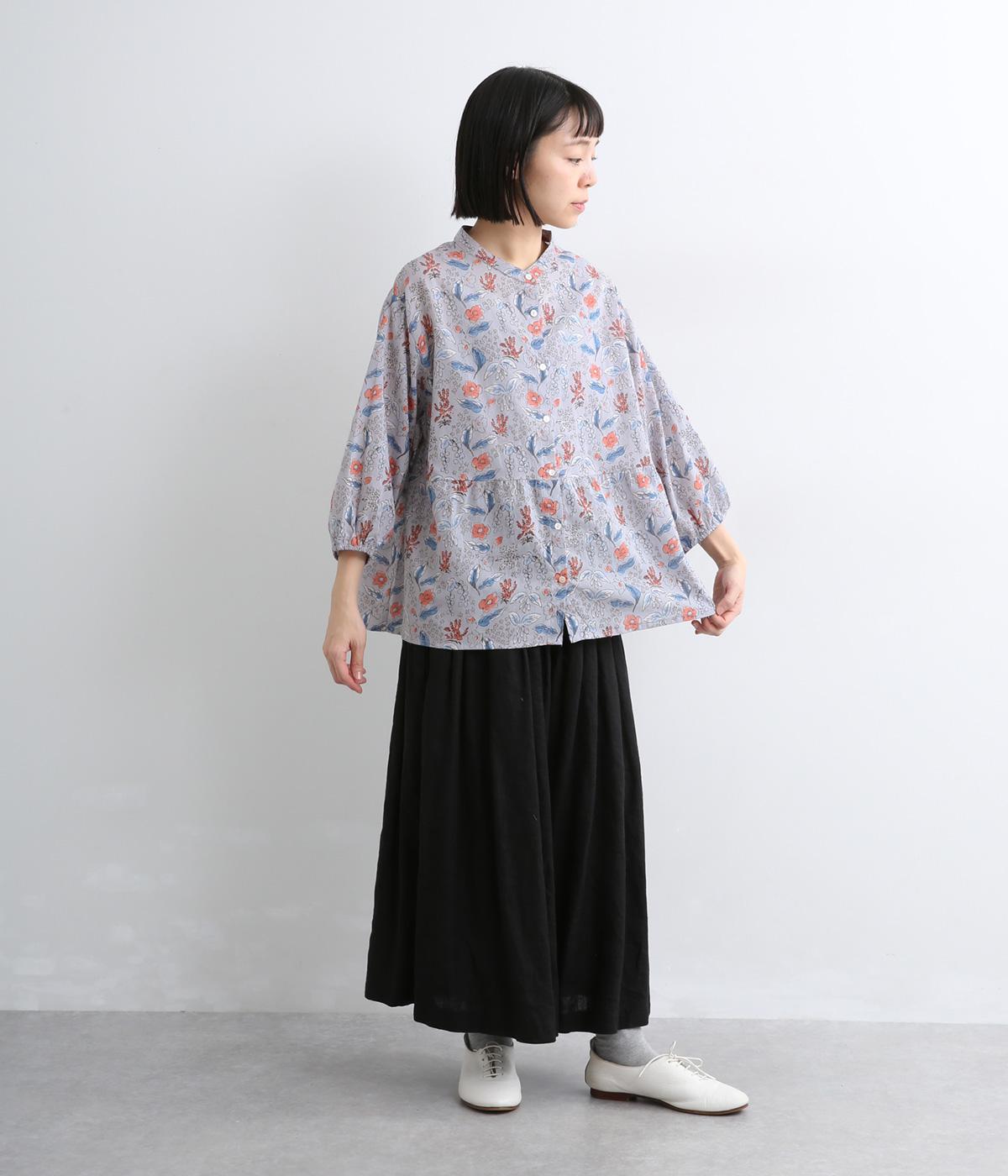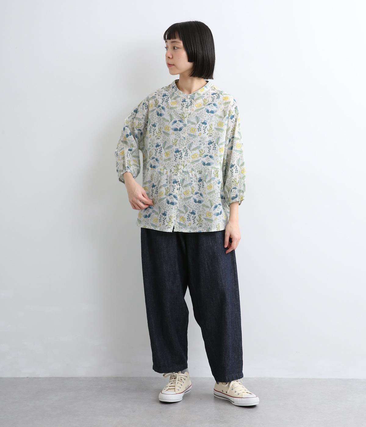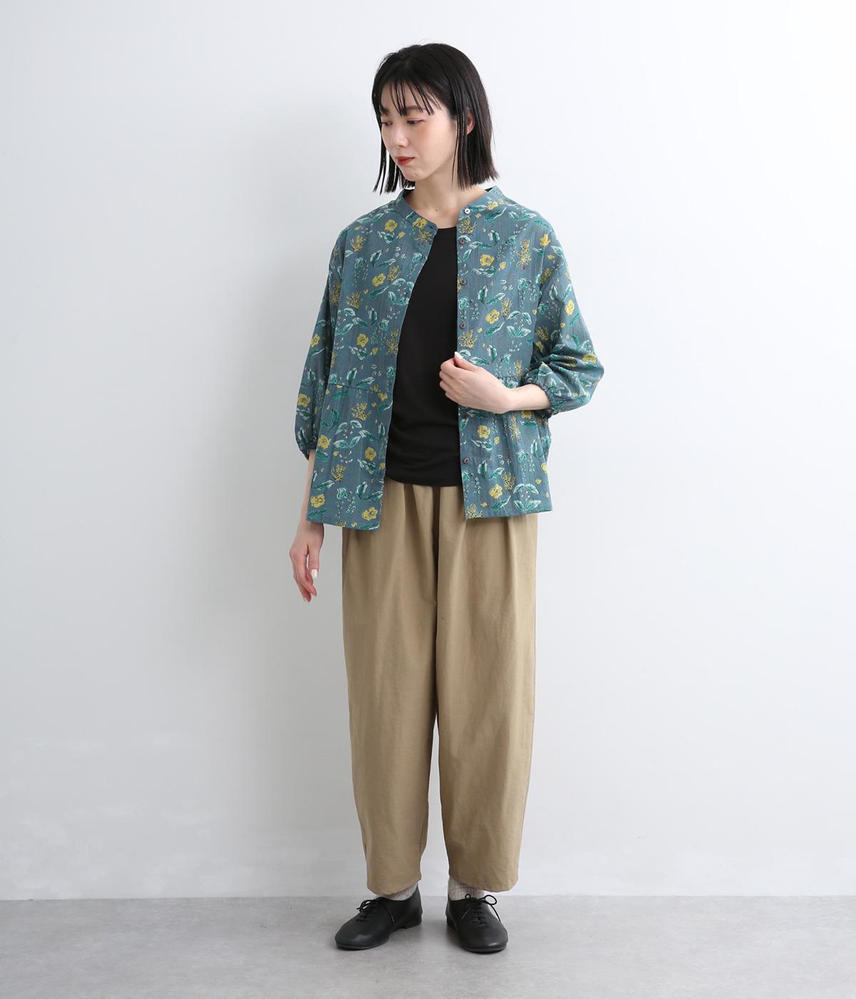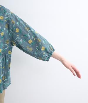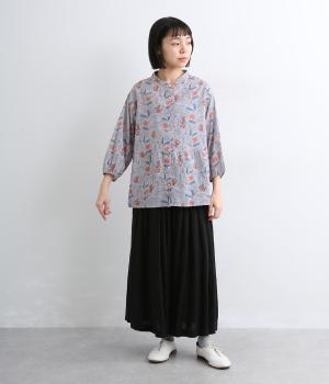 華やかだけど甘すぎない、大人のためのスクレフラワー柄シャツ。七分袖が手元をすっきり見せ、袖口ゴムなので半袖にたくし上げても◎。シンプルなスタンドネックに前あき仕様で羽織り使いもおすすめです。