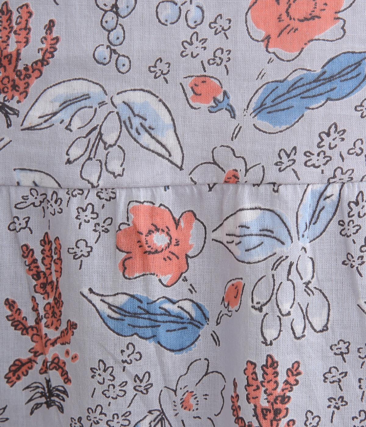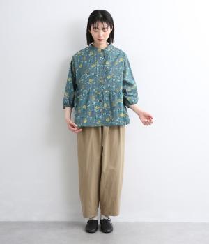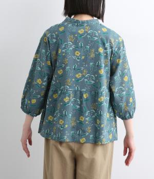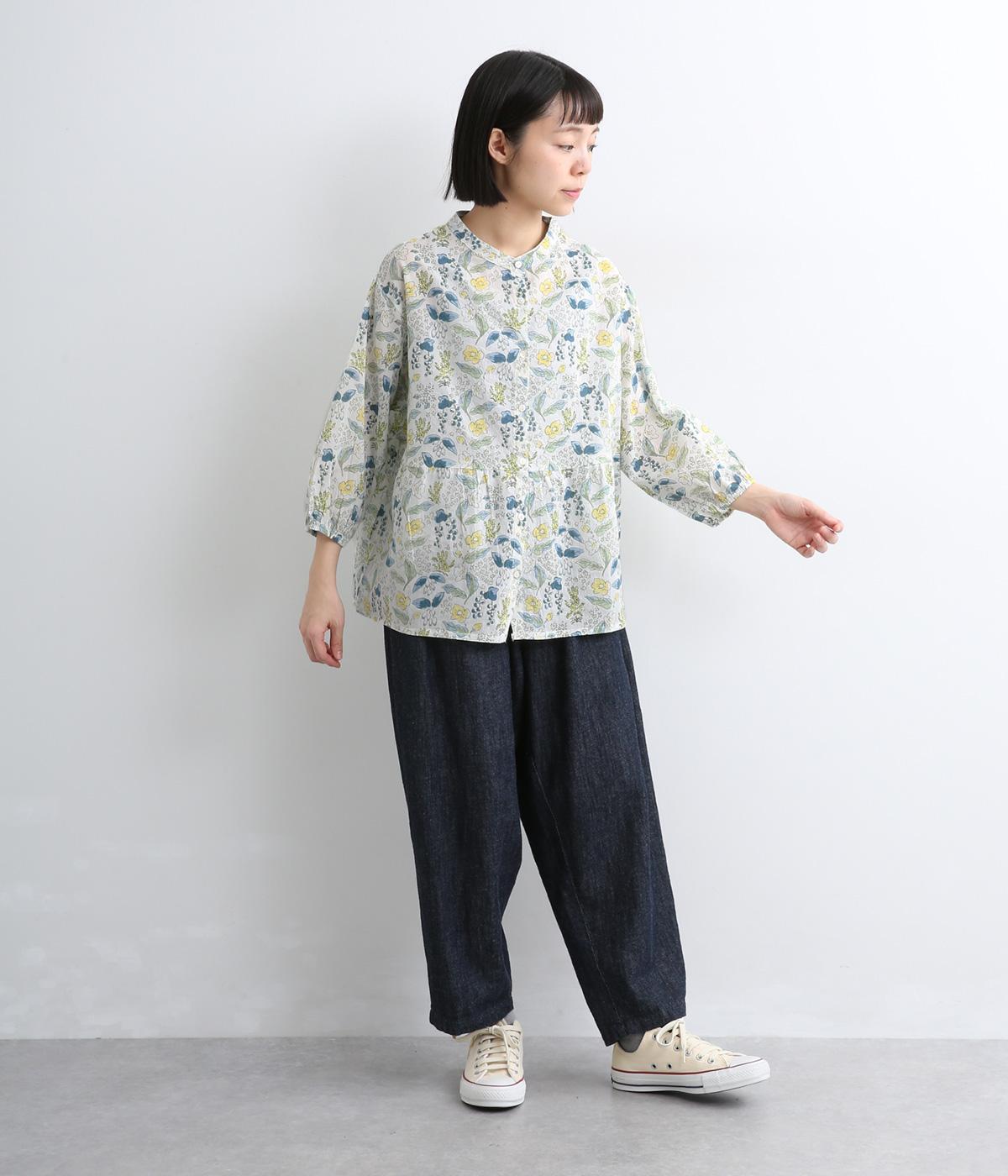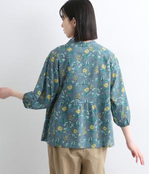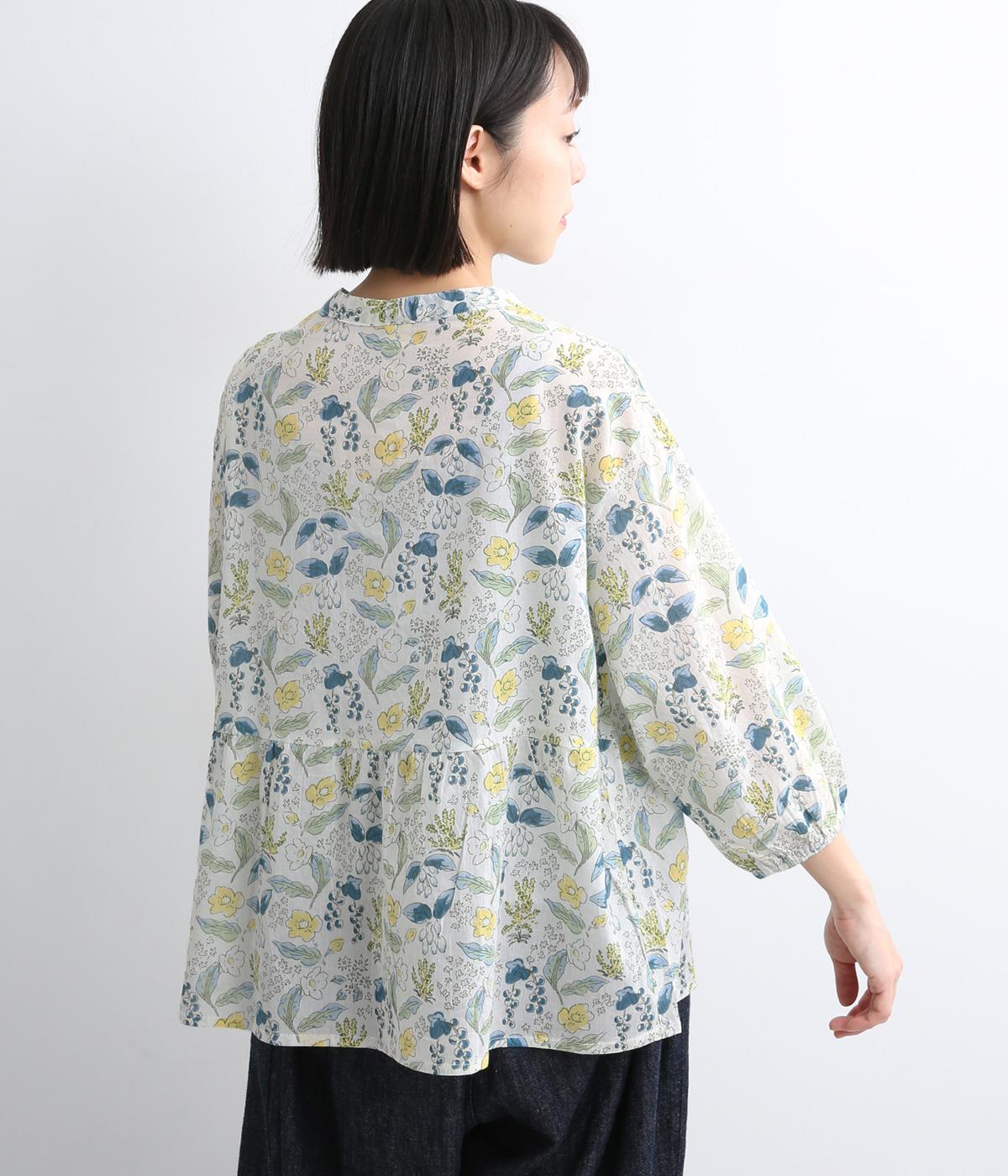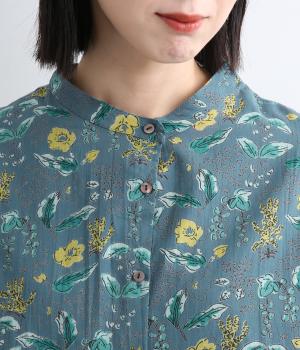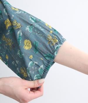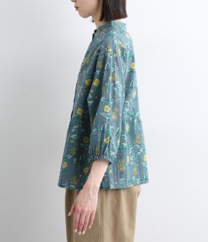 華やかだけど甘すぎない、大人のためのスクレフラワー柄シャツ。七分袖が手元をすっきり見せ、袖口ゴムなので半袖にたくし上げても◎。シンプルなスタンドネックに前あき仕様で羽織り使いもおすすめです。