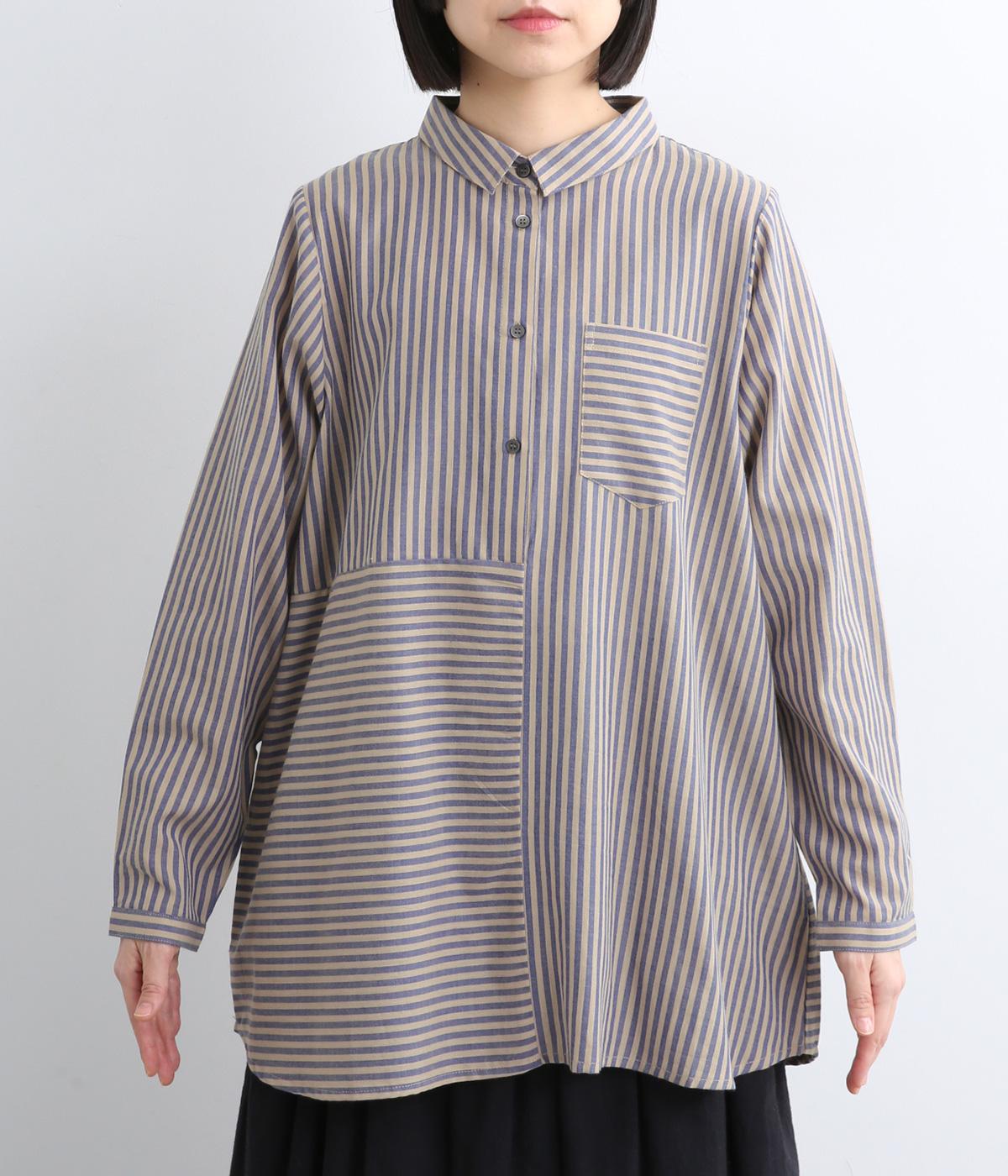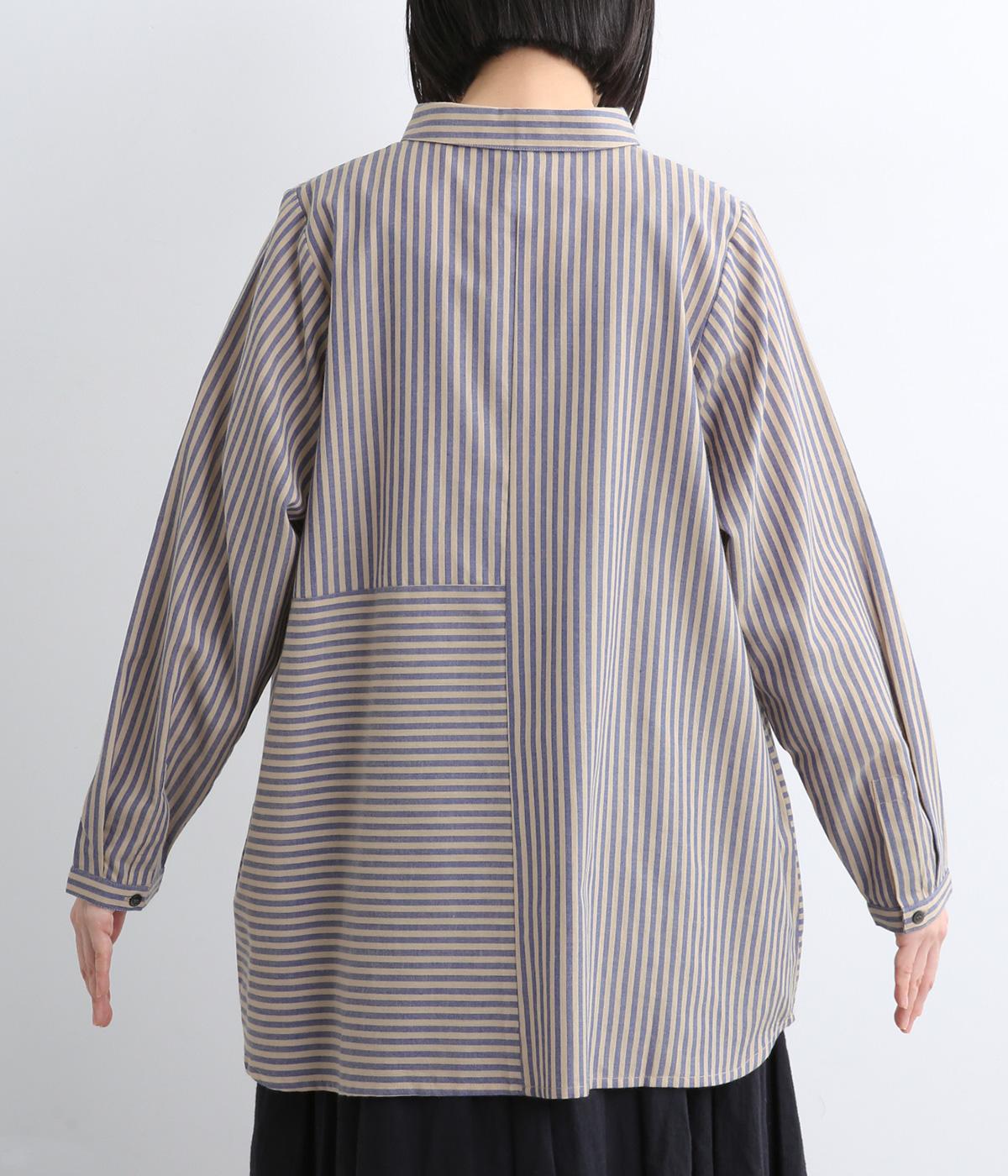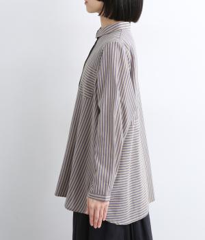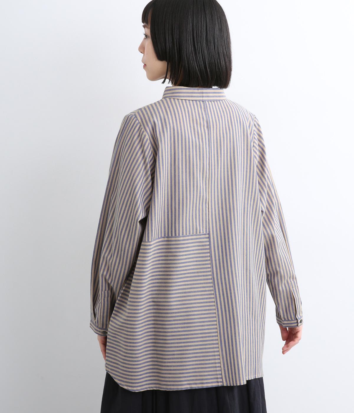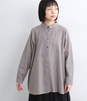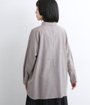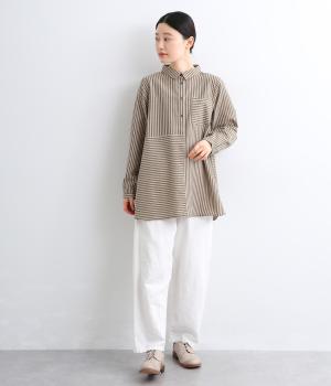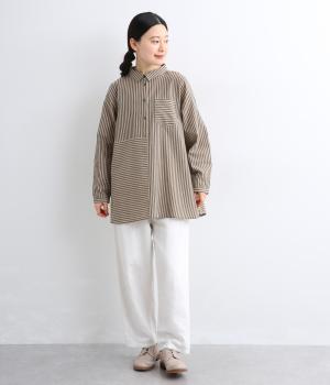 手織り風のストライプ柄がナチュラルな表情を引き立てます。ストライプの向きに変化をつけ、メリハリのある印象に。襟付きのヘンリーネックがさりげない個性を添え、ひとひねり効いた大人のカジュアルアイテムに仕上げました。