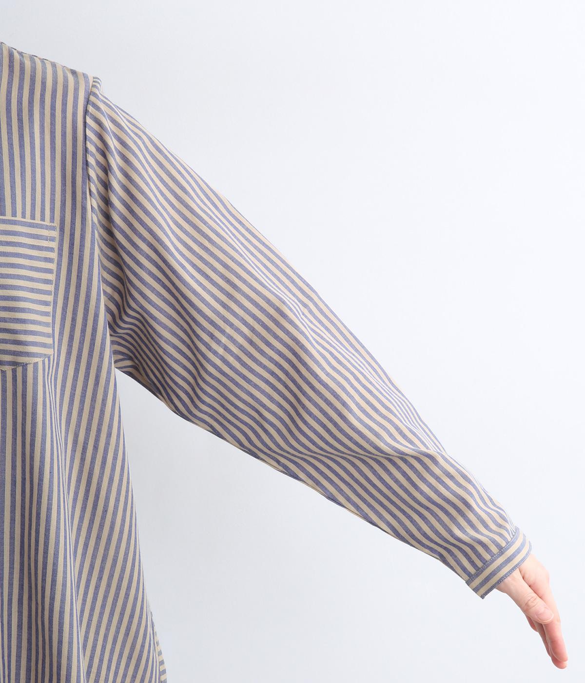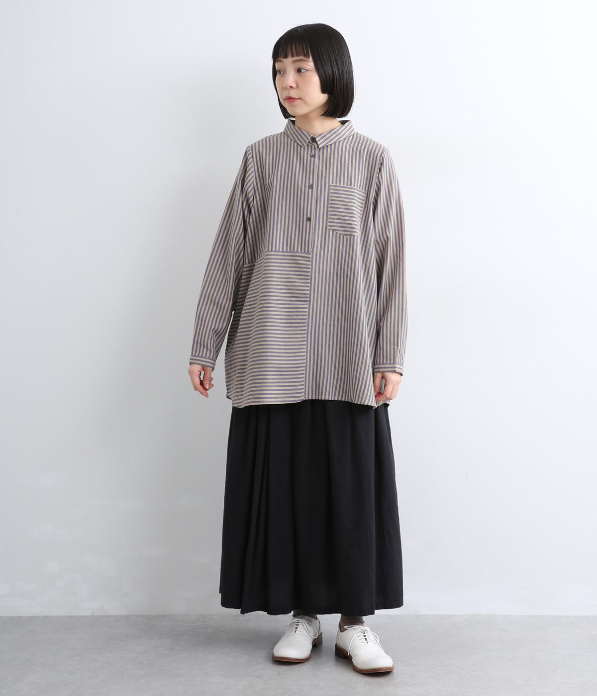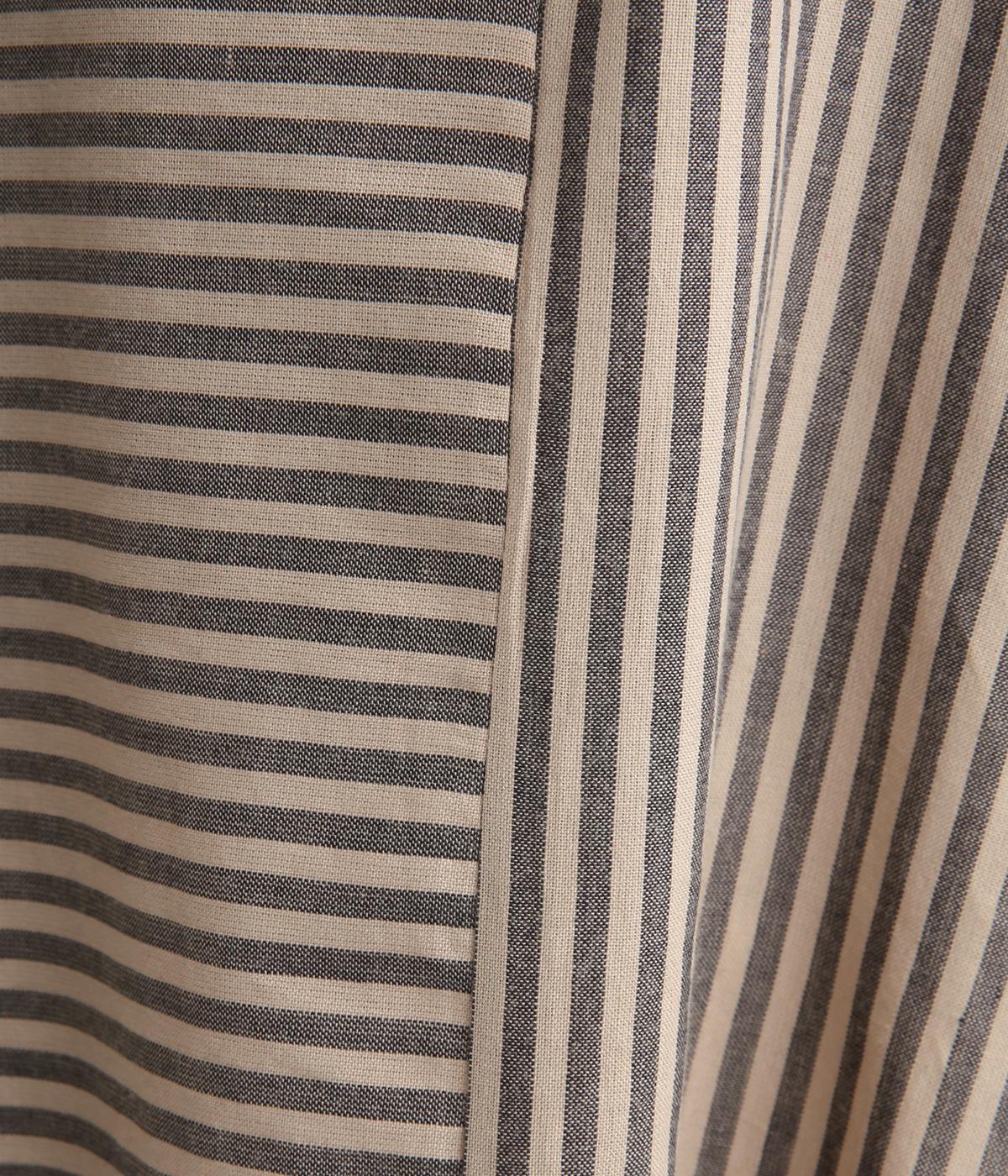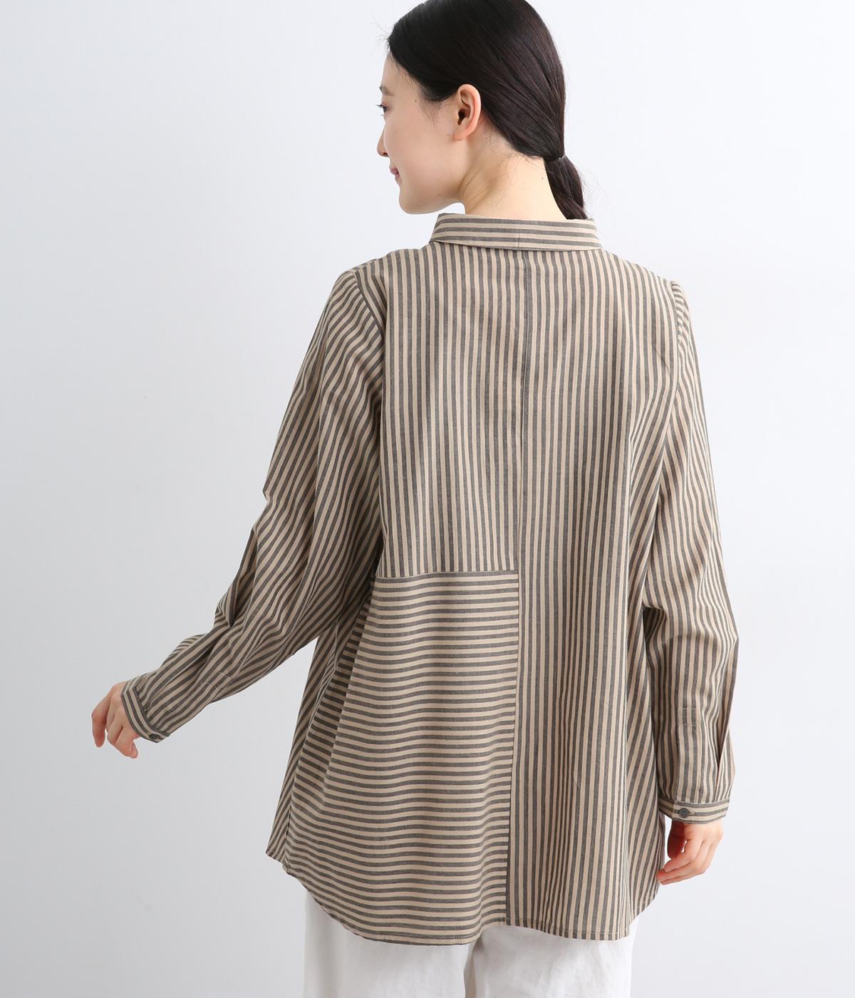 手織り風のストライプ柄がナチュラルな表情を引き立てます。ストライプの向きに変化をつけ、メリハリのある印象に。襟付きのヘンリーネックがさりげない個性を添え、ひとひねり効いた大人のカジュアルアイテムに仕上げました。