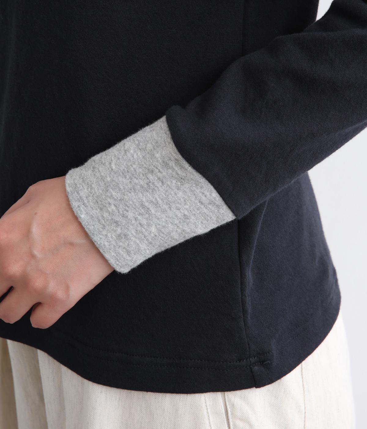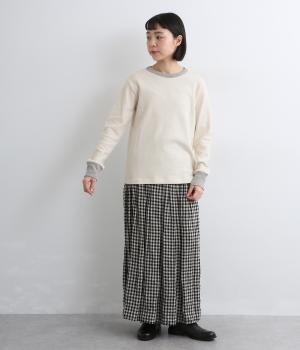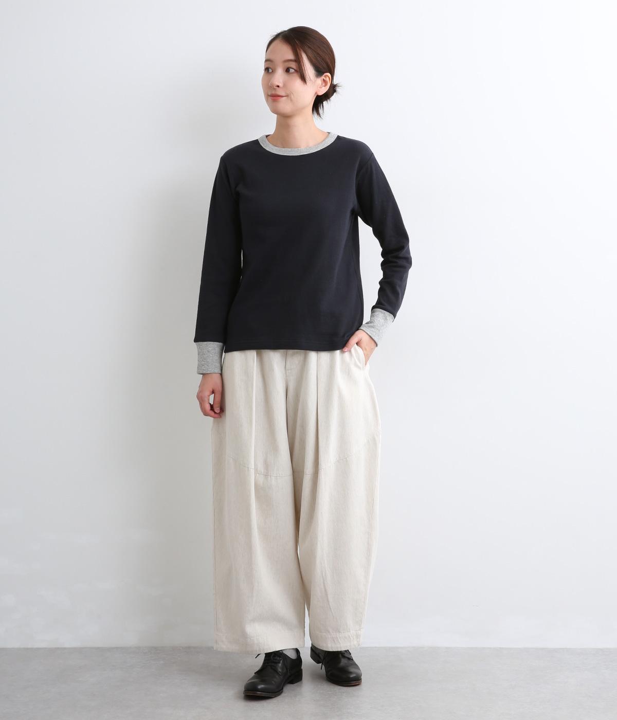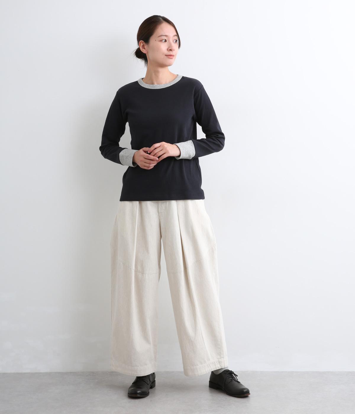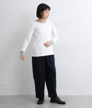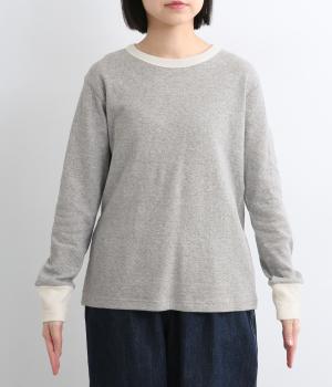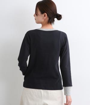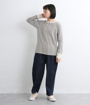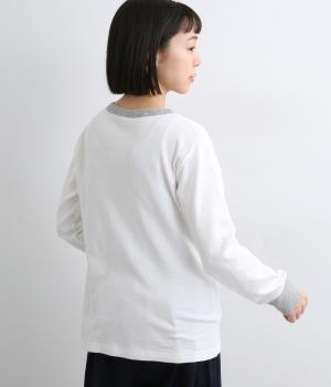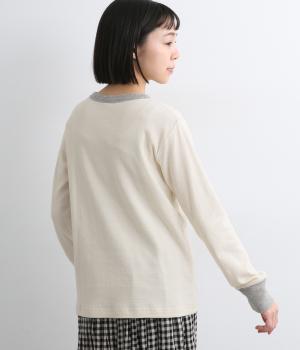 襟ぐりと袖口のバイカラーがカジュアルアイテムながらも洗練された印象を与えます。ゆるすぎずフィットしすぎない絶妙なシルエットもポイントで、一枚着でも手抜きに見えずデイリースタイルの定番になりそう。