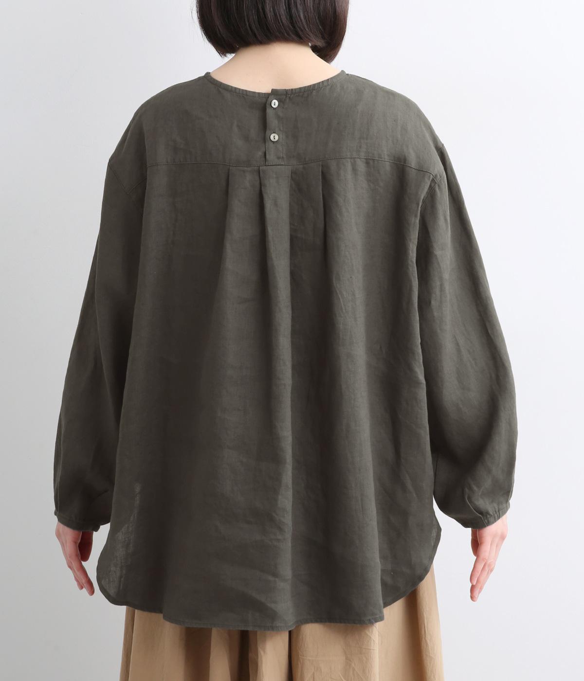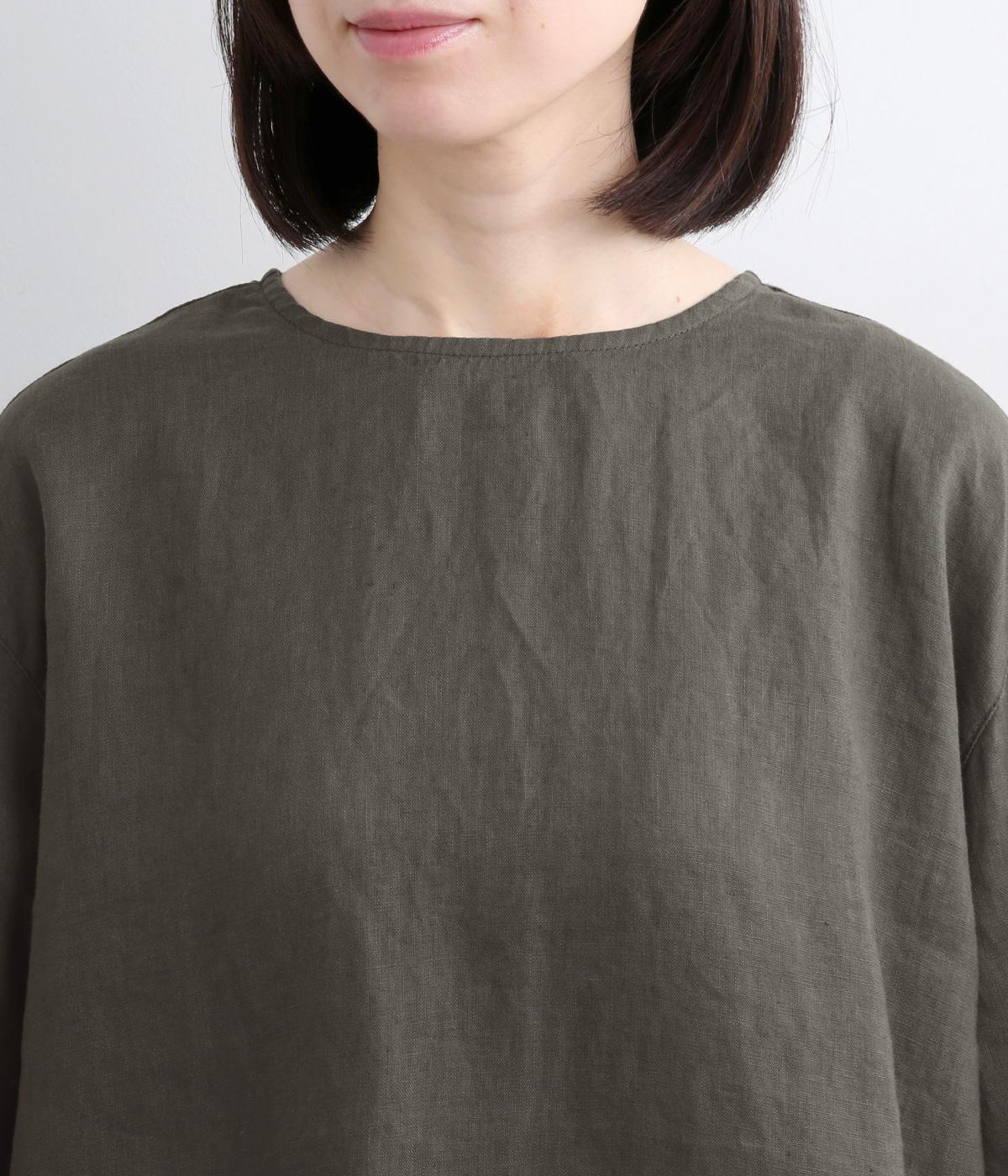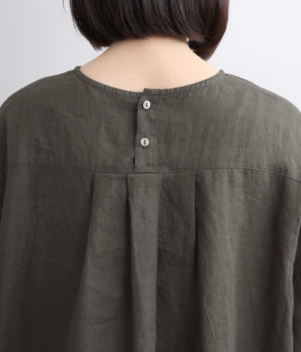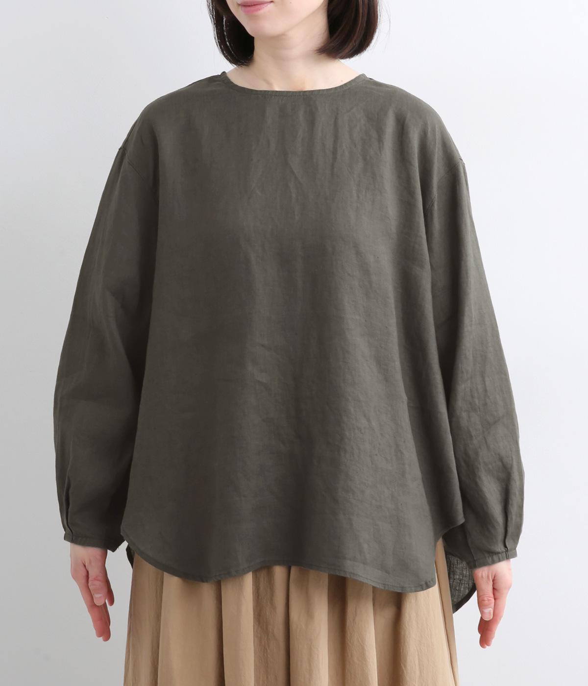 後ろタックでゆったりとしたフレアシルエットを描くプルオーバー。リネンならではの質感が自然なドレープを描き、ナチュラルな中にも優雅な印象が漂います。トップスアウトもお洒落にきまる着丈に前後差をつけたラウンドヘム仕様です。