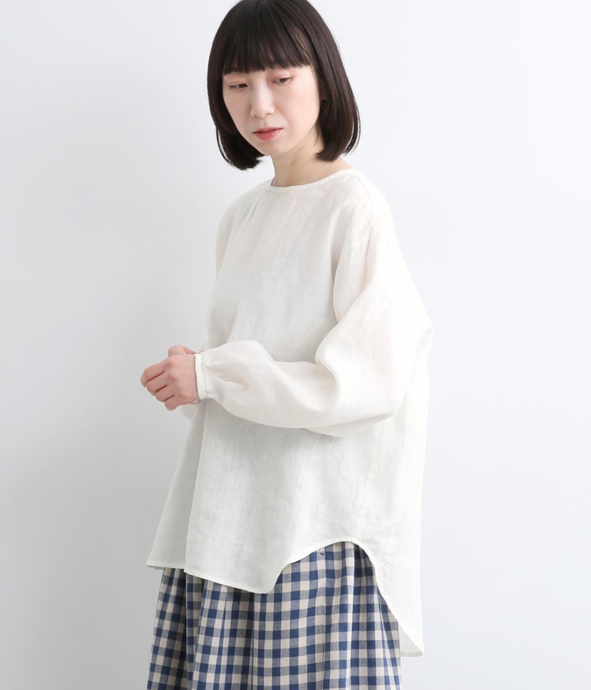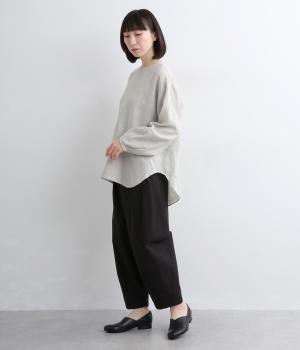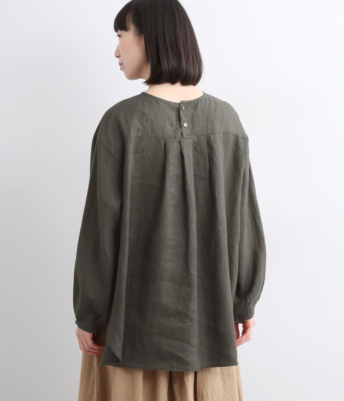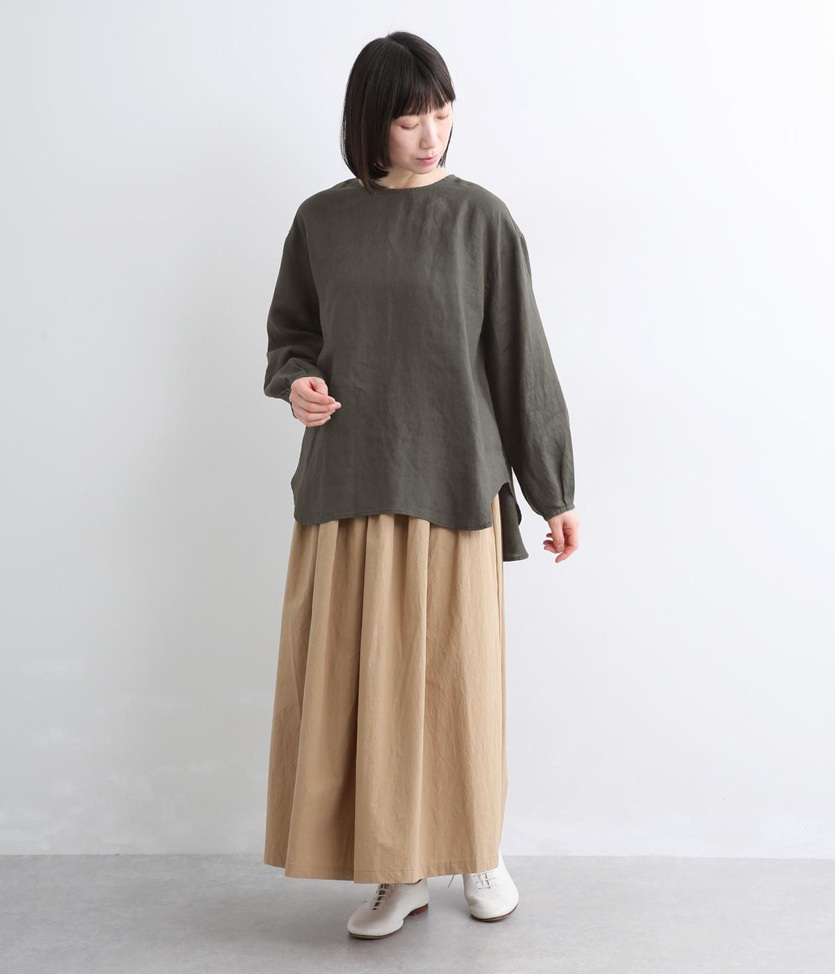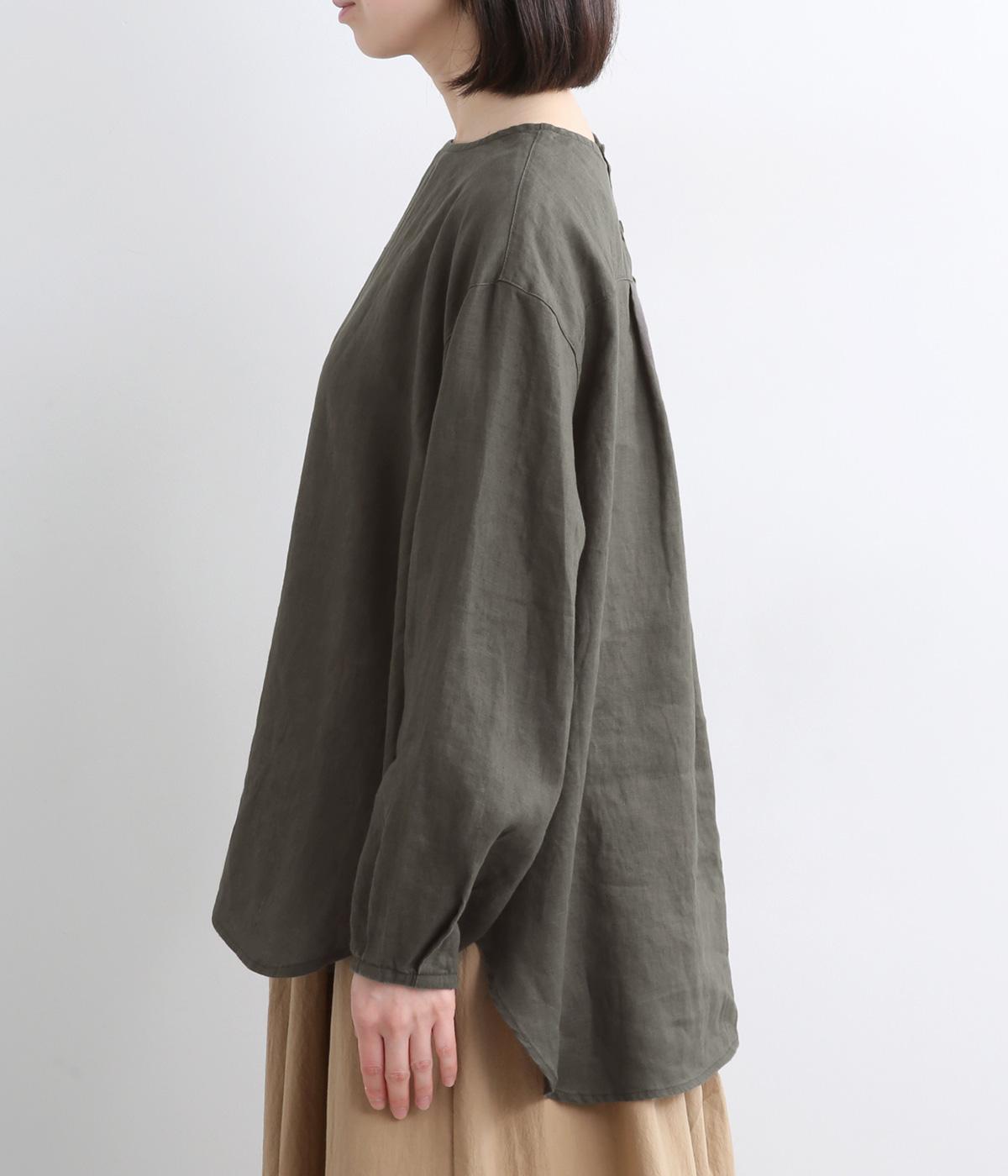 後ろタックでゆったりとしたフレアシルエットを描くプルオーバー。リネンならではの質感が自然なドレープを描き、ナチュラルな中にも優雅な印象が漂います。トップスアウトもお洒落にきまる着丈に前後差をつけたラウンドヘム仕様です。