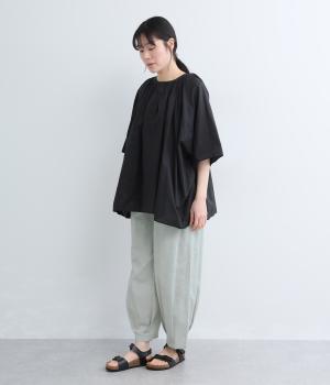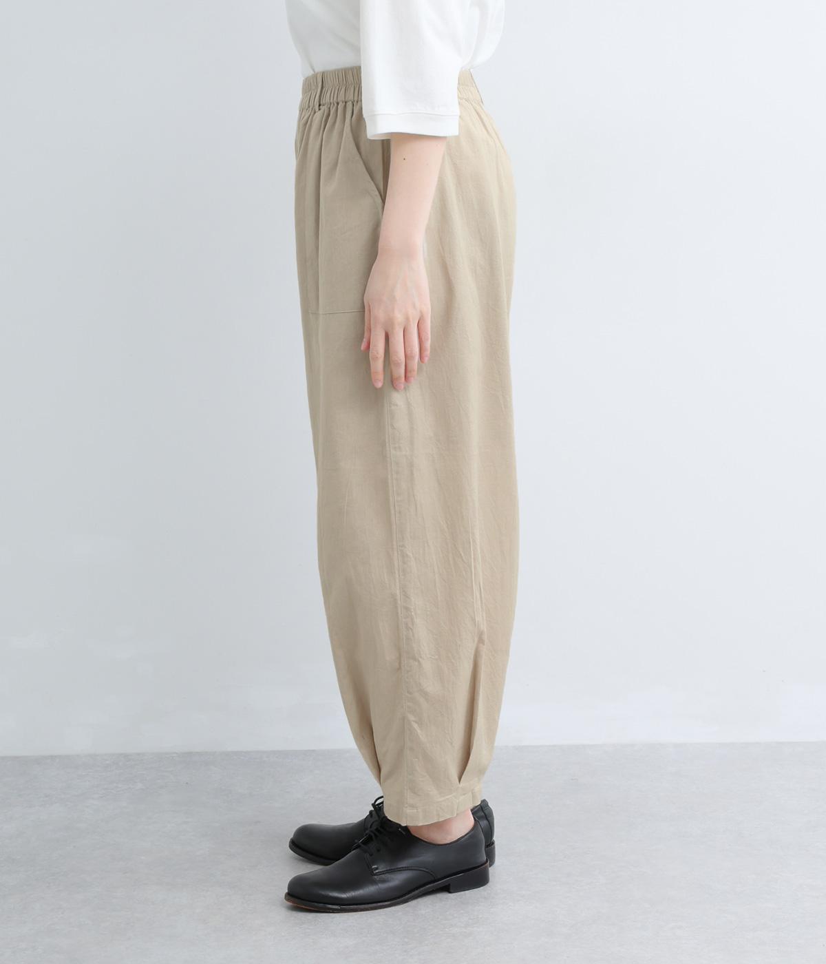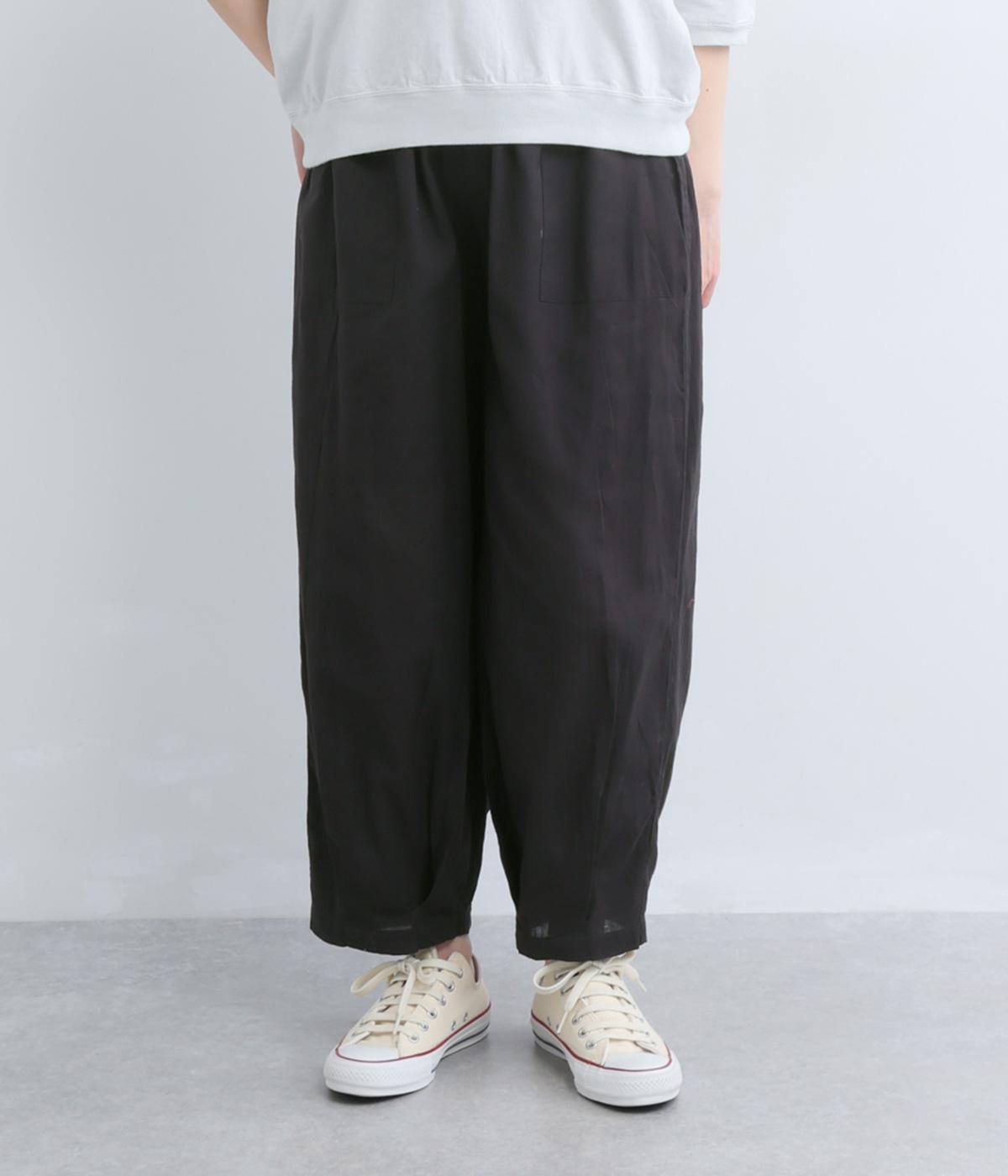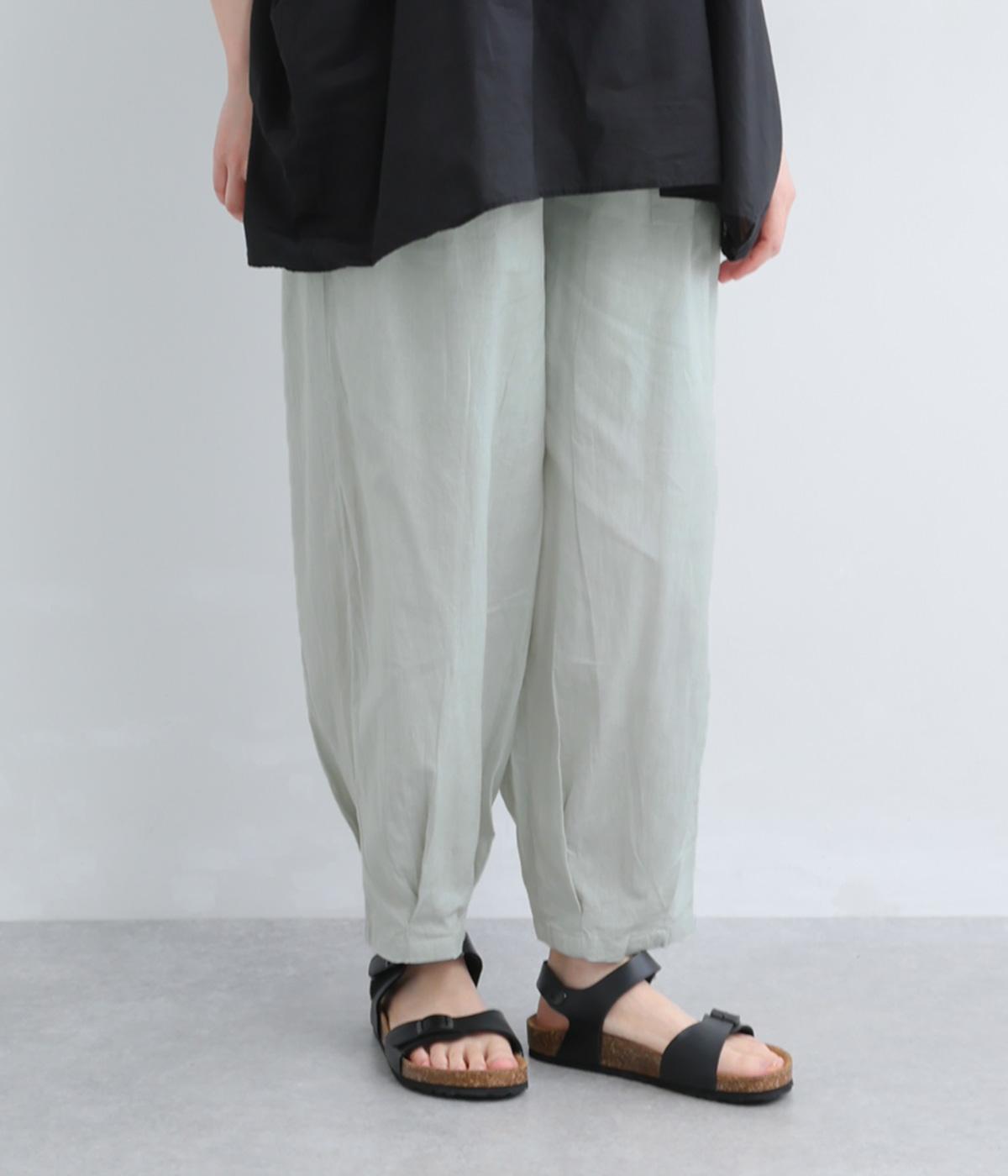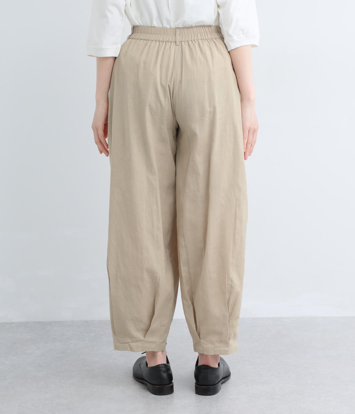 裾に向かって緩やかに丸みを帯びたバルーンシルエット。裾にほどこしたタックが足元に立体感を生み、こなれた表情をつくります。腰まわりの裏地が安心感を高めつつ、足元には軽やかな透け感を残した仕上がりです。