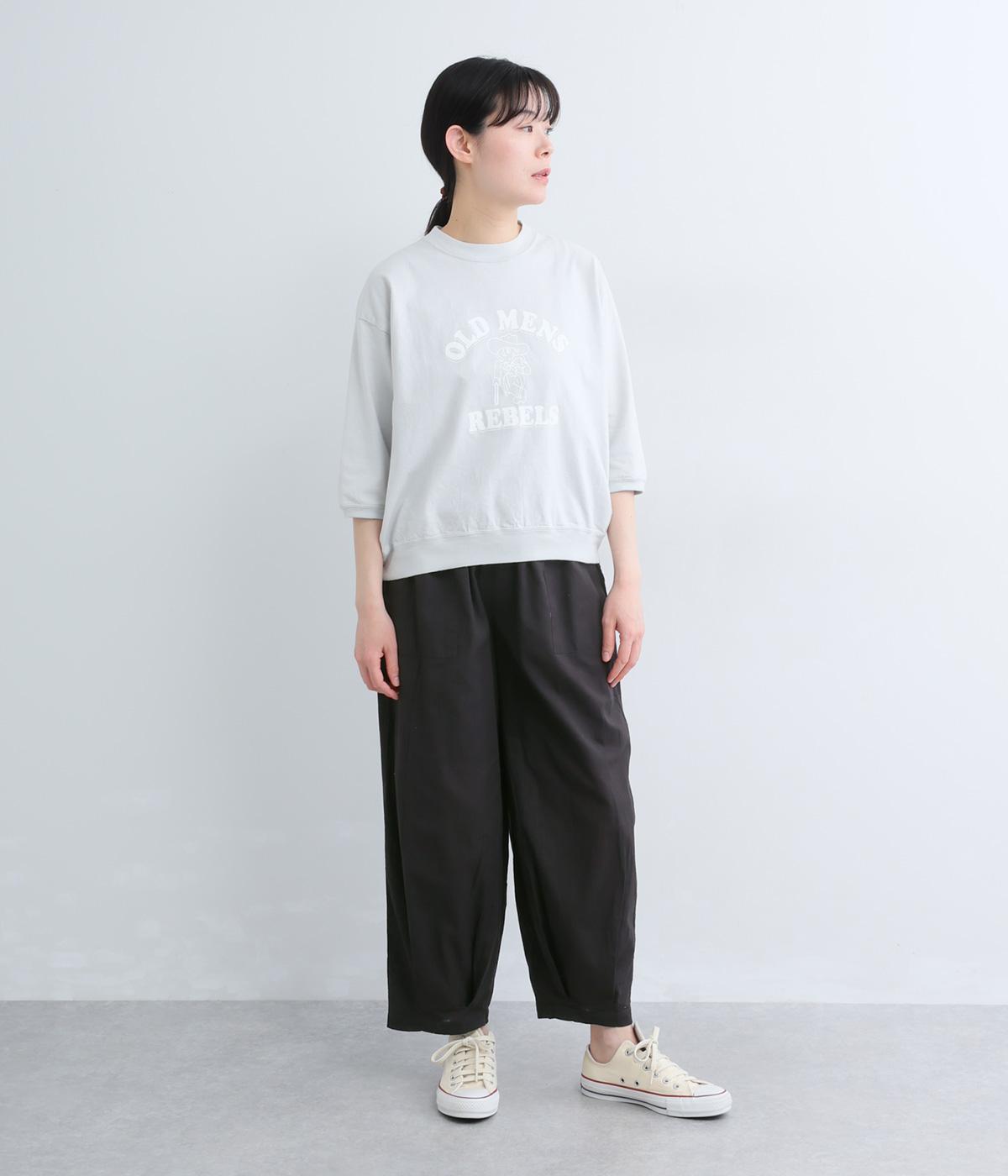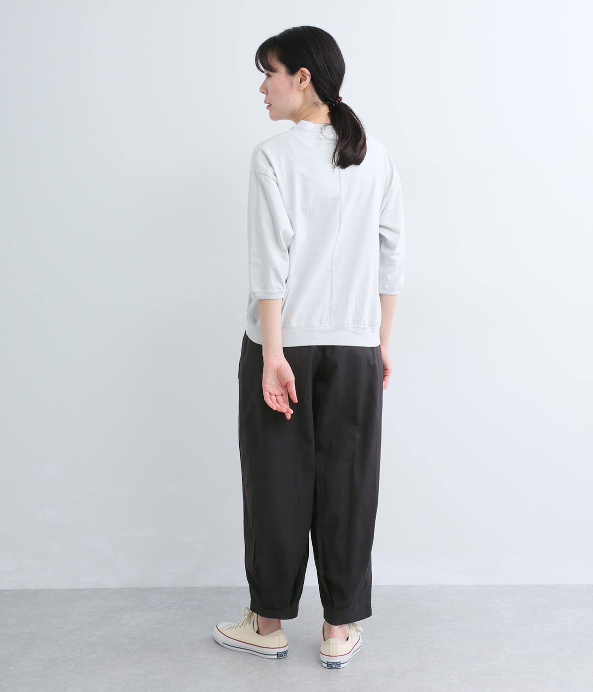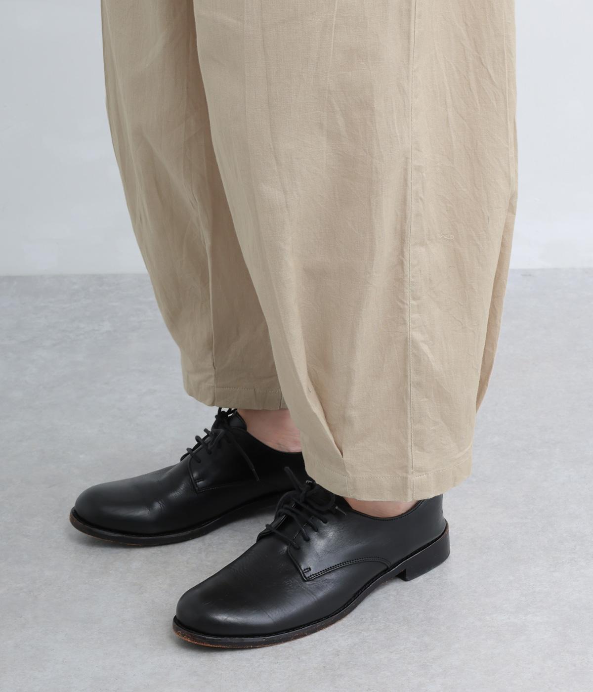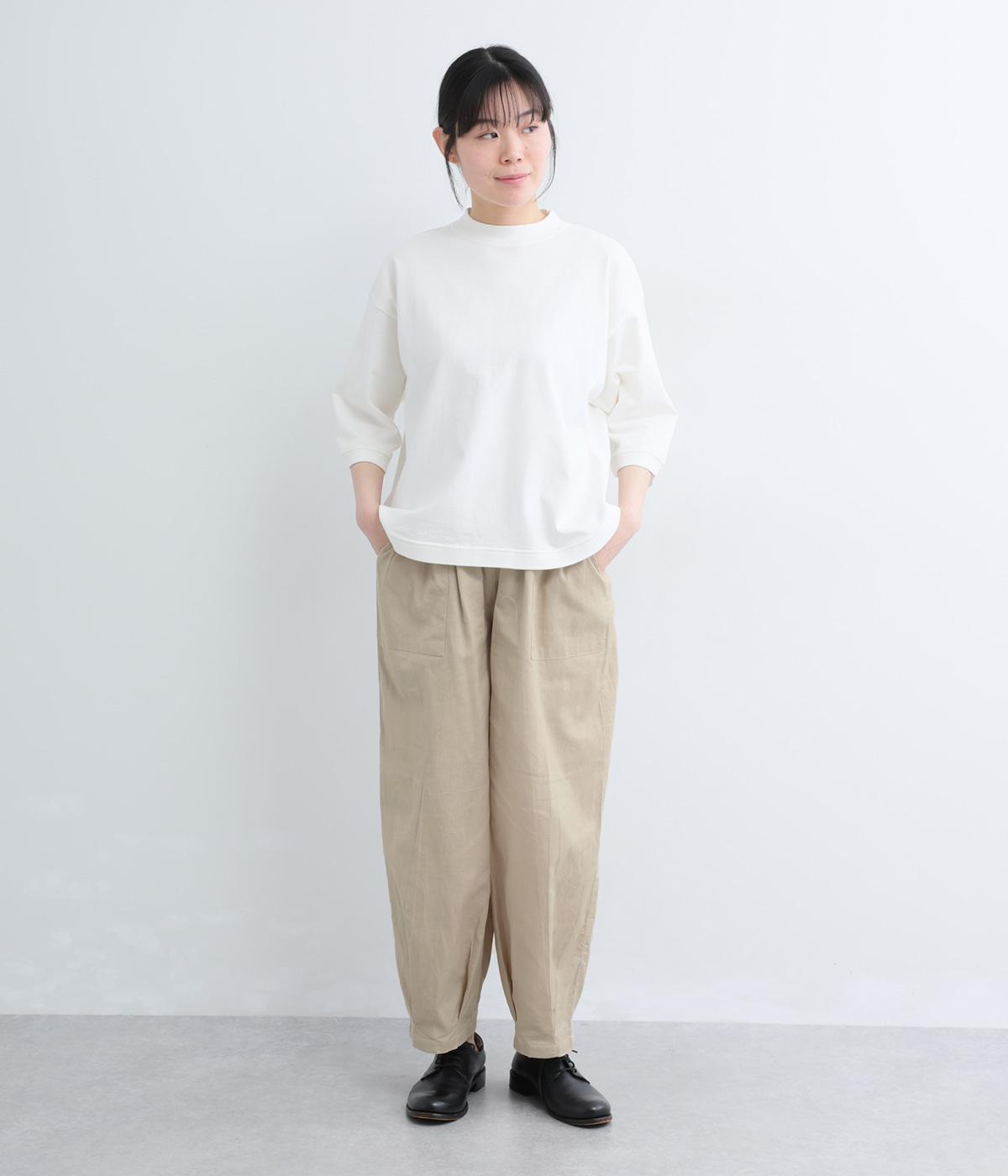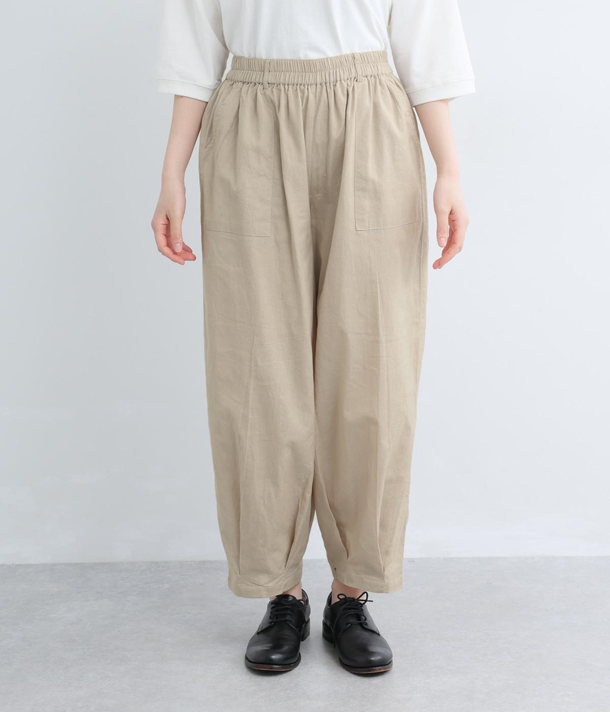 裾に向かって緩やかに丸みを帯びたバルーンシルエット。裾にほどこしたタックが足元に立体感を生み、こなれた表情をつくります。腰まわりの裏地が安心感を高めつつ、足元には軽やかな透け感を残した仕上がりです。