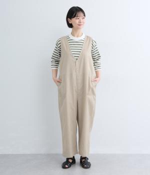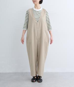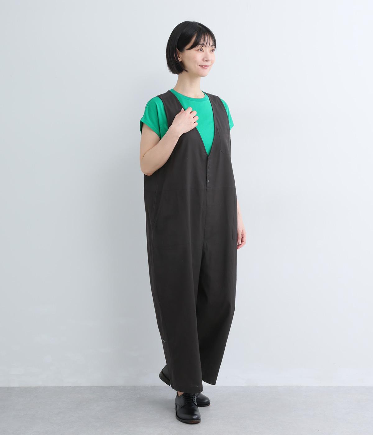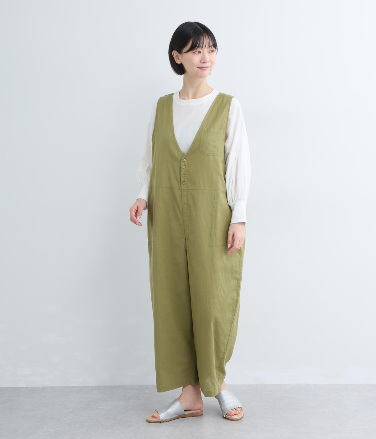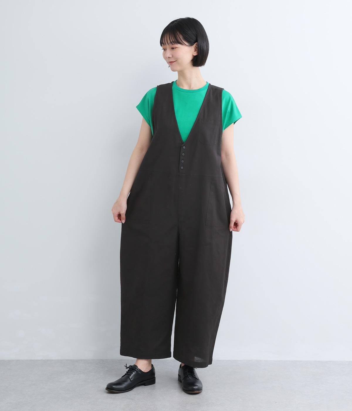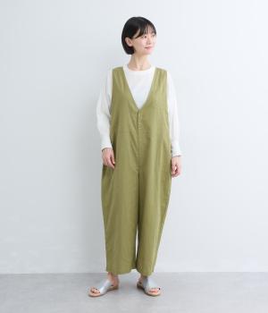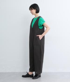 深めのVネックが顔まわりをすっきりと見せてくれるオーバーオール。胸元のフロントボタンがミニマルなアクセントになり、ウエストの切り替えが全体のバランスを整えます。裏地付きで安心して穿けるのも嬉しいポイントです。
