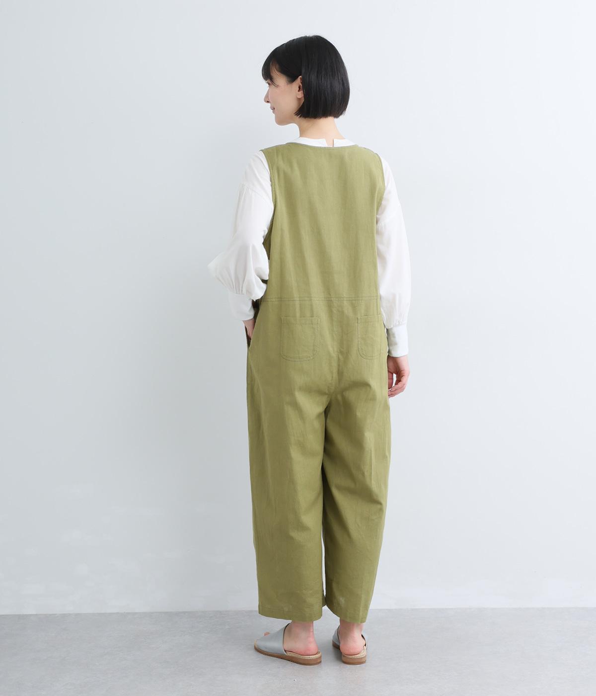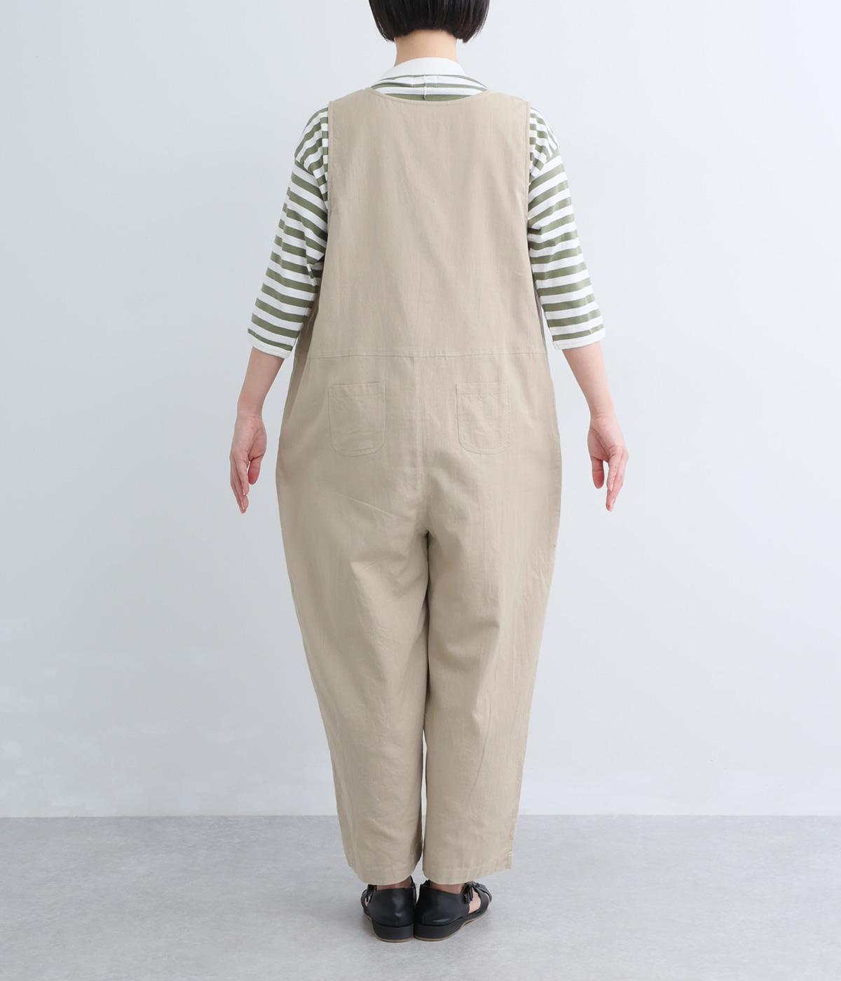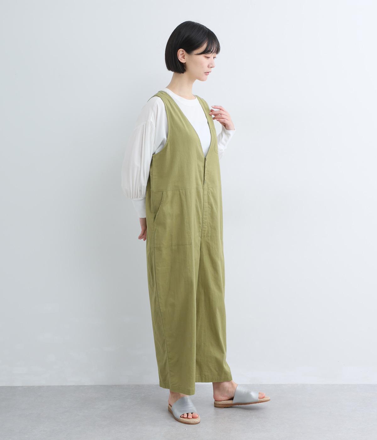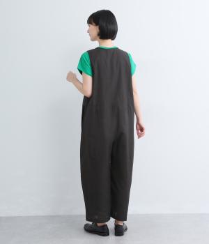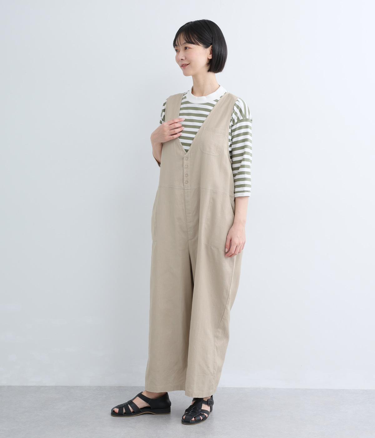 深めのVネックが顔まわりをすっきりと見せてくれるオーバーオール。胸元のフロントボタンがミニマルなアクセントになり、ウエストの切り替えが全体のバランスを整えます。裏地付きで安心して穿けるのも嬉しいポイントです。