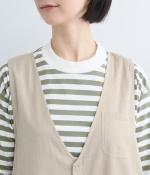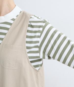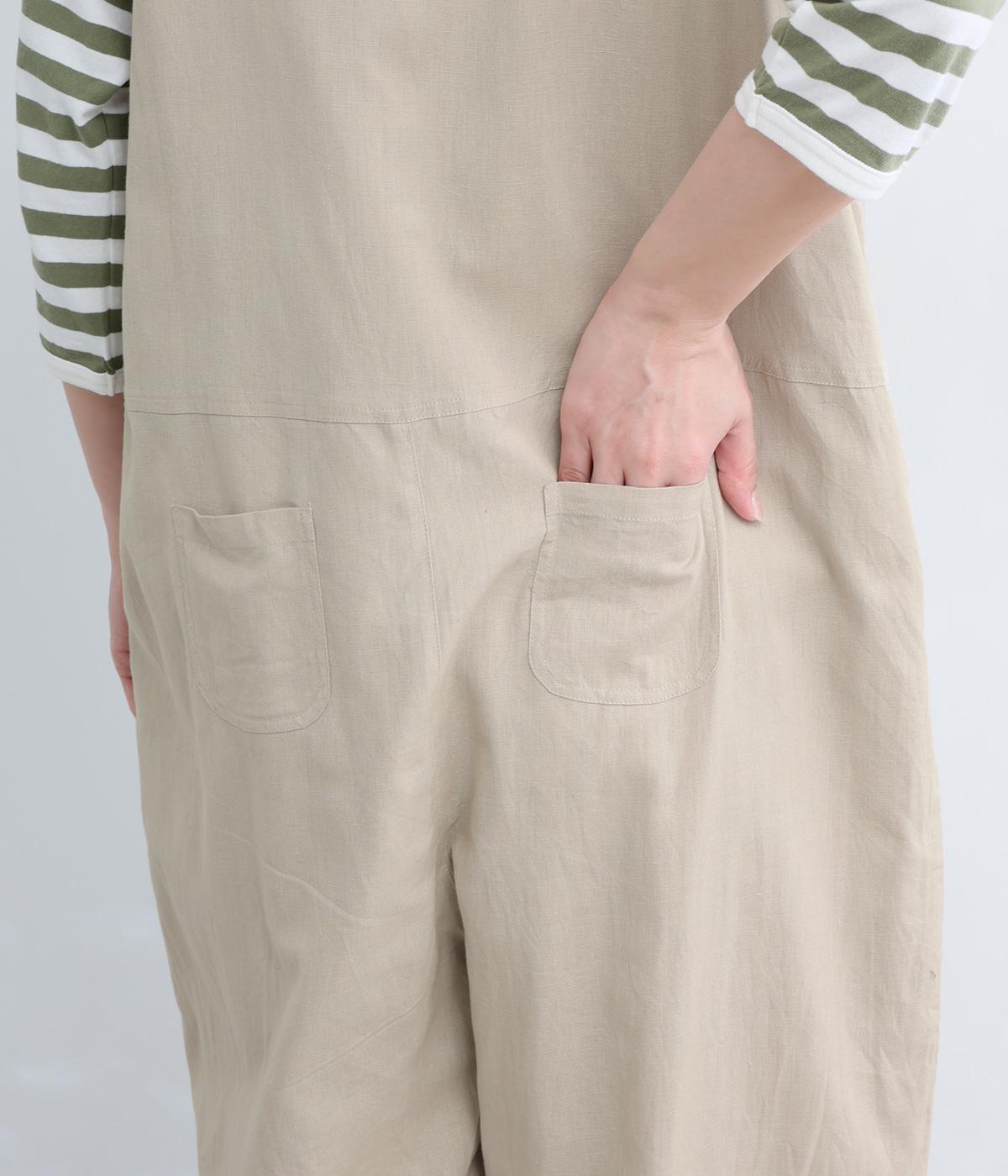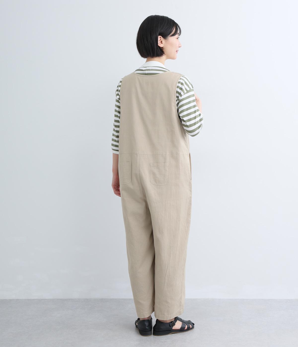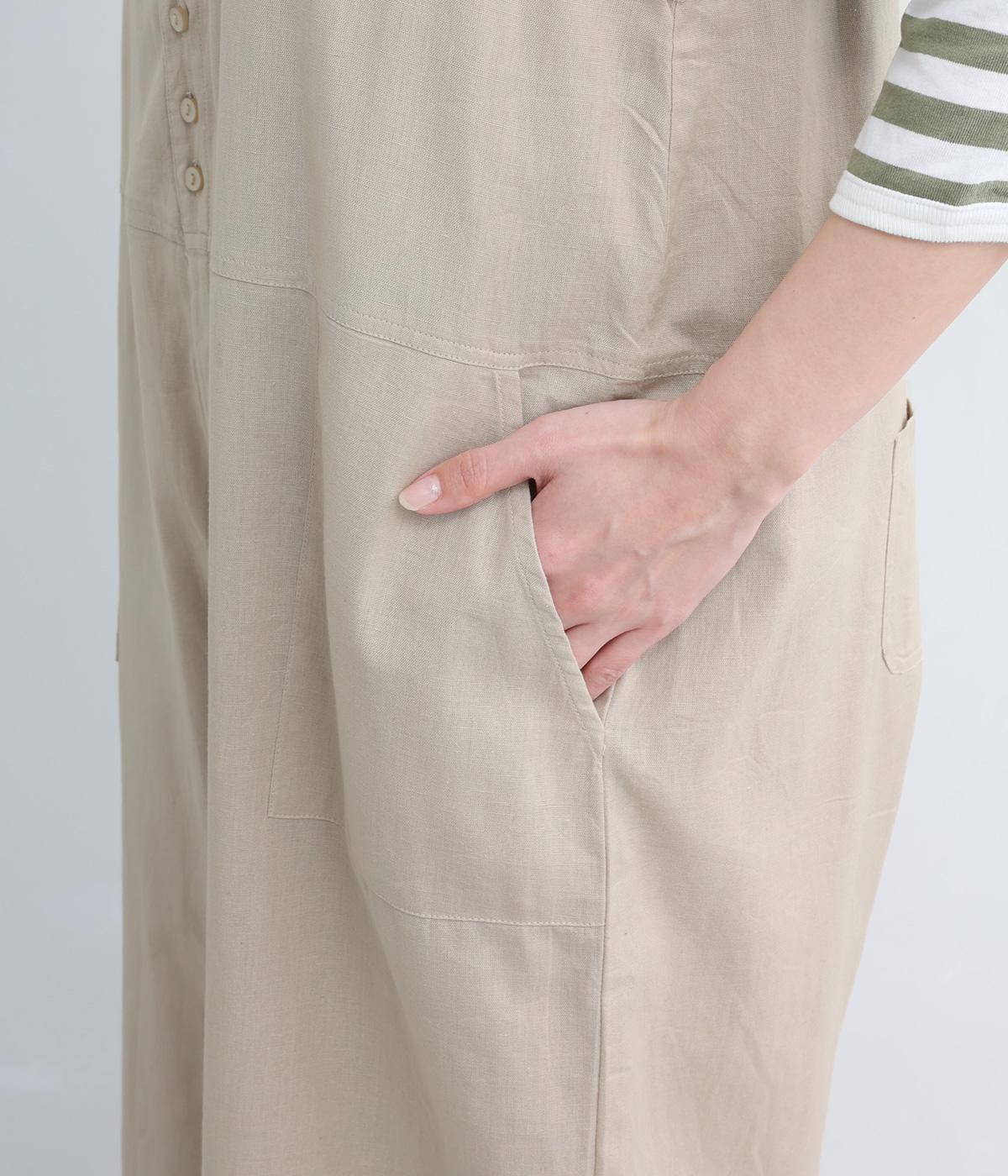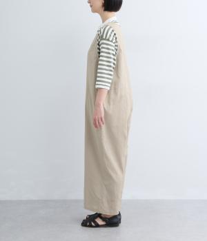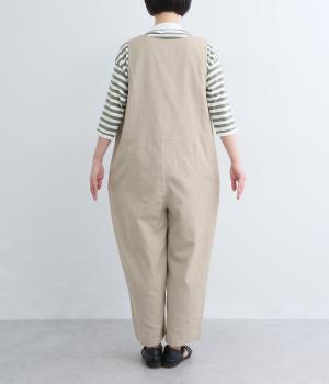 深めのVネックが顔まわりをすっきりと見せてくれるオーバーオール。胸元のフロントボタンがミニマルなアクセントになり、ウエストの切り替えが全体のバランスを整えます。裏地付きで安心して穿けるのも嬉しいポイントです。