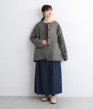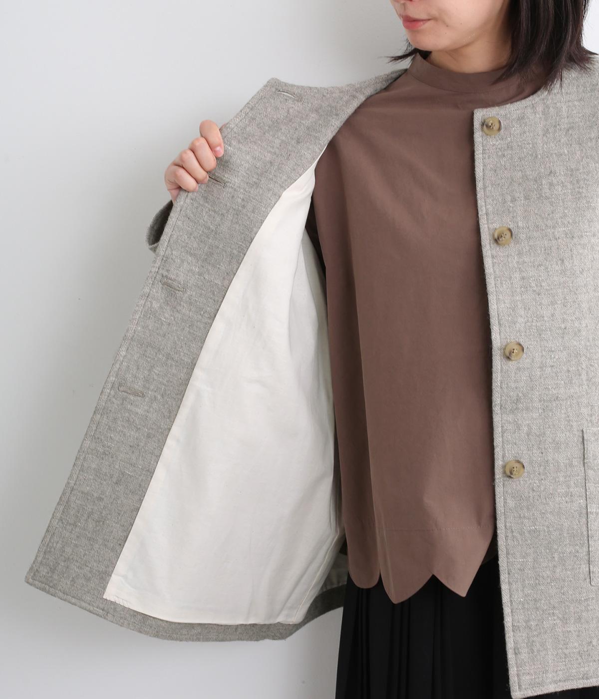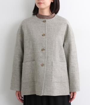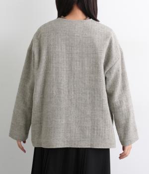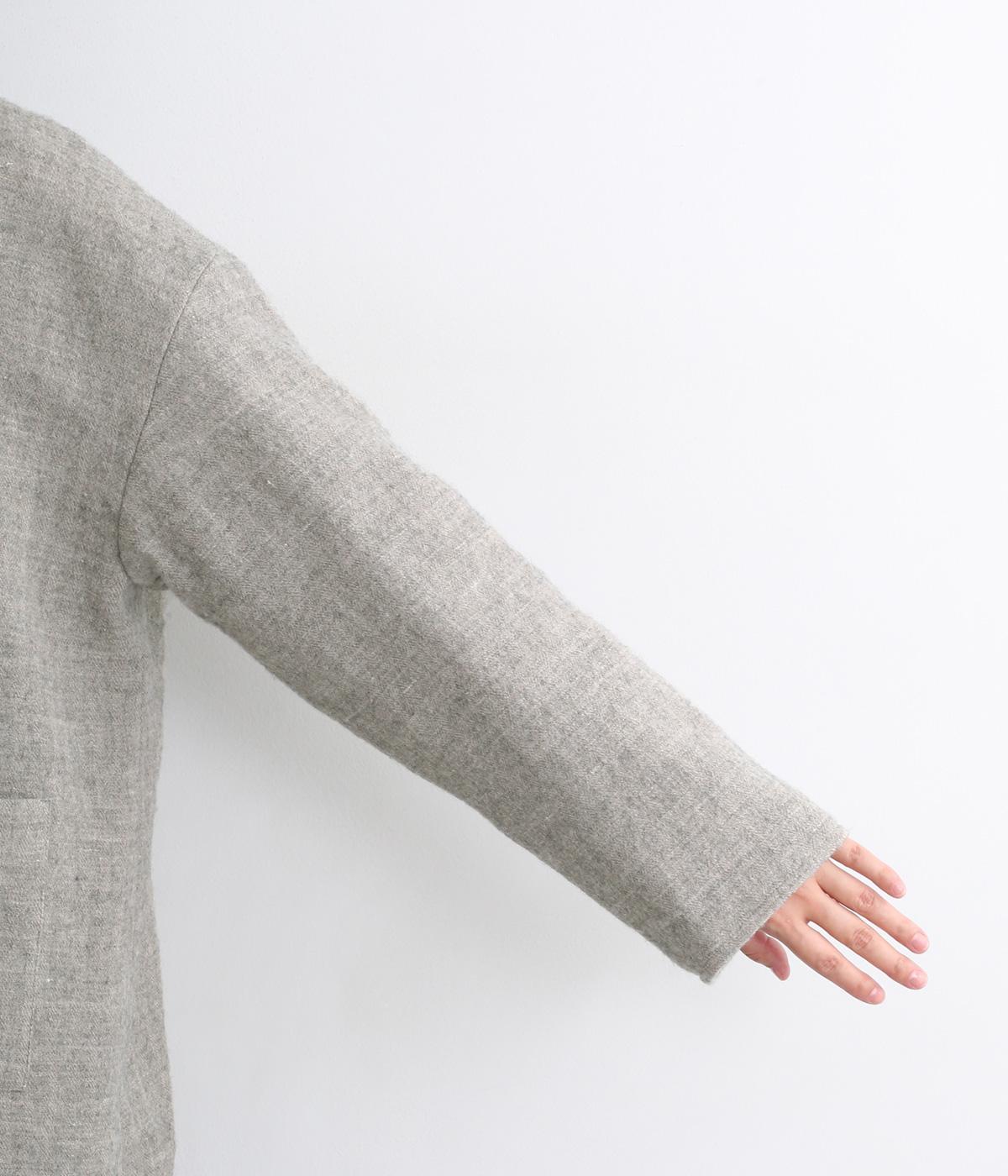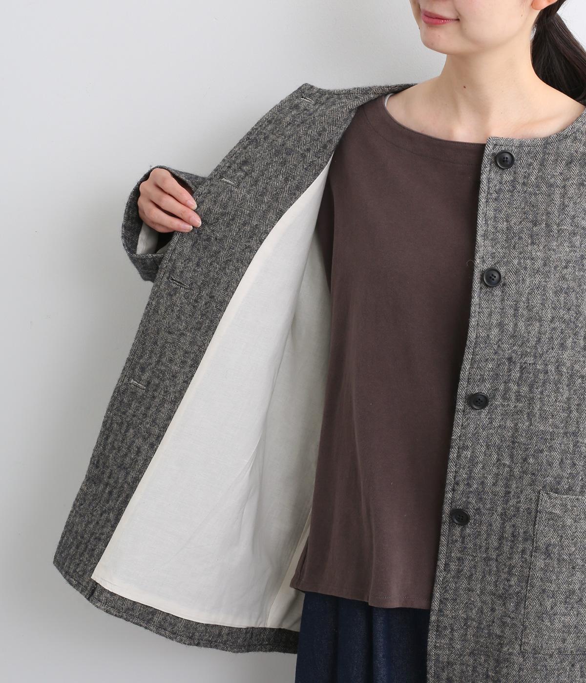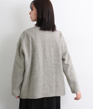 ウールの保温性と、リネンのシャリ感を持ち合わせた素材。ほどよい毛羽感とふっくらした風合いが特徴です。裏地は身頃にコットン、袖にポリエステルを使い袖通しのよさも考えています。