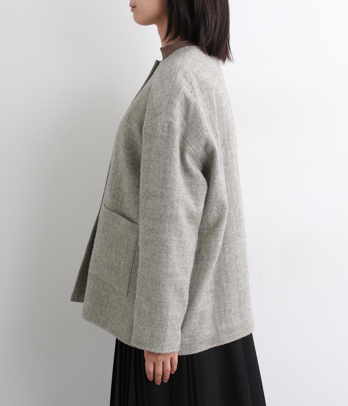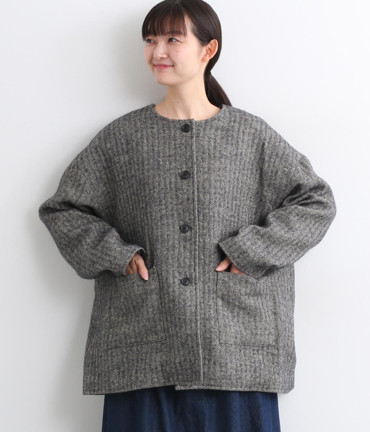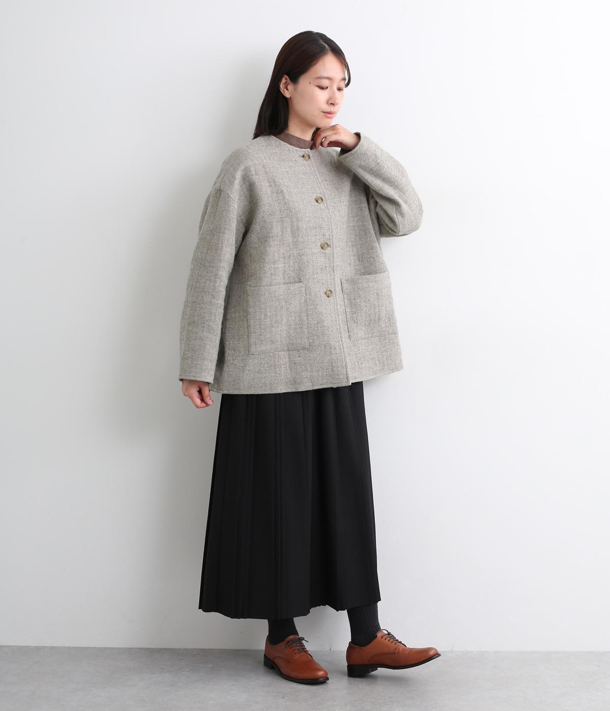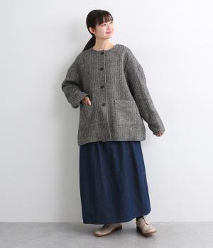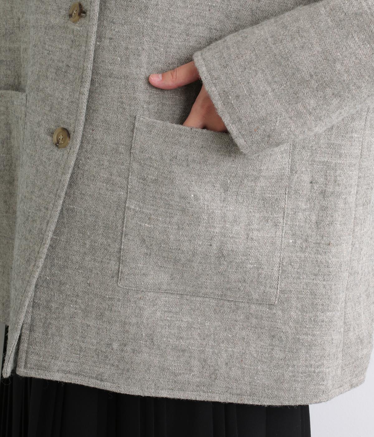 ウールの保温性と、リネンのシャリ感を持ち合わせた素材。ほどよい毛羽感とふっくらした風合いが特徴です。裏地は身頃にコットン、袖にポリエステルを使い袖通しのよさも考えています。