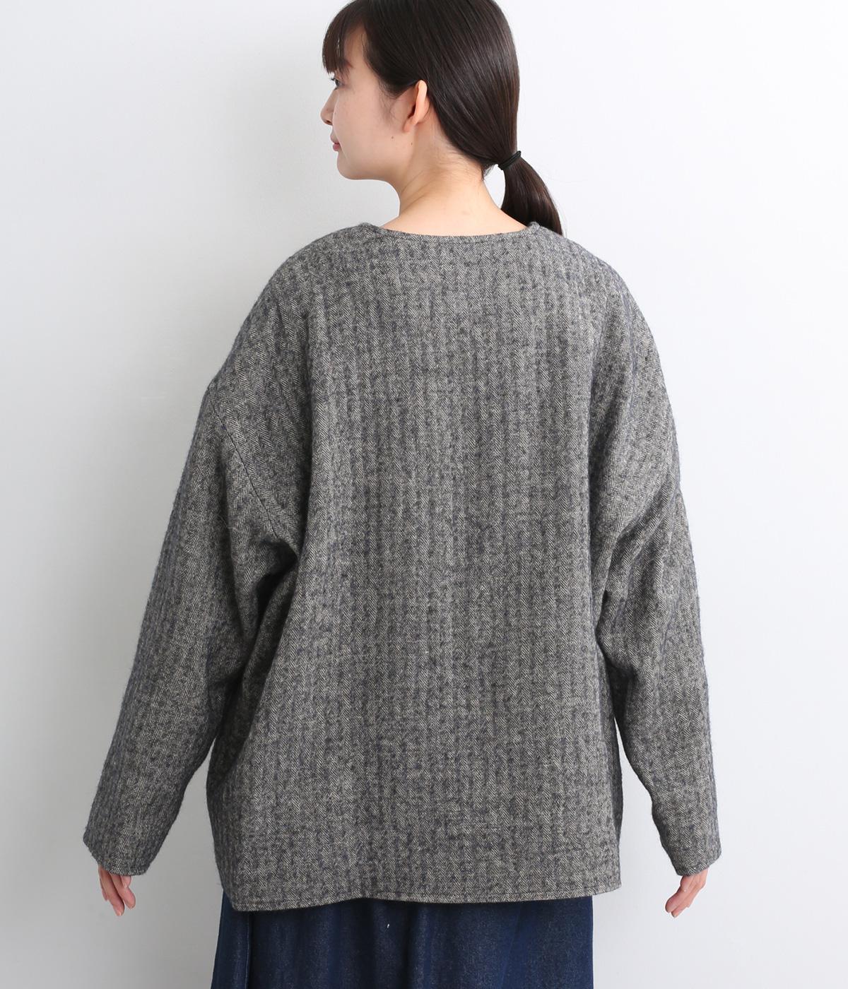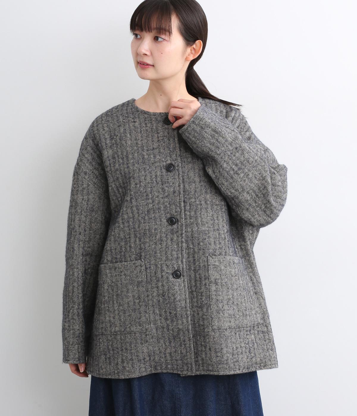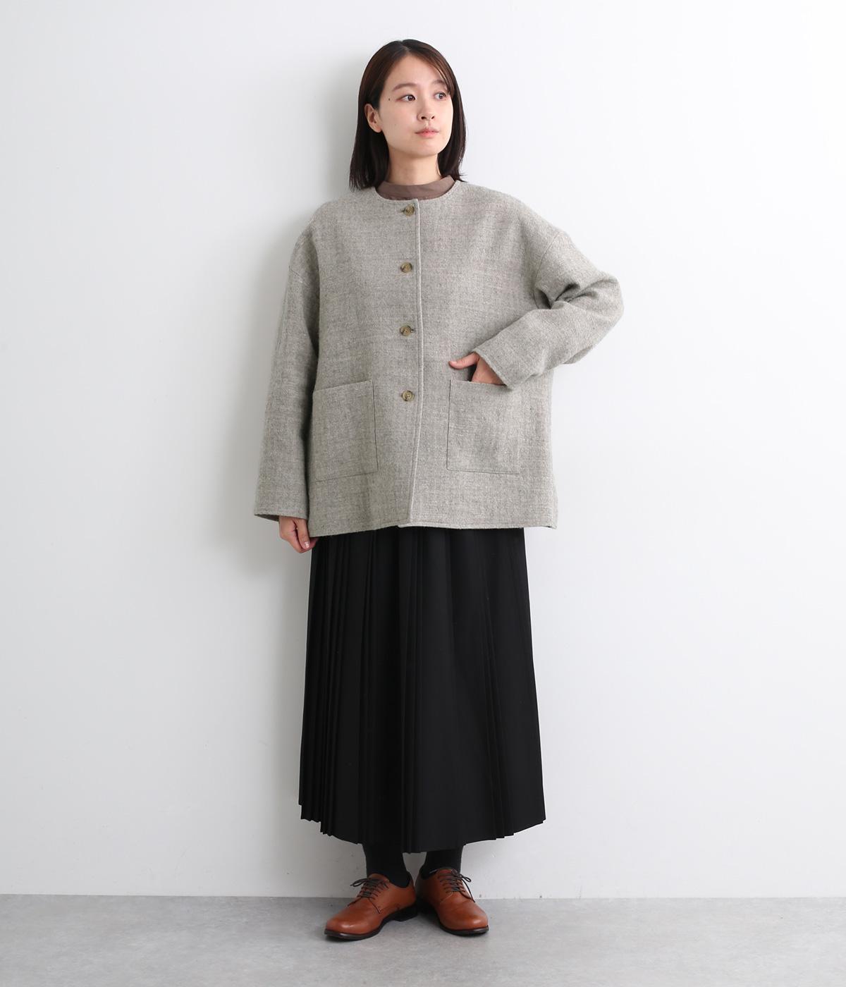 ウールの保温性と、リネンのシャリ感を持ち合わせた素材。ほどよい毛羽感とふっくらした風合いが特徴です。裏地は身頃にコットン、袖にポリエステルを使い袖通しのよさも考えています。