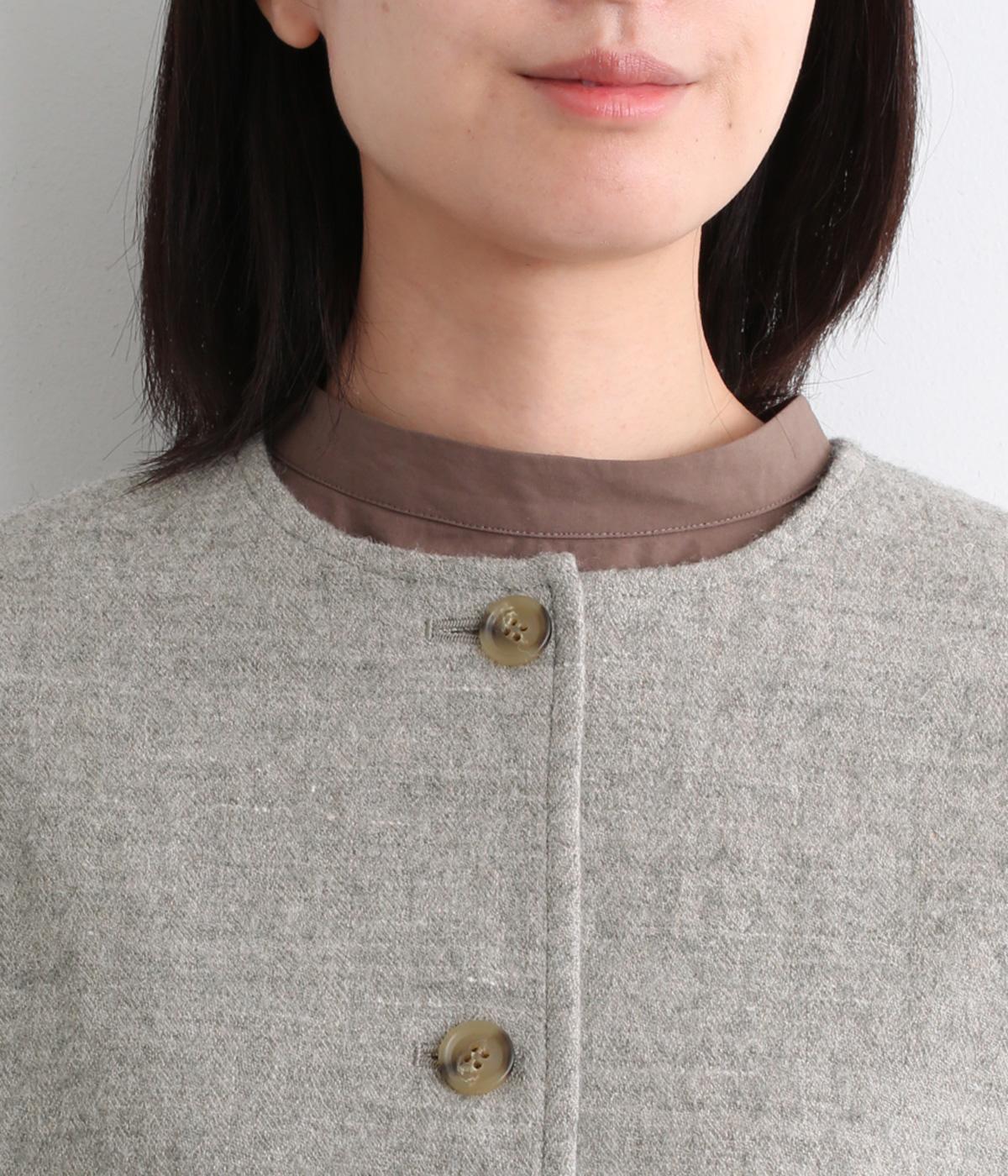 ノーカラータイプの前ボタンジャケット。すっきりとしたデザインの中に、ボタンでナチュラルさをプラスしました。直線的なポケット使いで、甘すぎず凛とした表情をプラス。ほどよい厚みで着ぶくれしにくく、レイヤードも楽しめます。