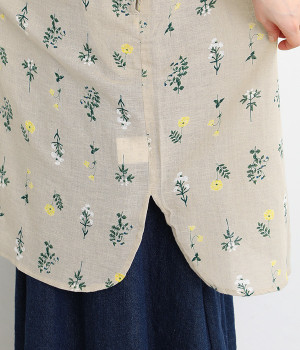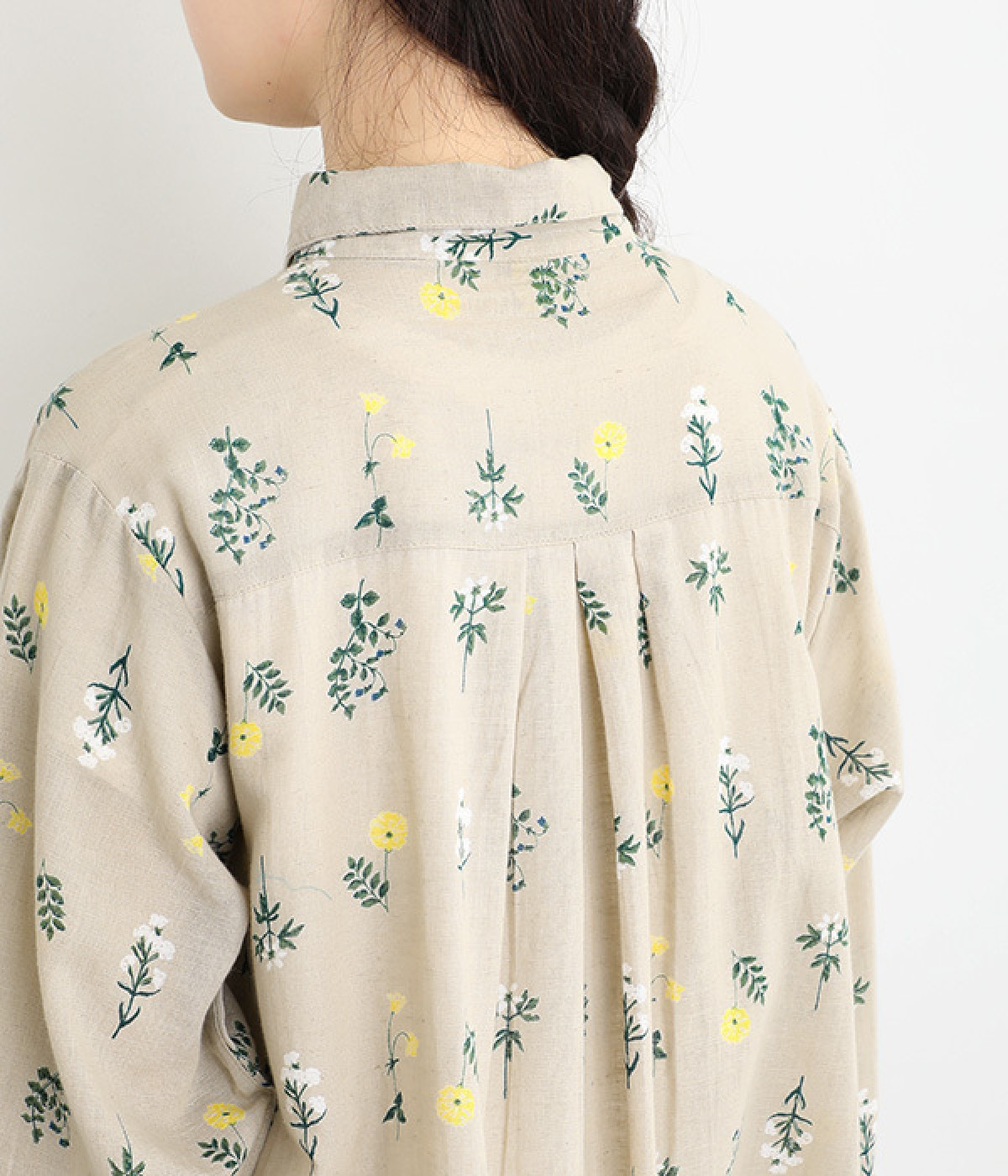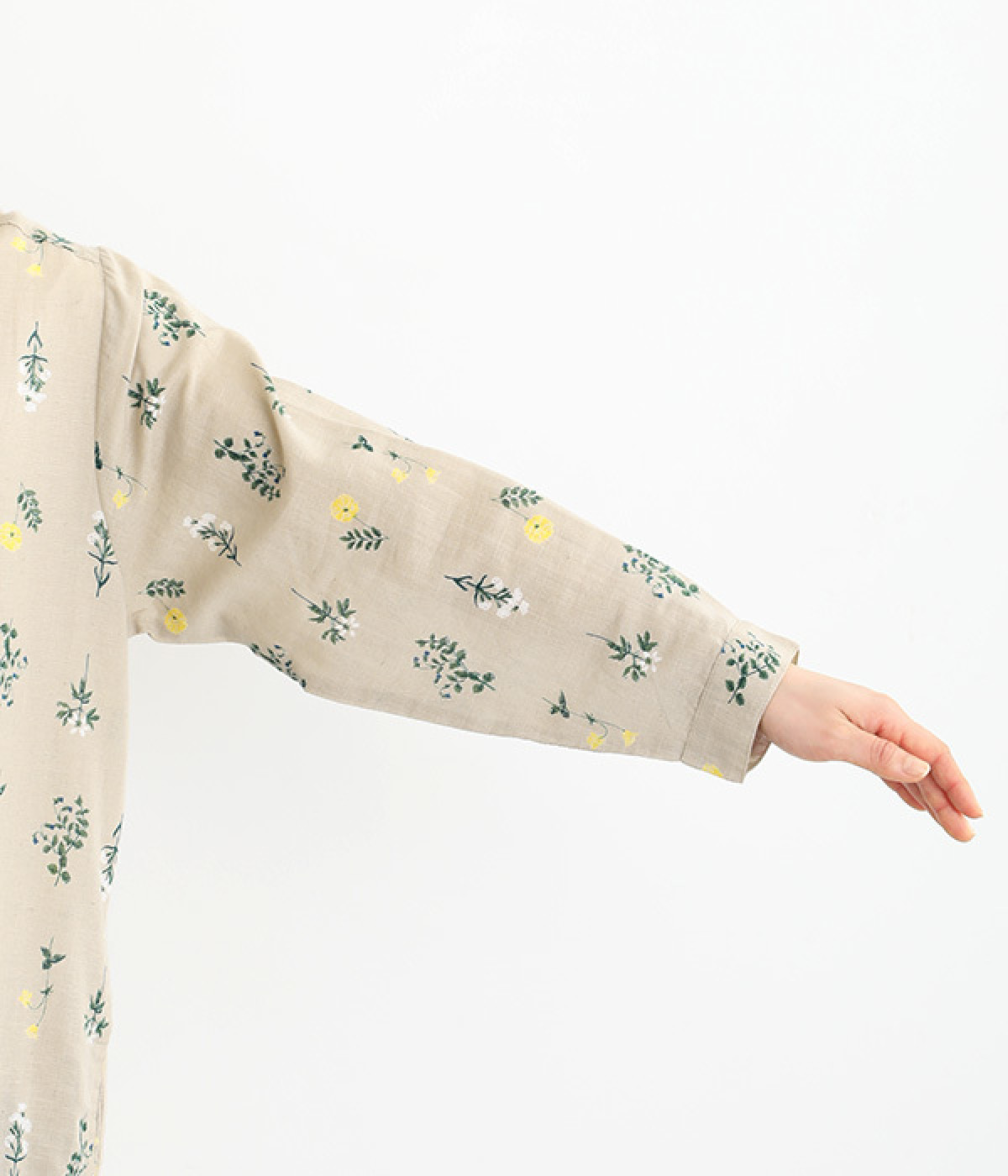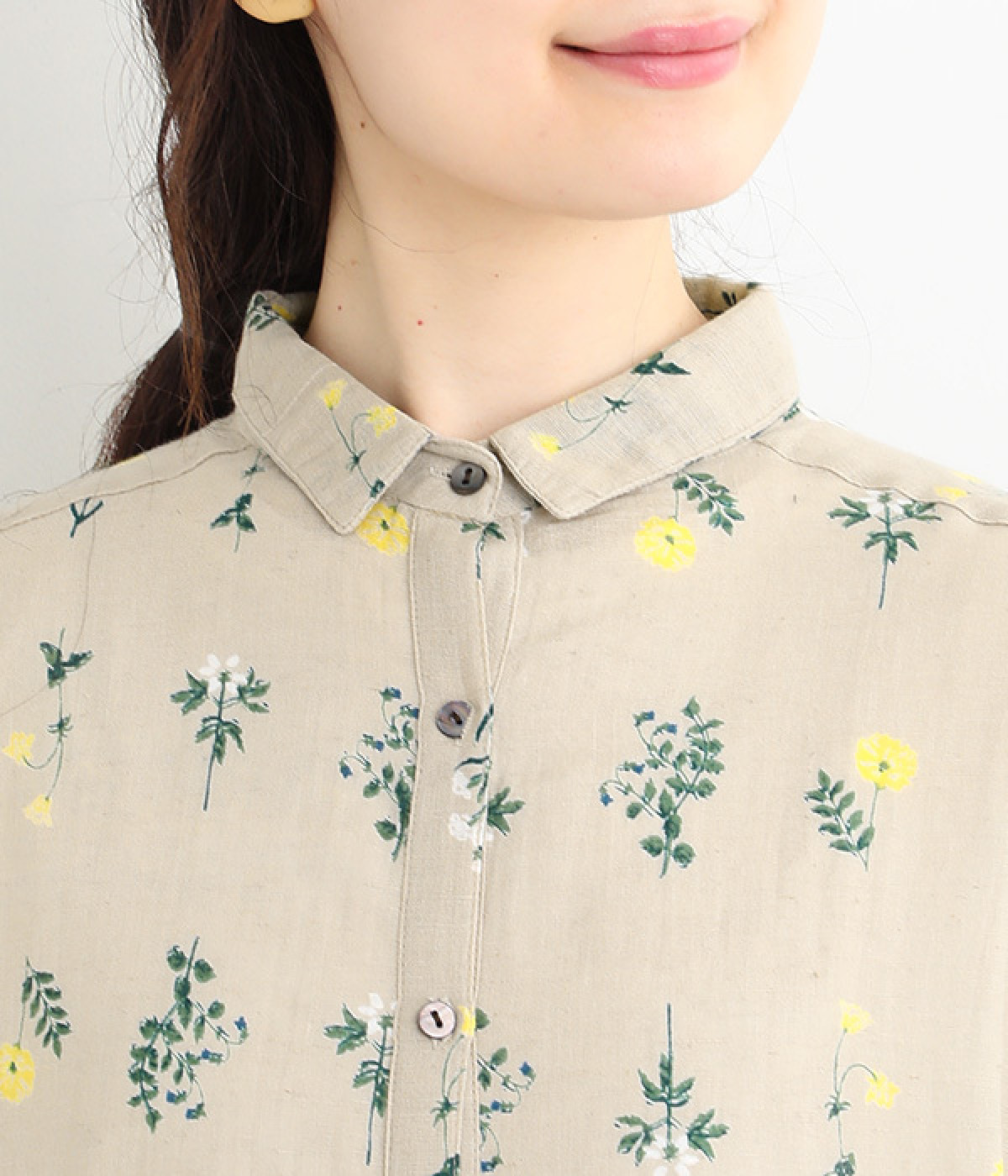 リアルに描いた草花を余白を持たせてふんわり並べた柄生地をセレクトしました。綿麻の風合いある生地でやさしい空気感をまとえます。少し透け感があってあたたかな季節も軽やかに着こなせる生地感です。