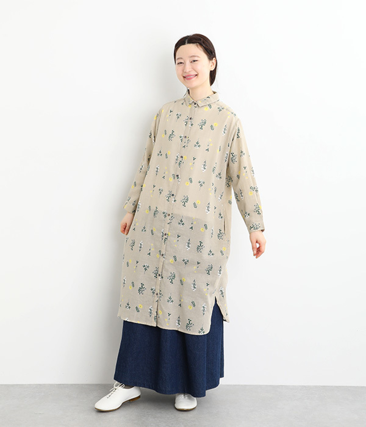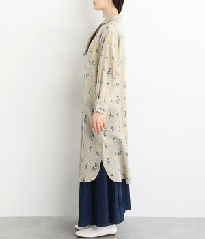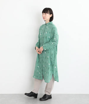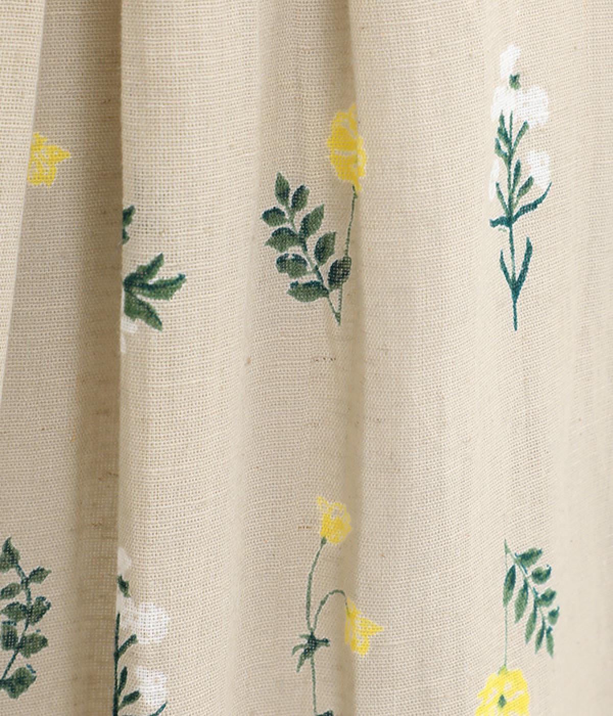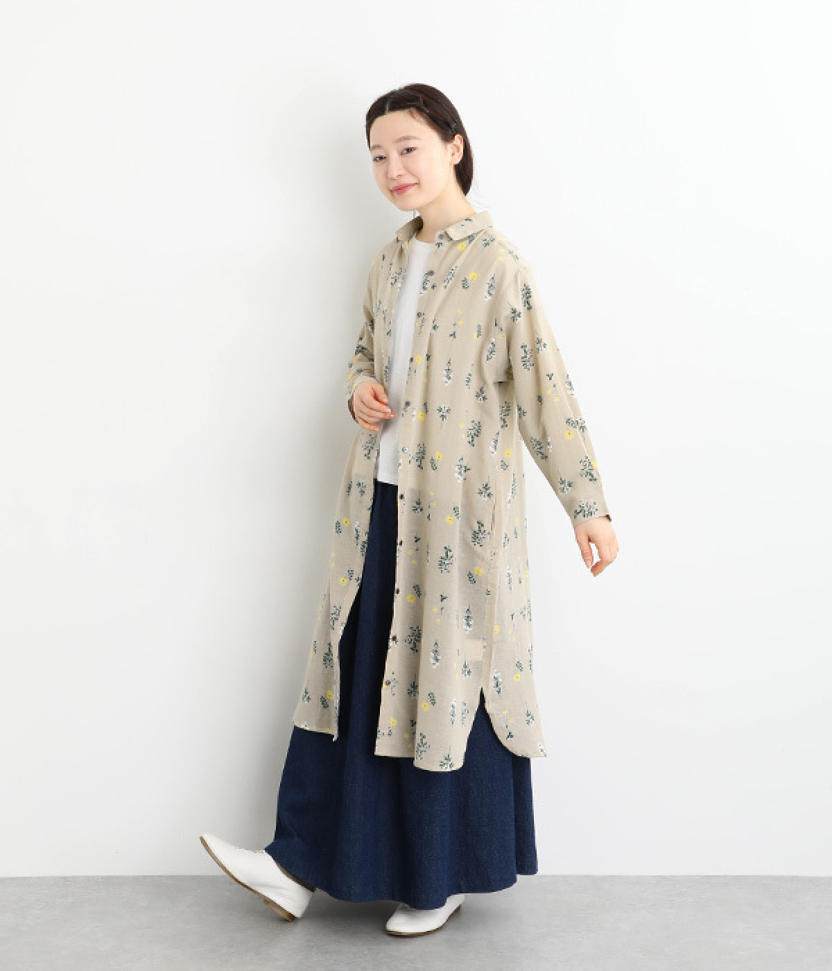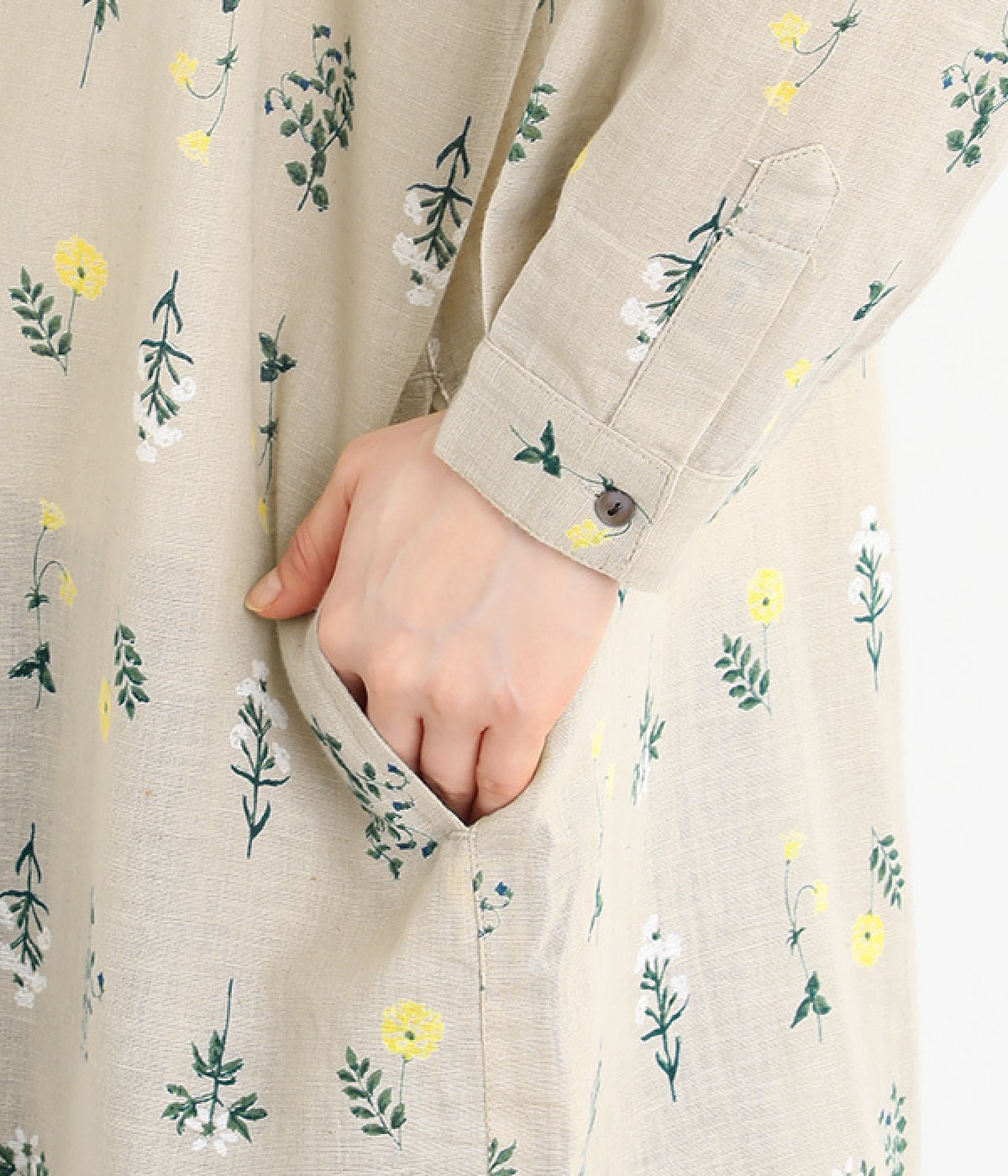 リアルに描いた草花を余白を持たせてふんわり並べた柄生地をセレクトしました。綿麻の風合いある生地でやさしい空気感をまとえます。少し透け感があってあたたかな季節も軽やかに着こなせる生地感です。