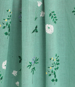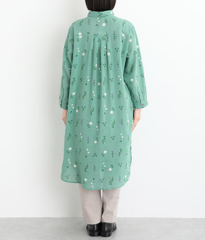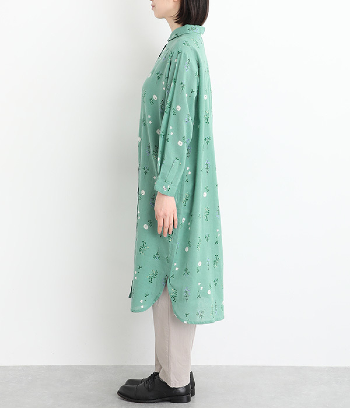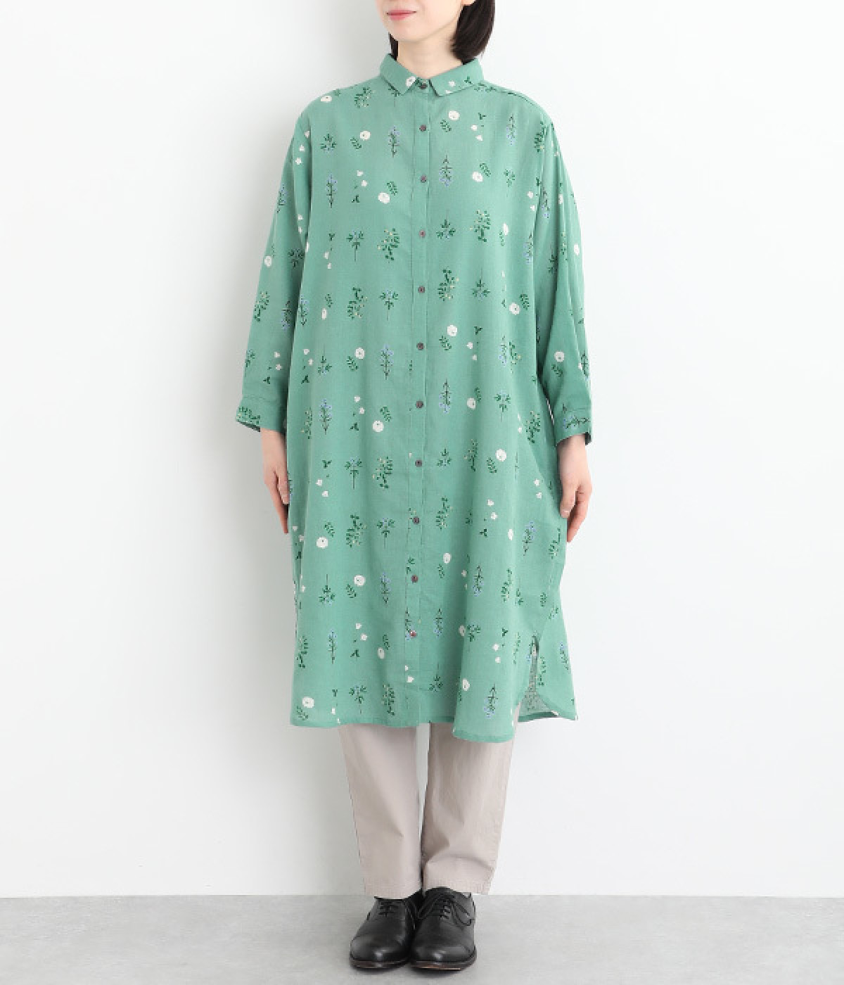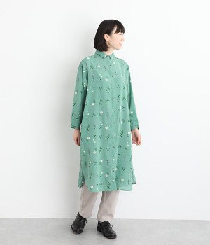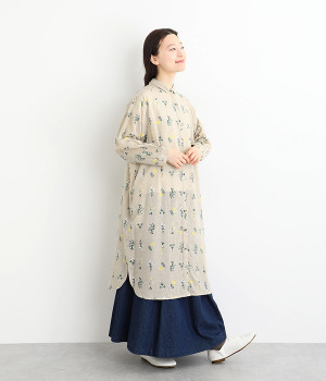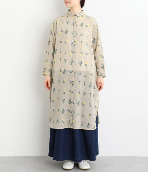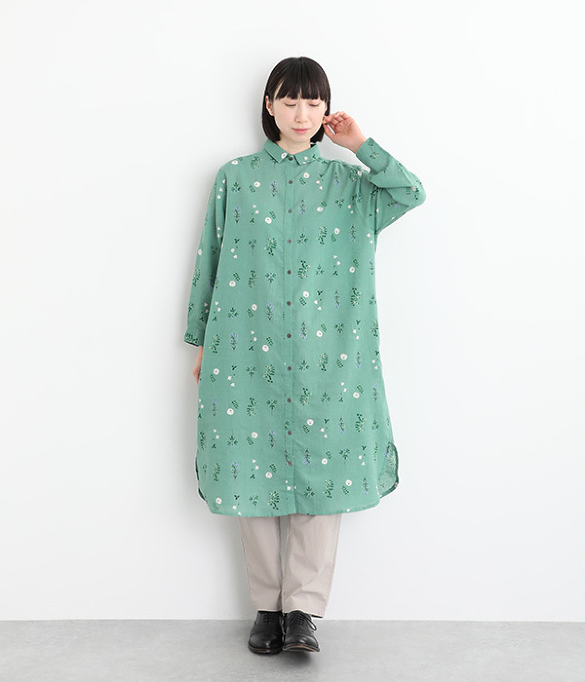 リアルに描いた草花を余白を持たせてふんわり並べた柄生地をセレクトしました。綿麻の風合いある生地でやさしい空気感をまとえます。少し透け感があってあたたかな季節も軽やかに着こなせる生地感です。