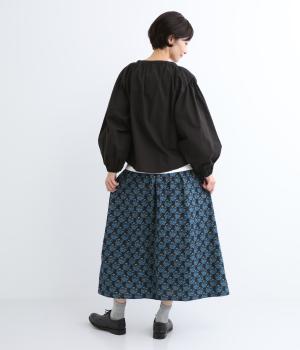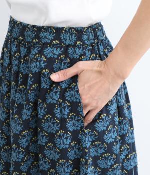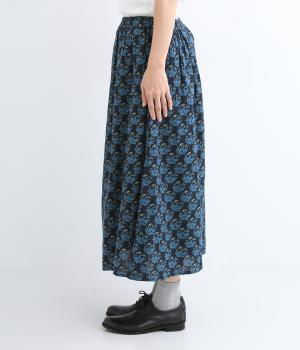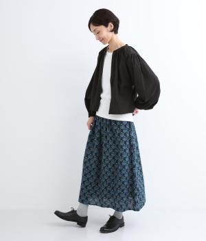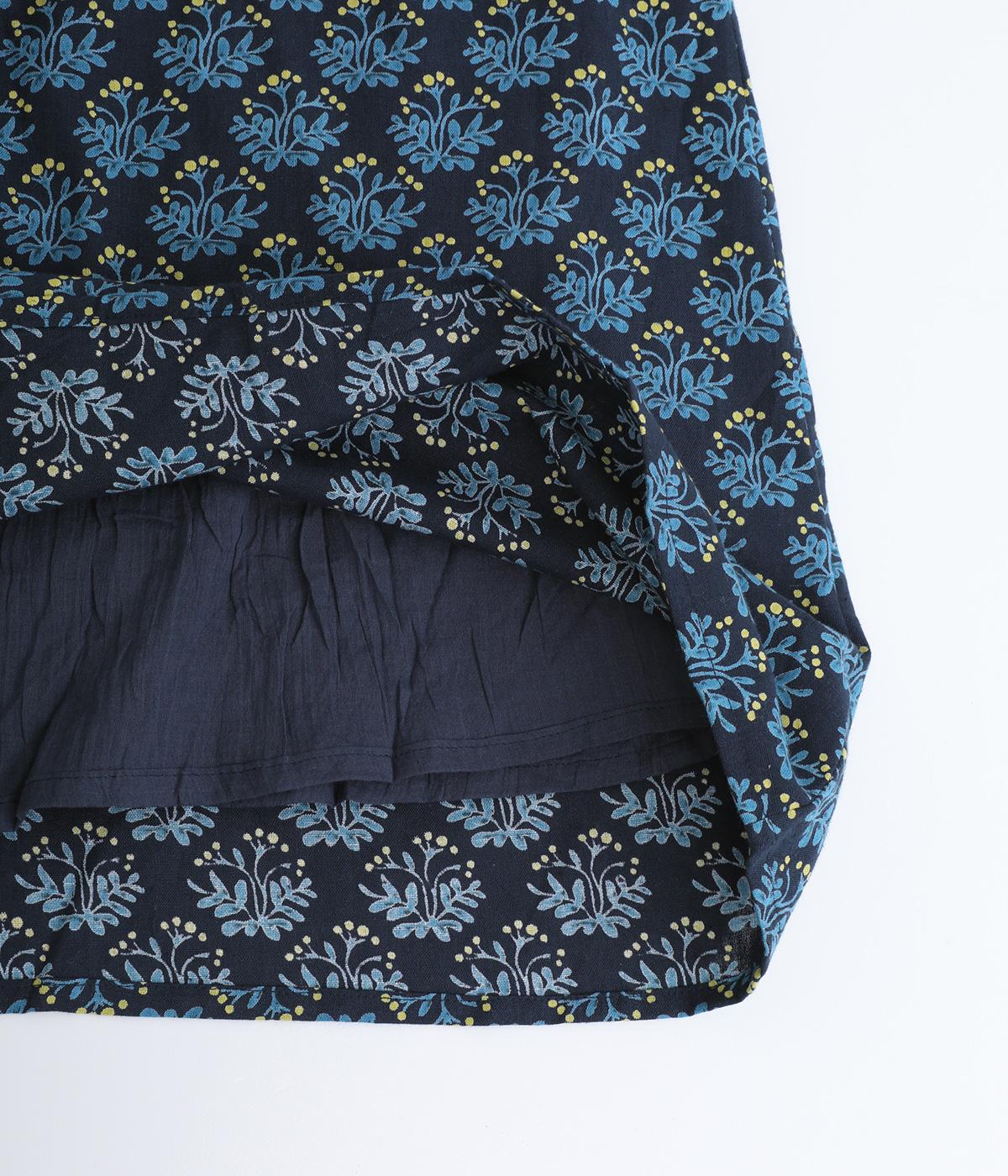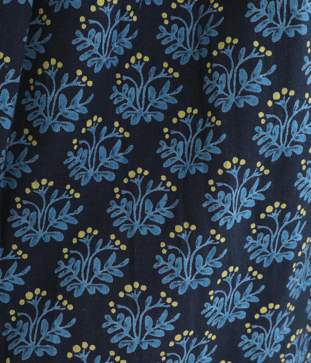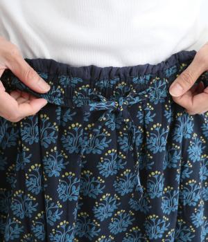 コットンのやわらかさは残しつつ、麻のシャリ感と清涼感をプラス。足さばきの良さをアップさせる軽やかな生地感です。小さな実が愛らしいチョークベリー柄をあしらっています。透け感をおさえる裏地つき。