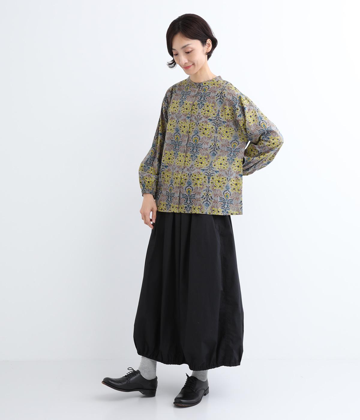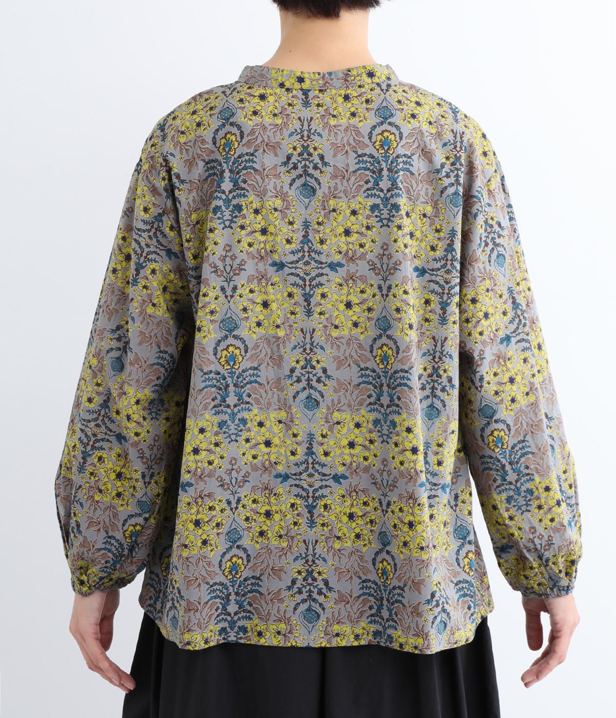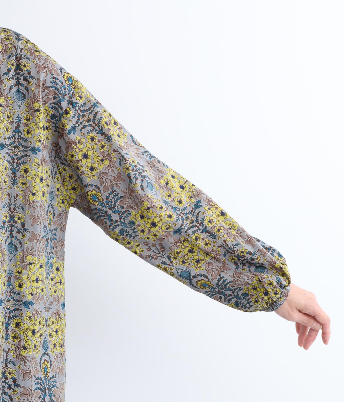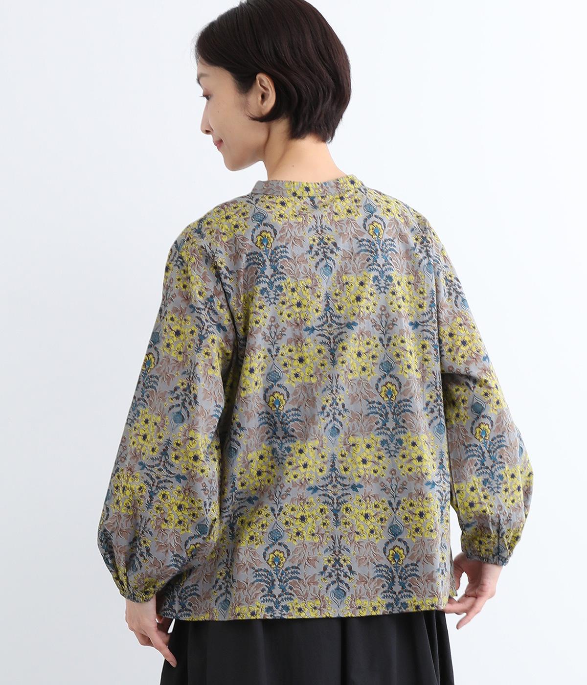 華やかながらも落ち着きのある、ヴィンテージな雰囲気をまとう総柄ブラウス。ゆったりとさせた身頃と袖が体のラインをカバーしてくれます。袖口はゴムできゅっと絞り、ふくらみのある愛らしいシルエットに。前を開けてカーディガンのように着こなすのもおすすめです。