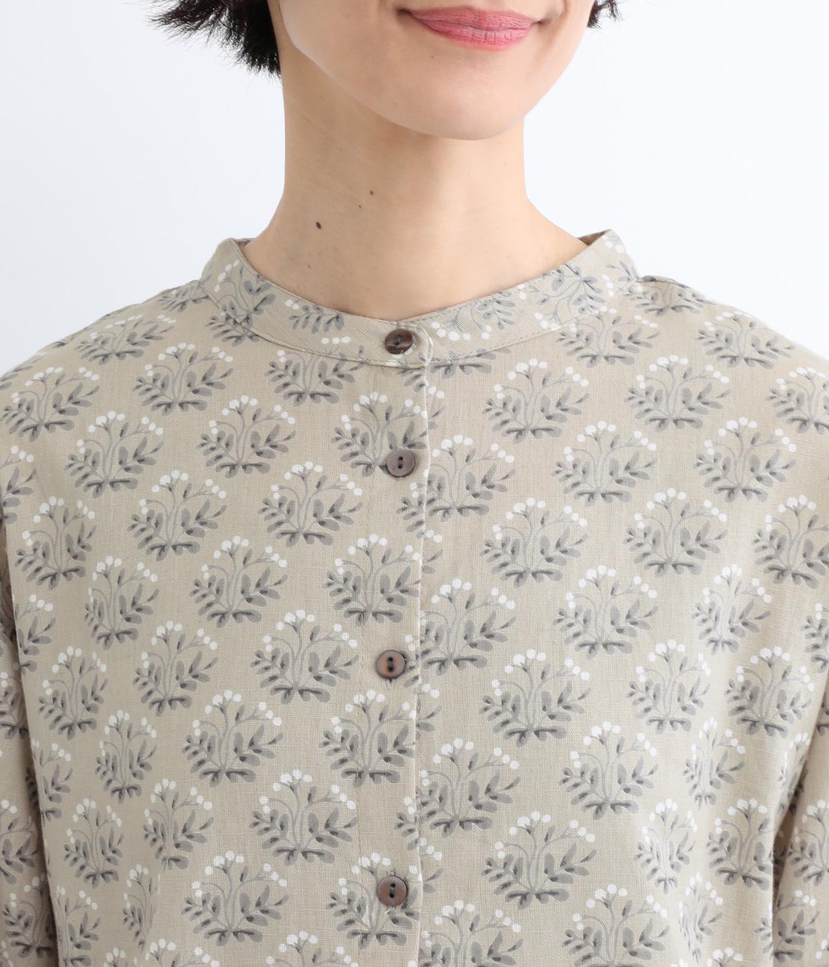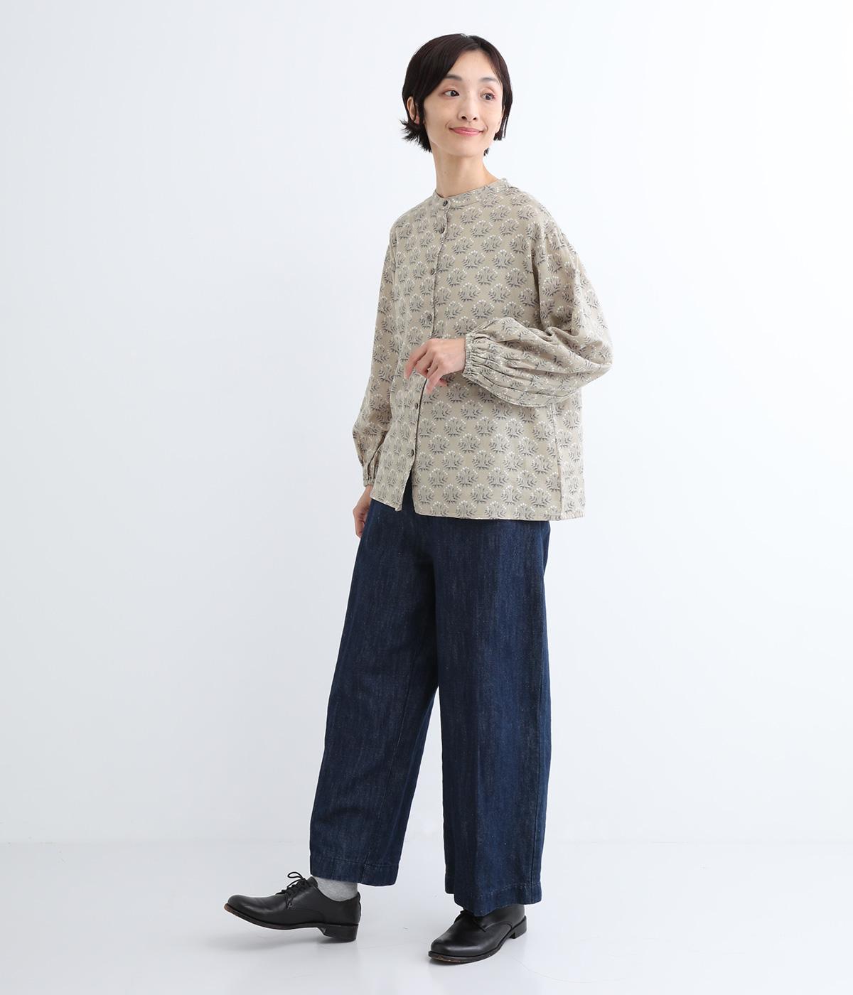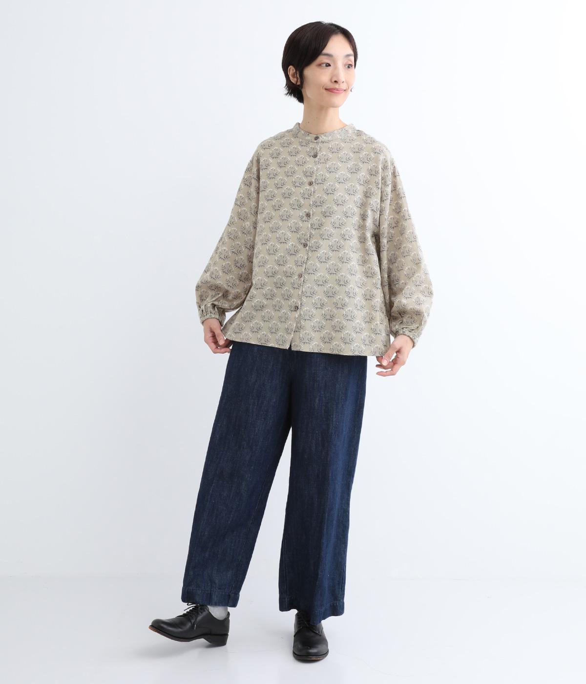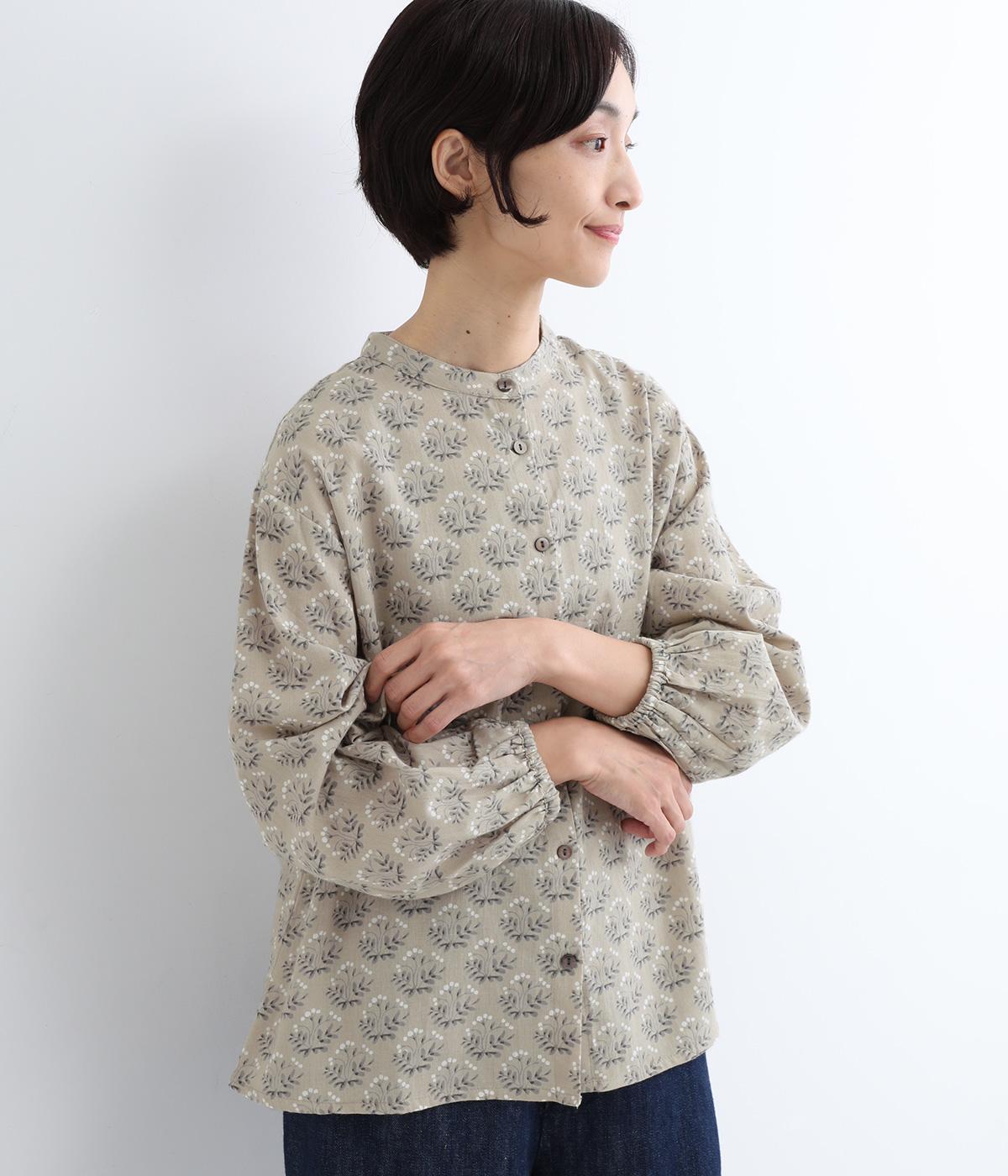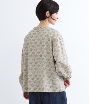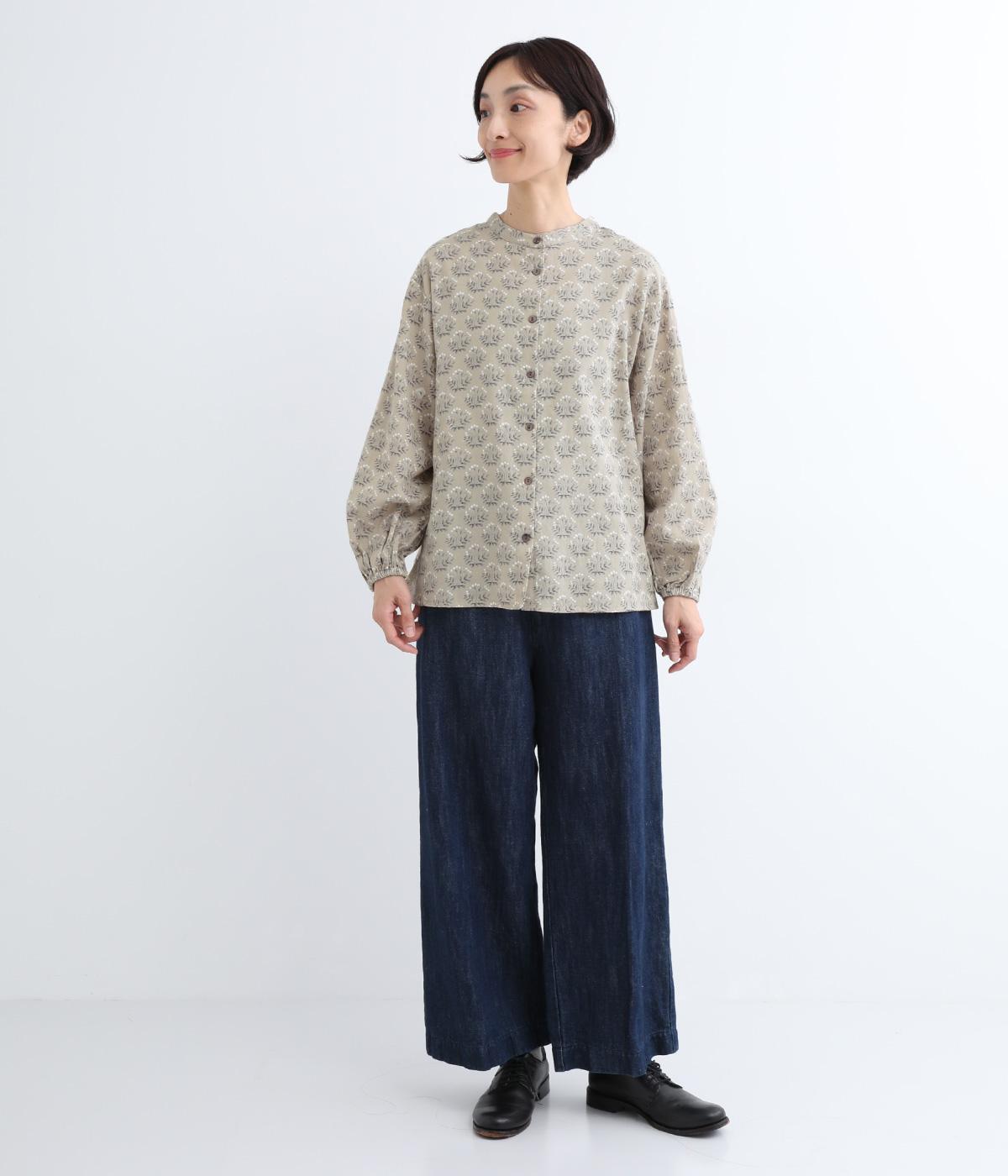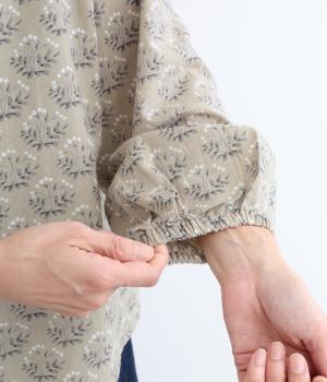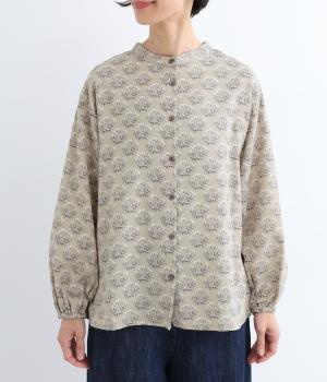 生地のナチュラルな風合いと、柄のやさしい雰囲気が絶妙にマッチしたブラウス。袖口にゴムを通し、ふっくらとさせた袖のシルエットが素敵です。首元のバンドカラーがきちんと感をプラス。前を開けて、羽織りとしてさらっと着こなすのもおすすめです。