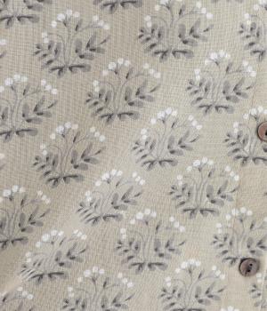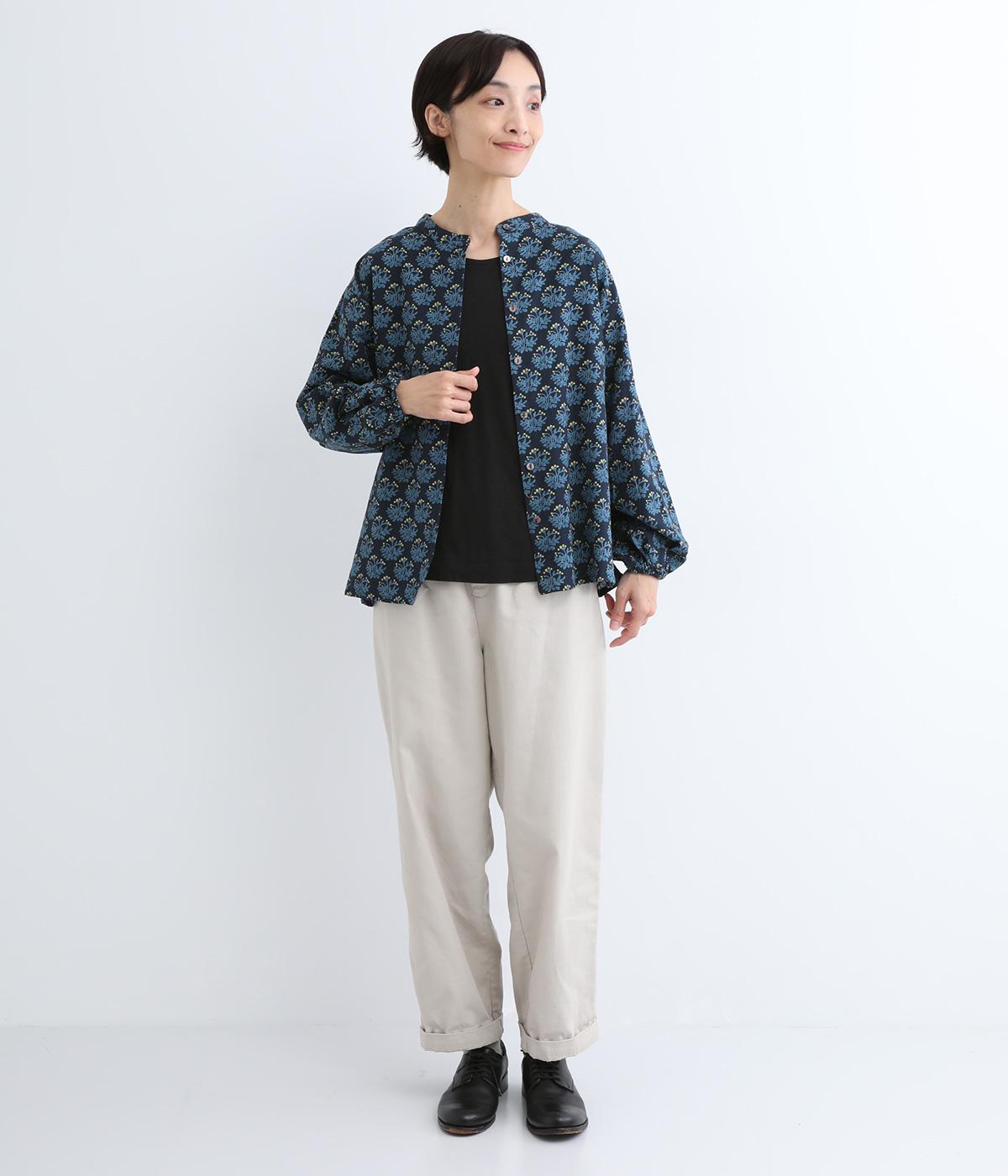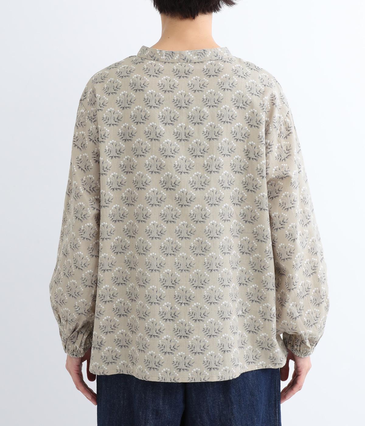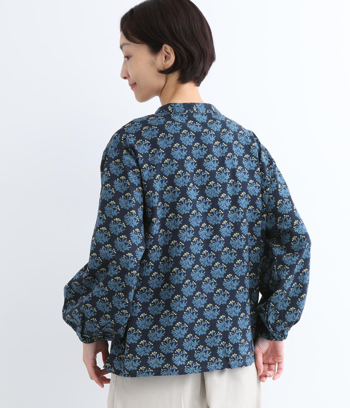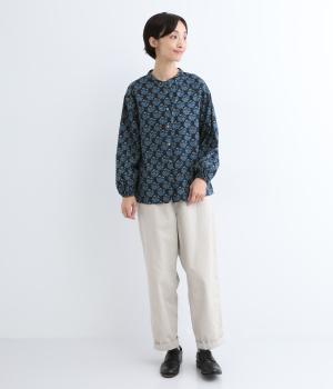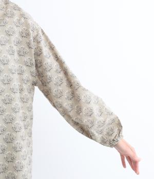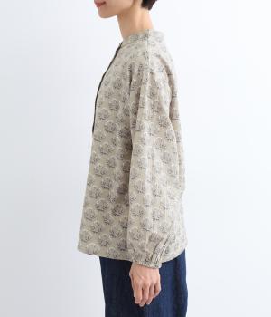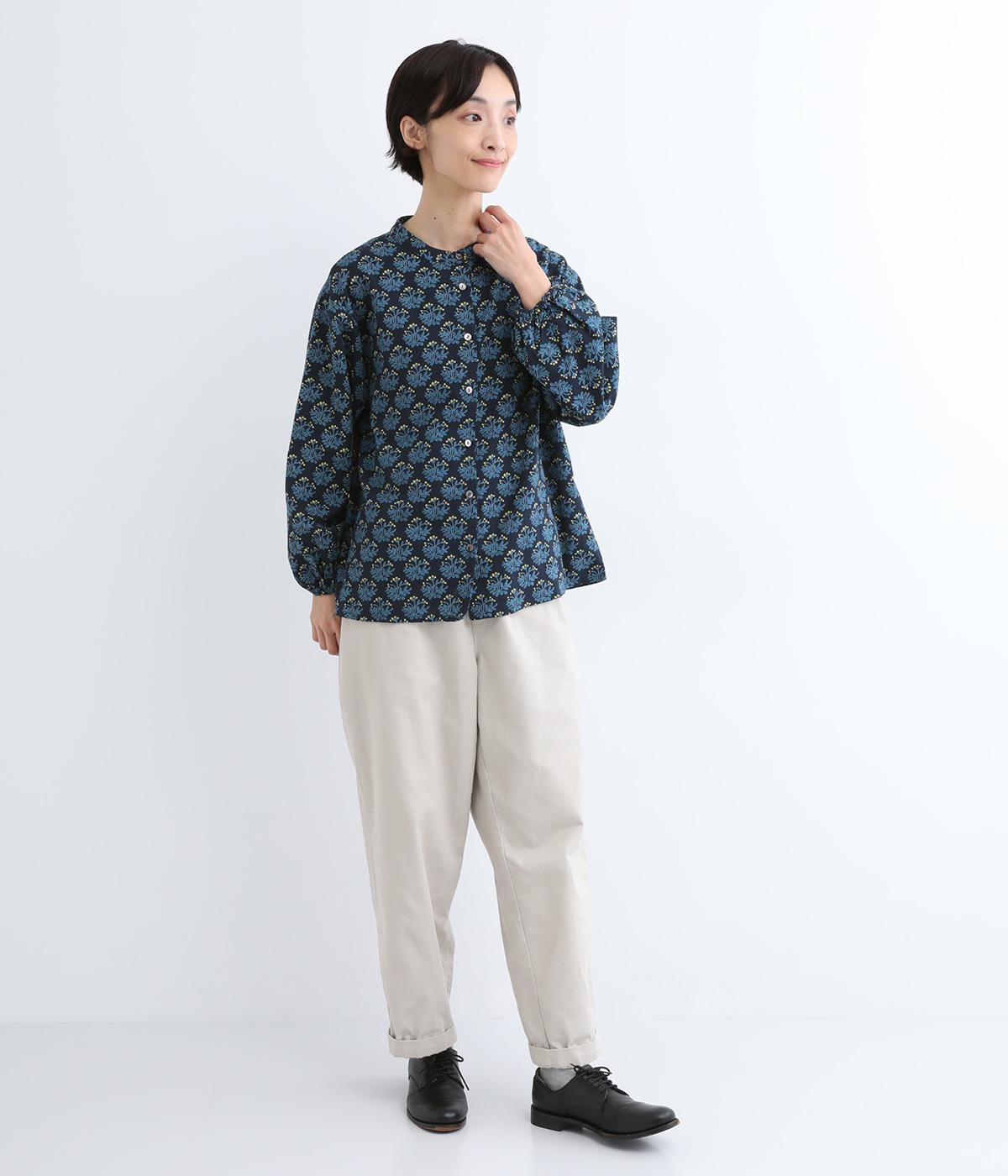 生地のナチュラルな風合いと、柄のやさしい雰囲気が絶妙にマッチしたブラウス。袖口にゴムを通し、ふっくらとさせた袖のシルエットが素敵です。首元のバンドカラーがきちんと感をプラス。前を開けて、羽織りとしてさらっと着こなすのもおすすめです。