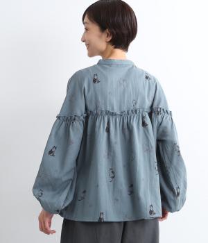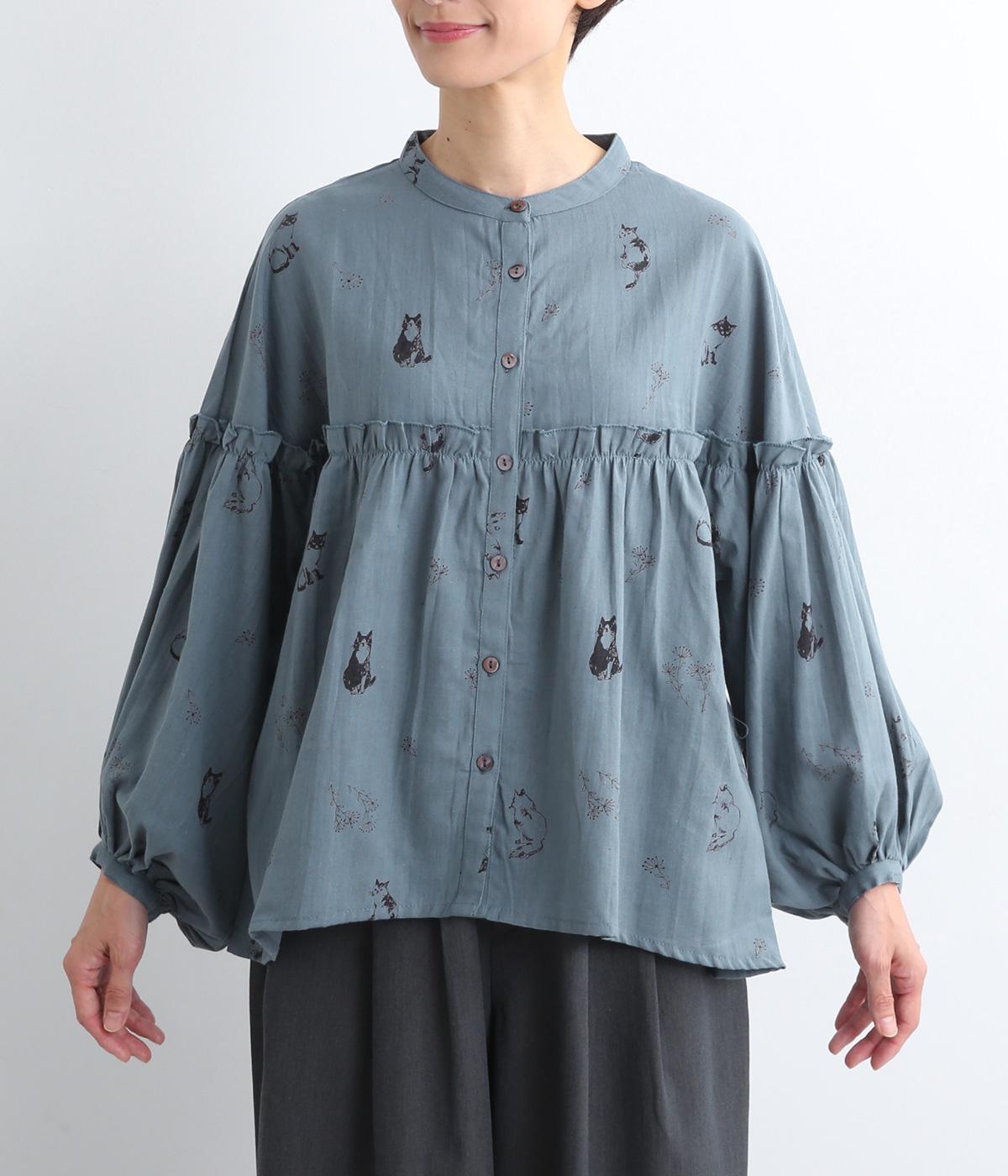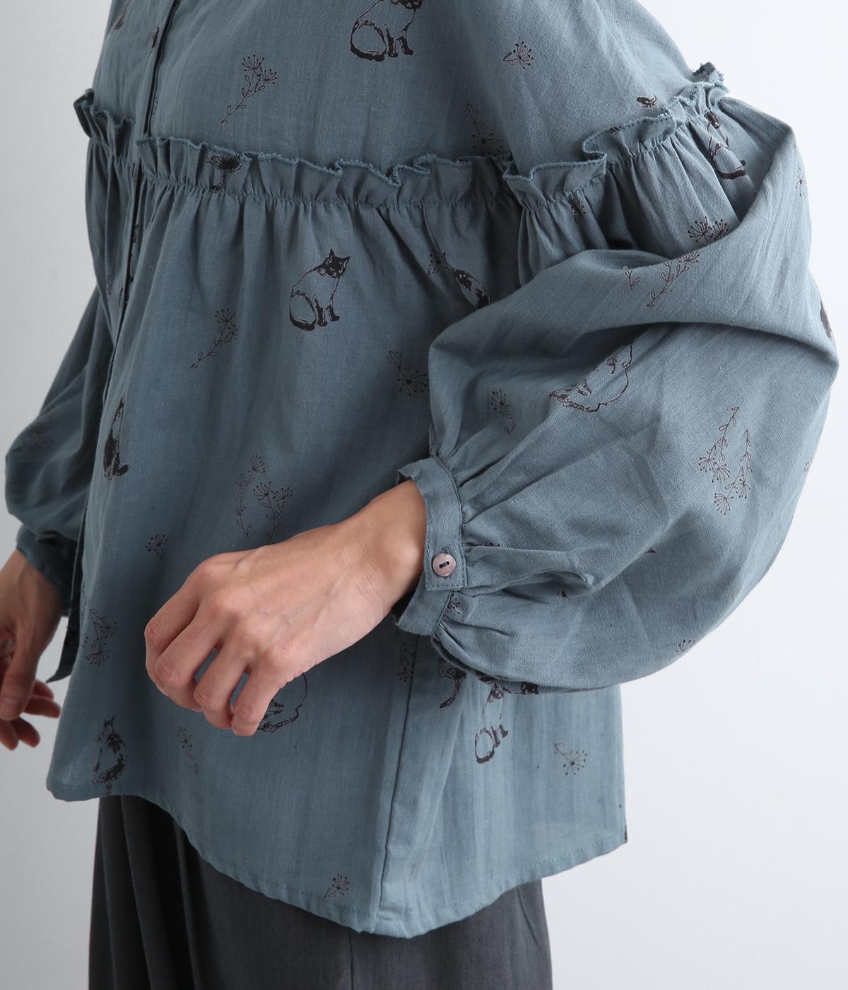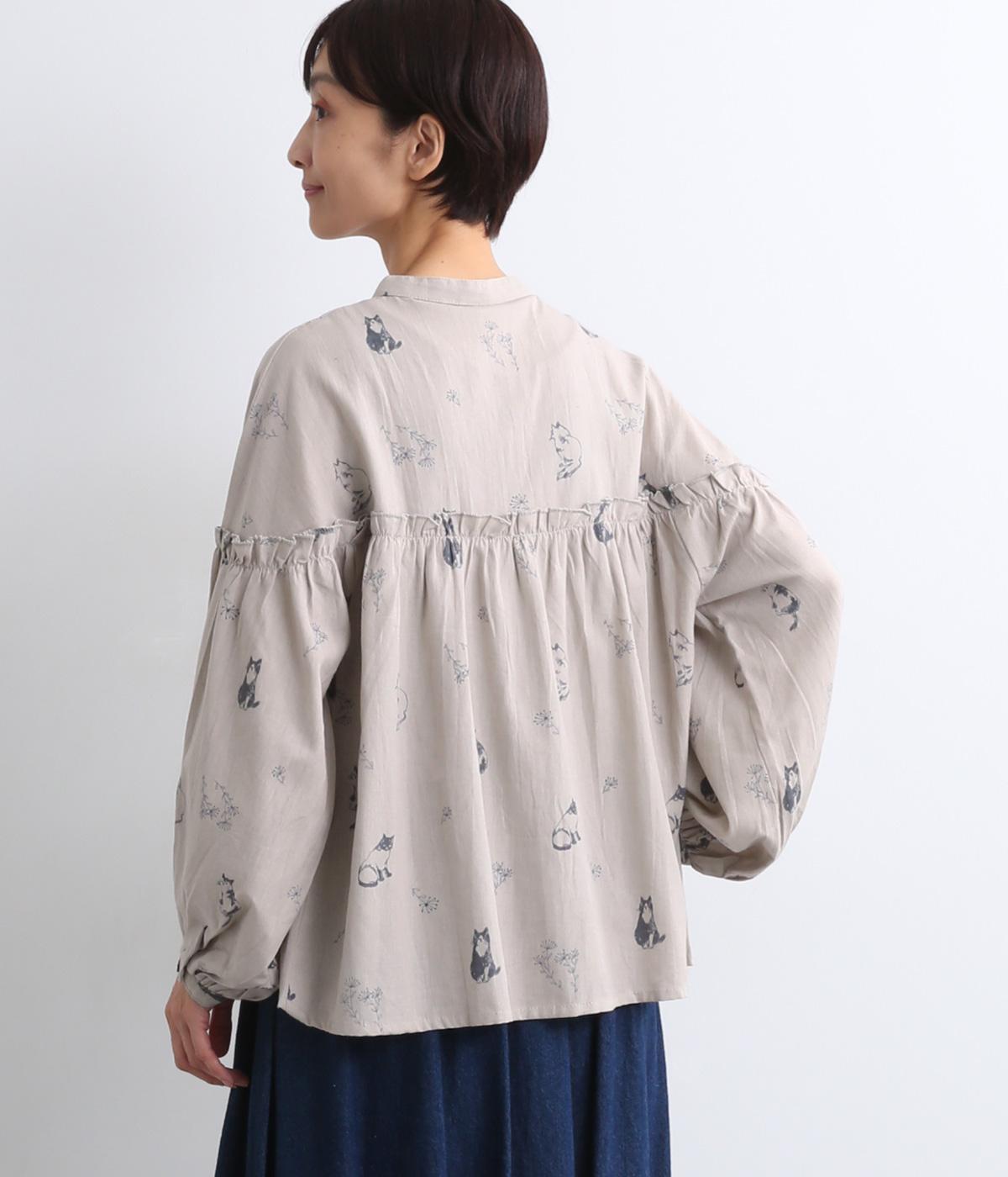 ネコとフラワーをモチーフにしたプリントが主役のブラウスです。ぐるりと一周フリルをあしらって、大人かわいいアクセントを加えています。ふんわりとしたボリューミーな袖もポイントに。