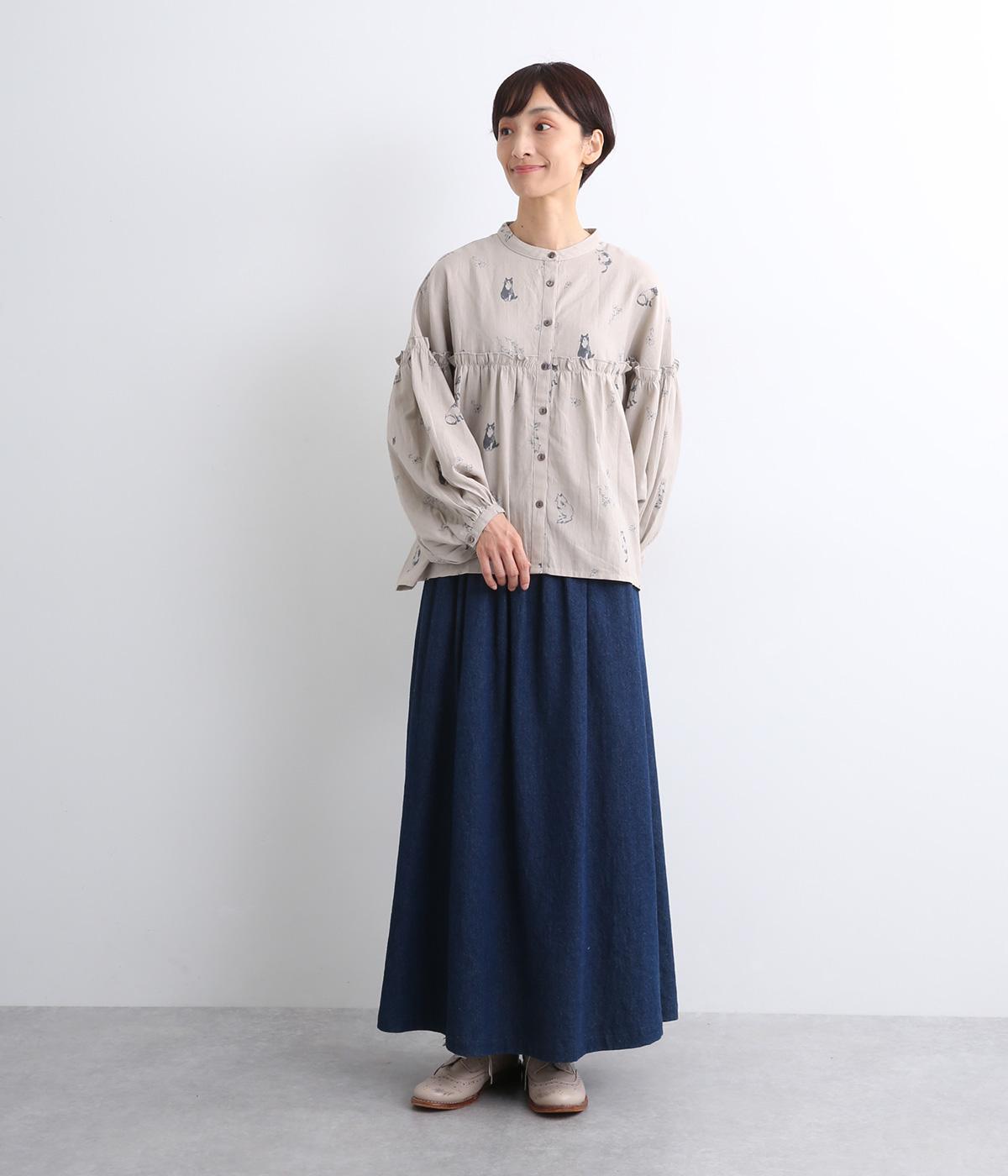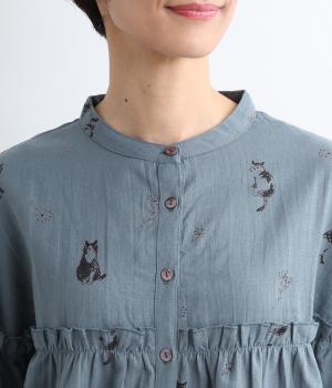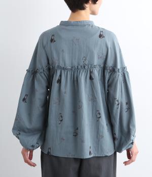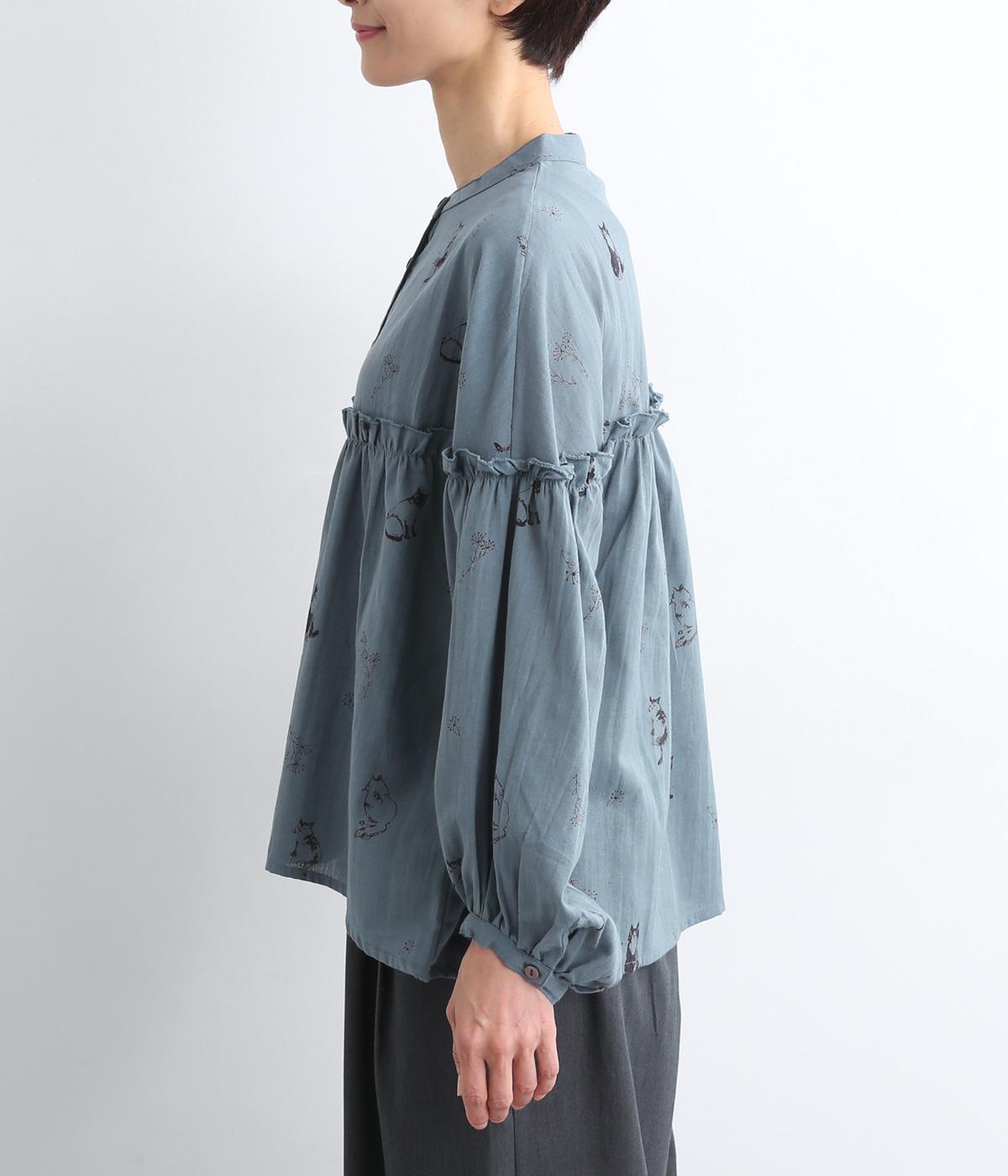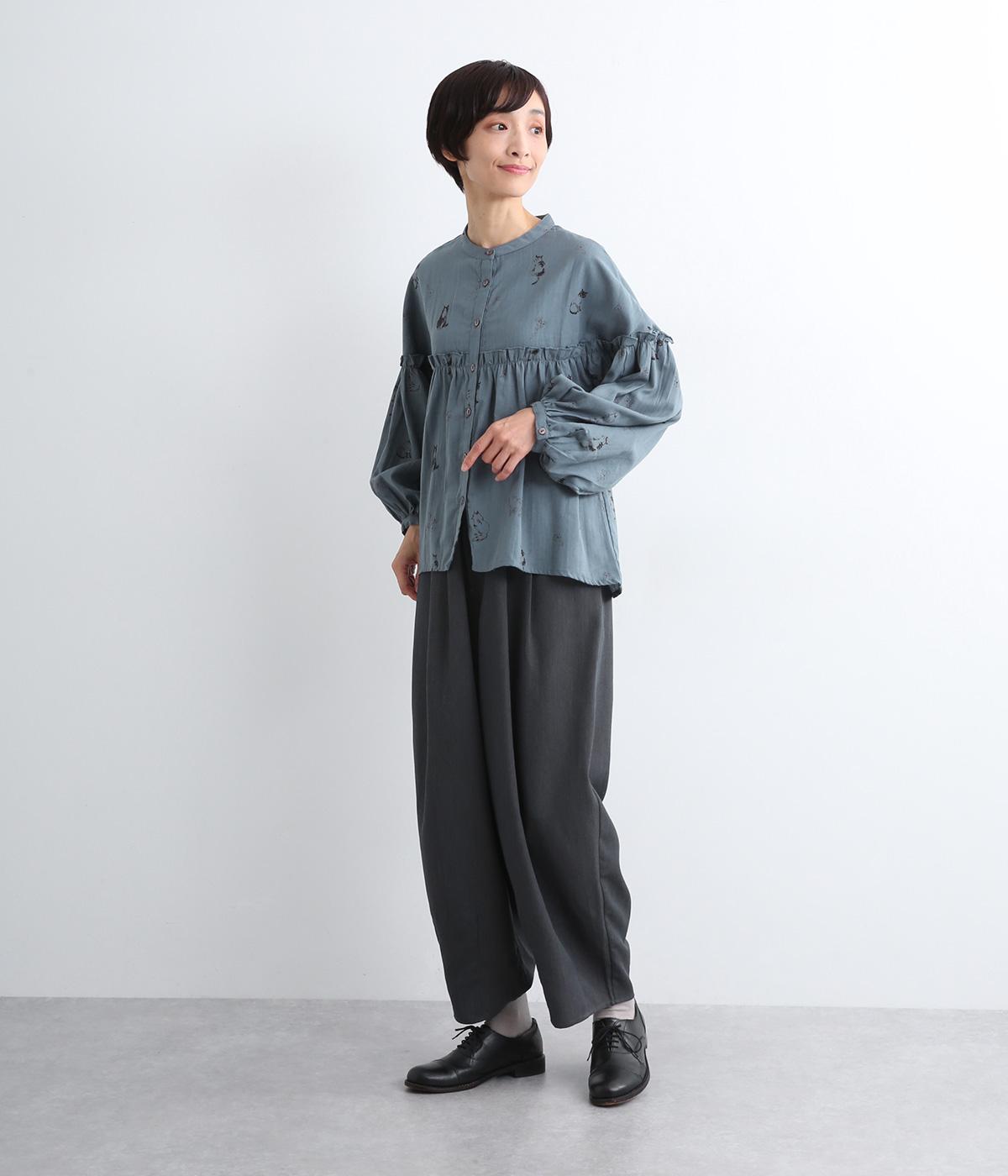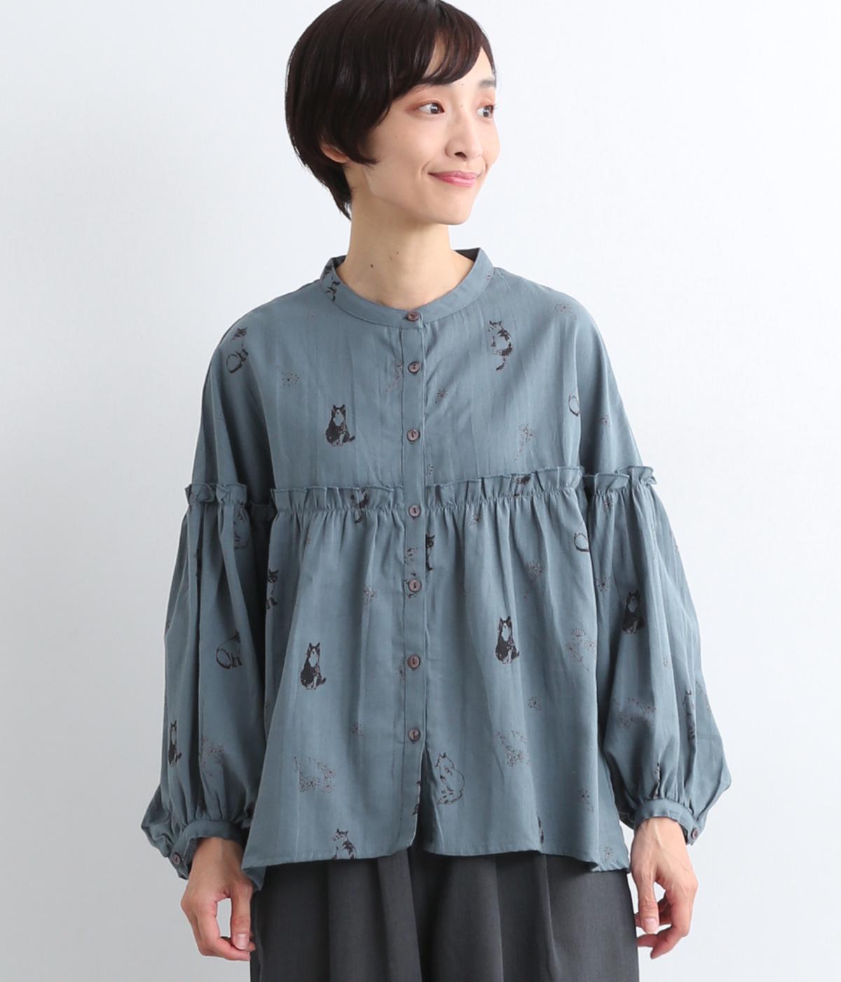 ネコとフラワーをモチーフにしたプリントが主役のブラウスです。ぐるりと一周フリルをあしらって、大人かわいいアクセントを加えています。ふんわりとしたボリューミーな袖もポイントに。