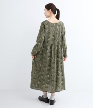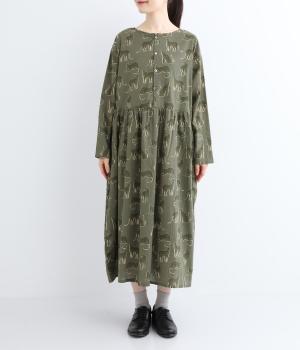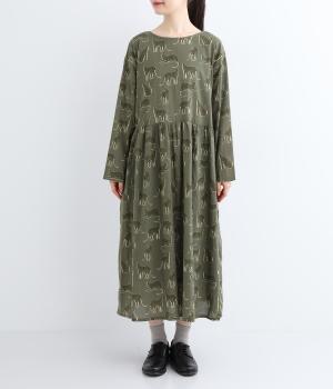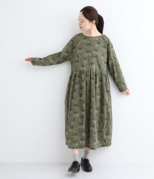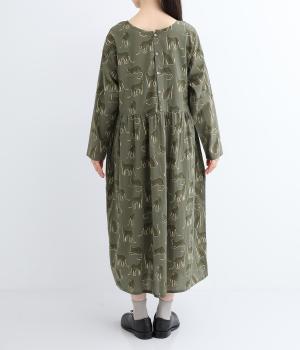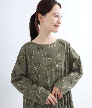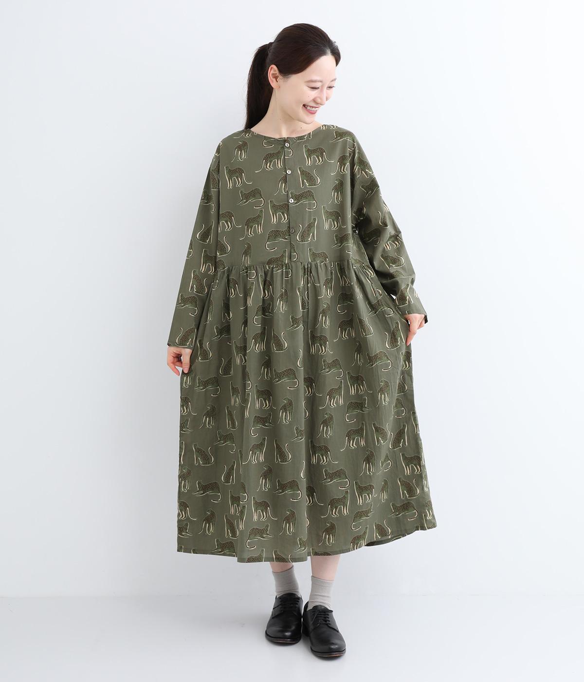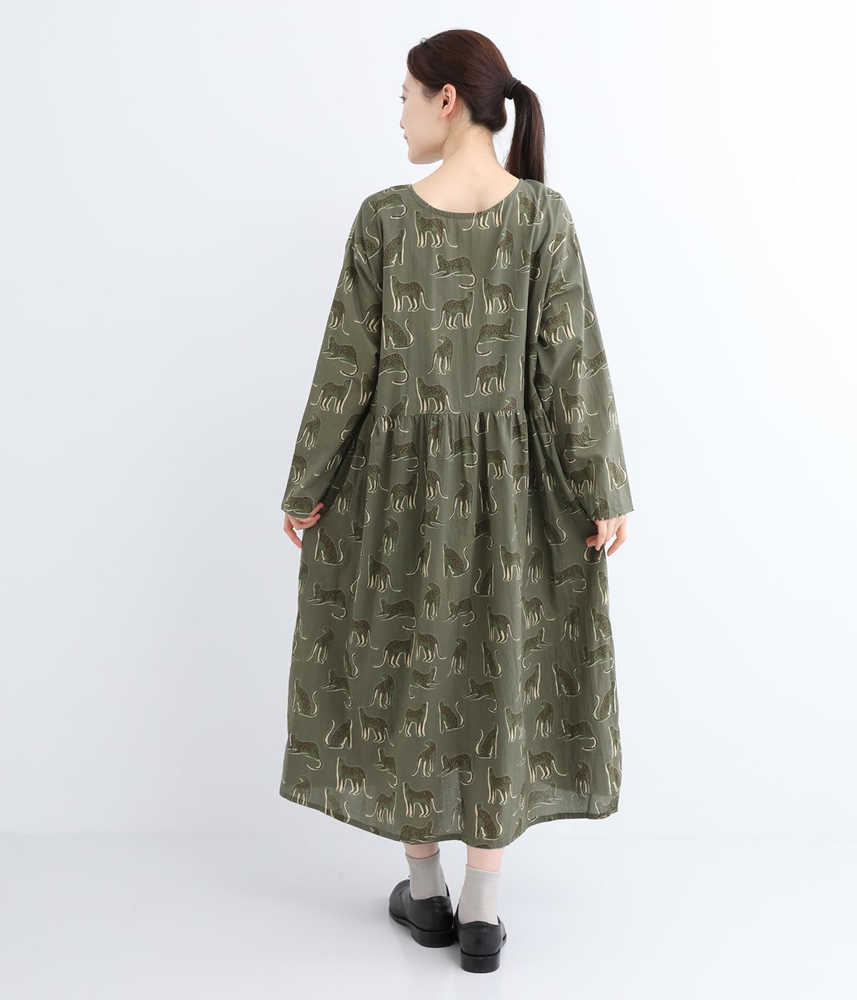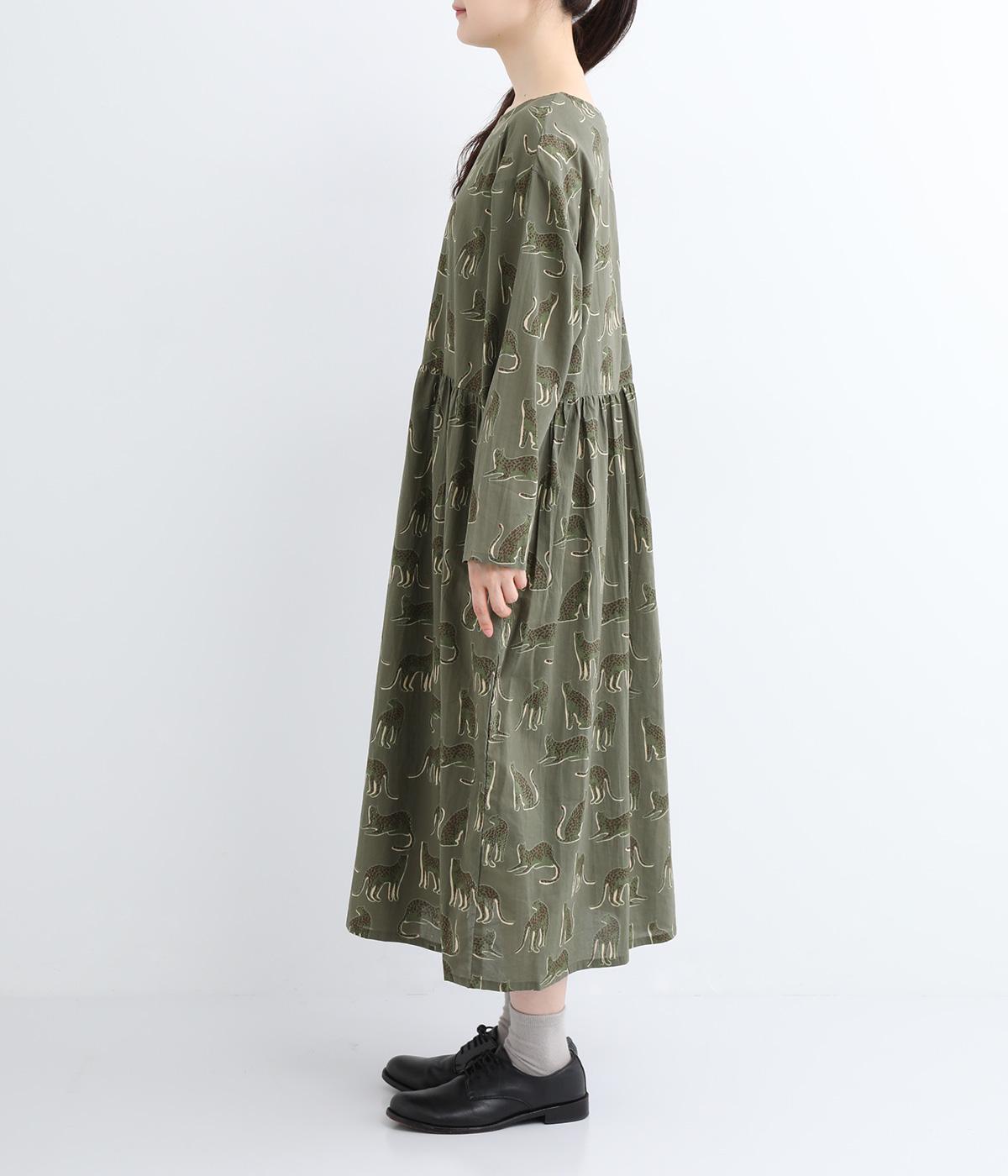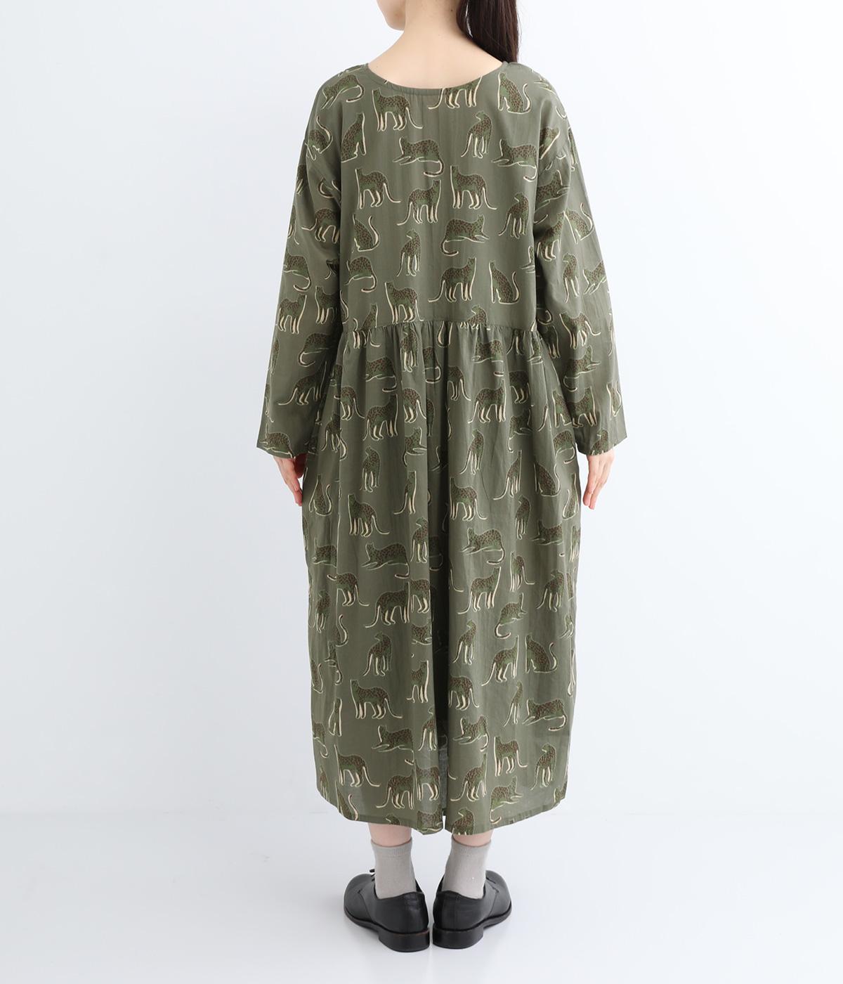 ヒョウのキリっとした表情が癖になる、ユニークな総柄を主役にしたワンピース。シックなカラーで子どもっぽくならないのがうれしいポイントです。前後どちらを前にしてもOKな2way仕様。浅めのネックラインとウエストのギャザーがフェミニンなムードを演出します。
