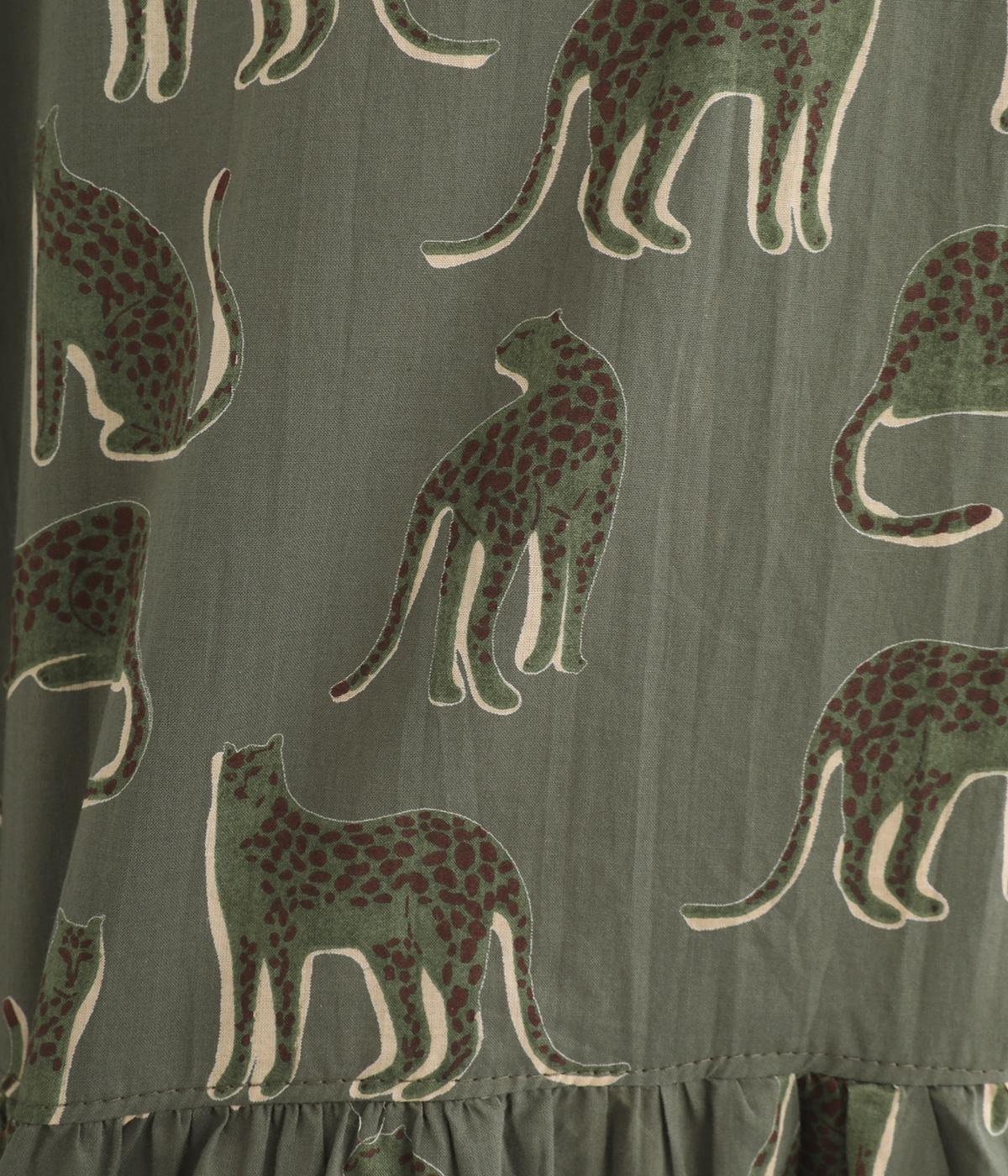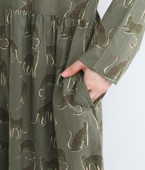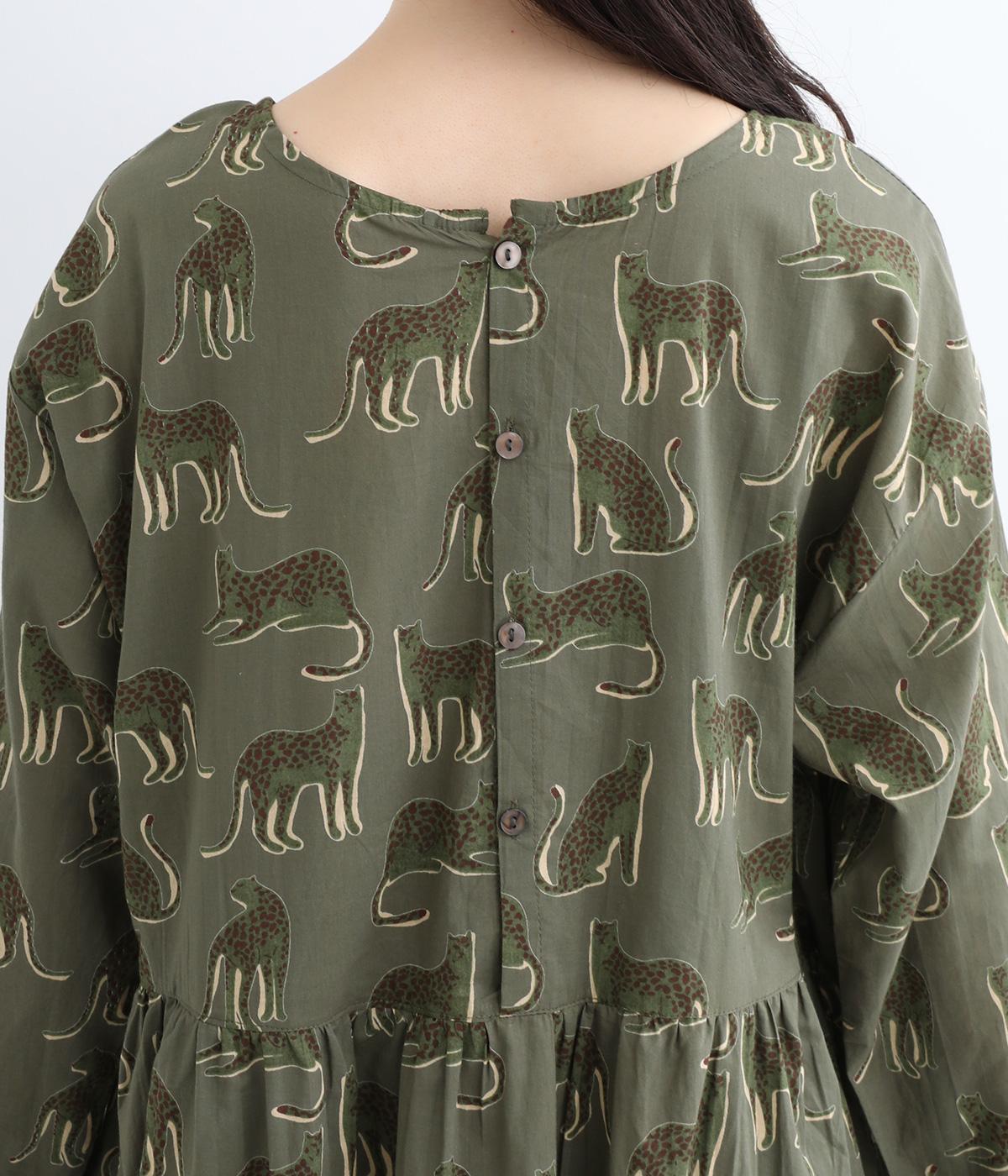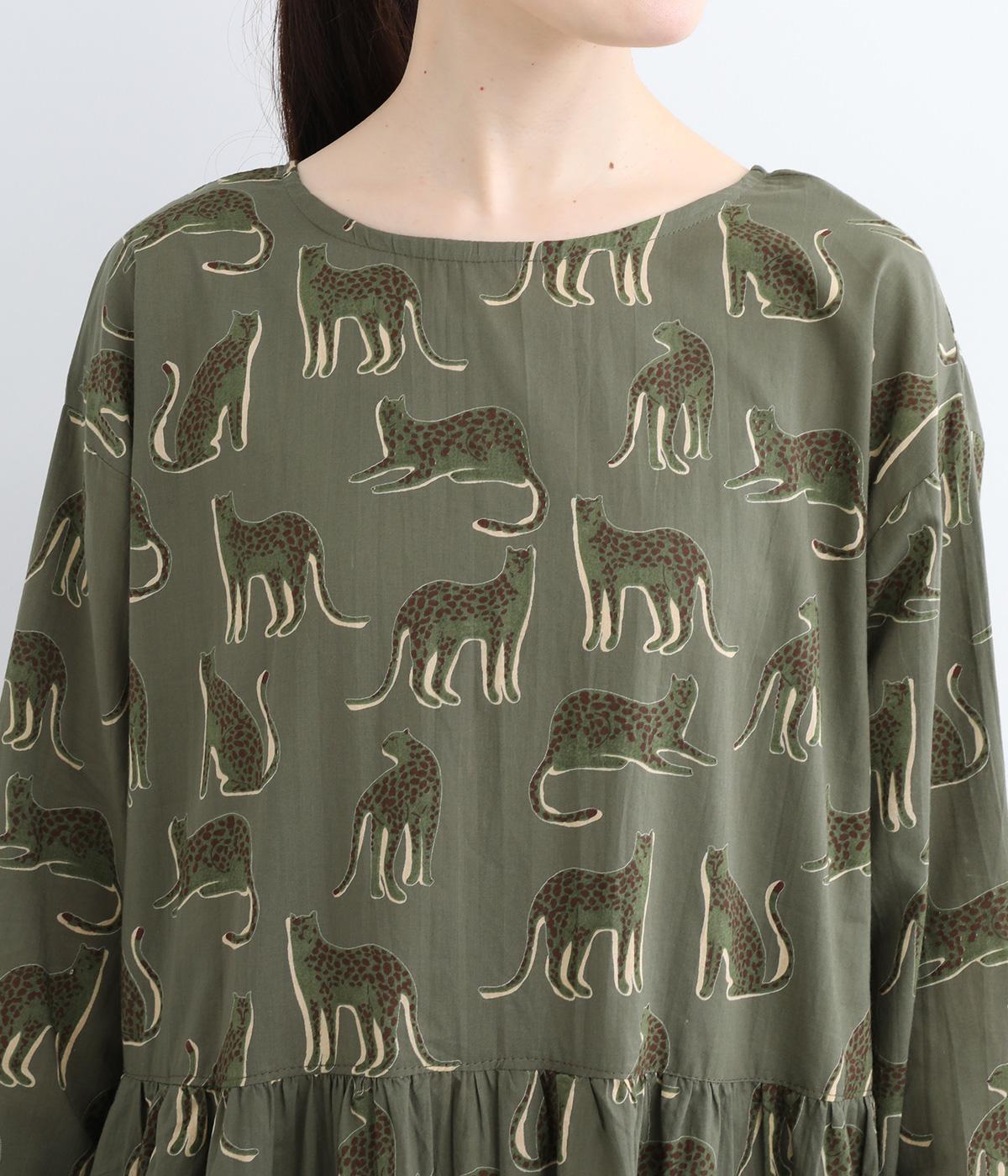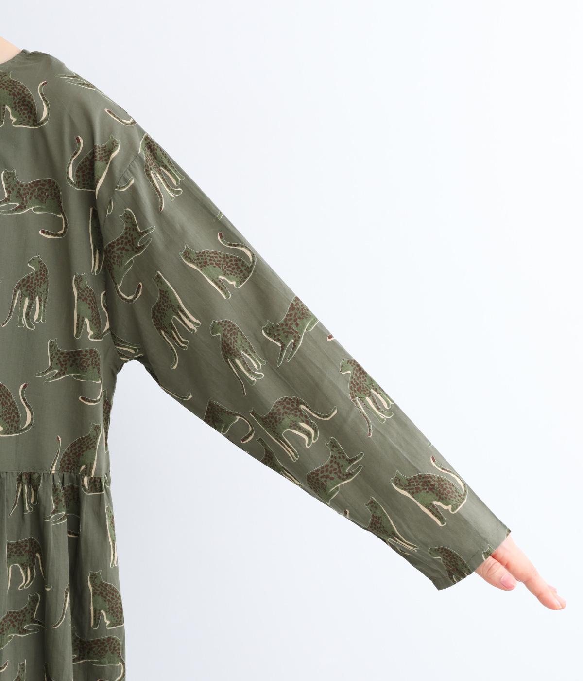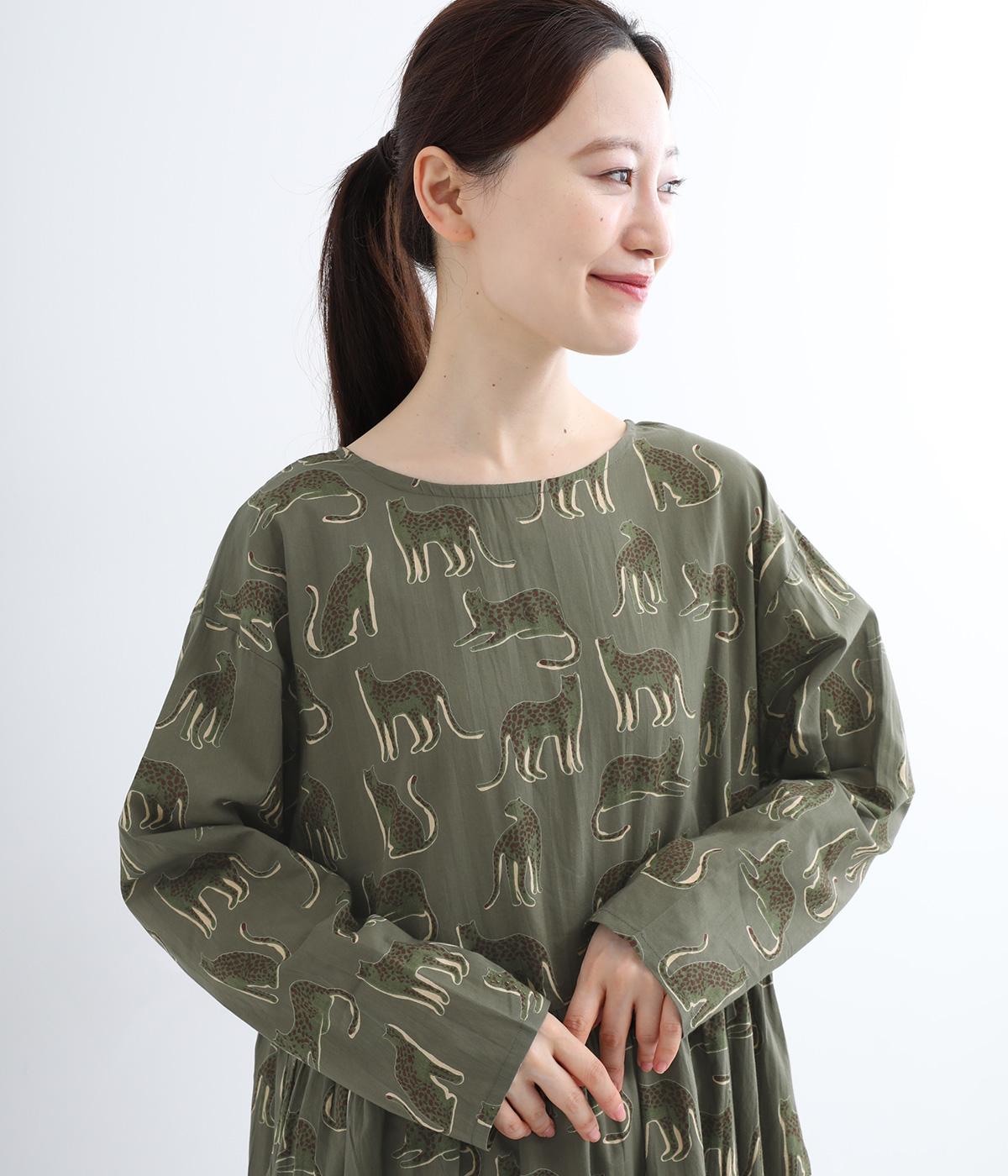 肌にまとわりつかないさらりとした肌触りが魅力の、軽やかな薄手のコットン生地。動物のヒョウをそのまま総柄にした、ユニークなヒョウ柄がポイントです。